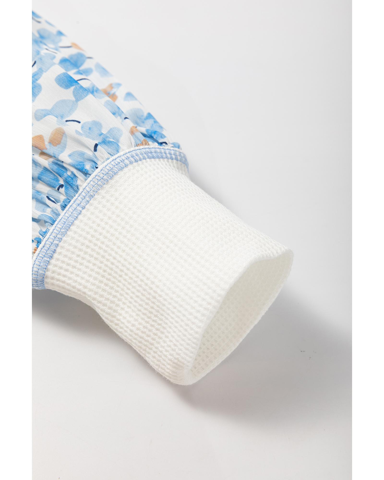 White Abstract Floral Patchwork Batwing Sleeve V Neck Blouse – L