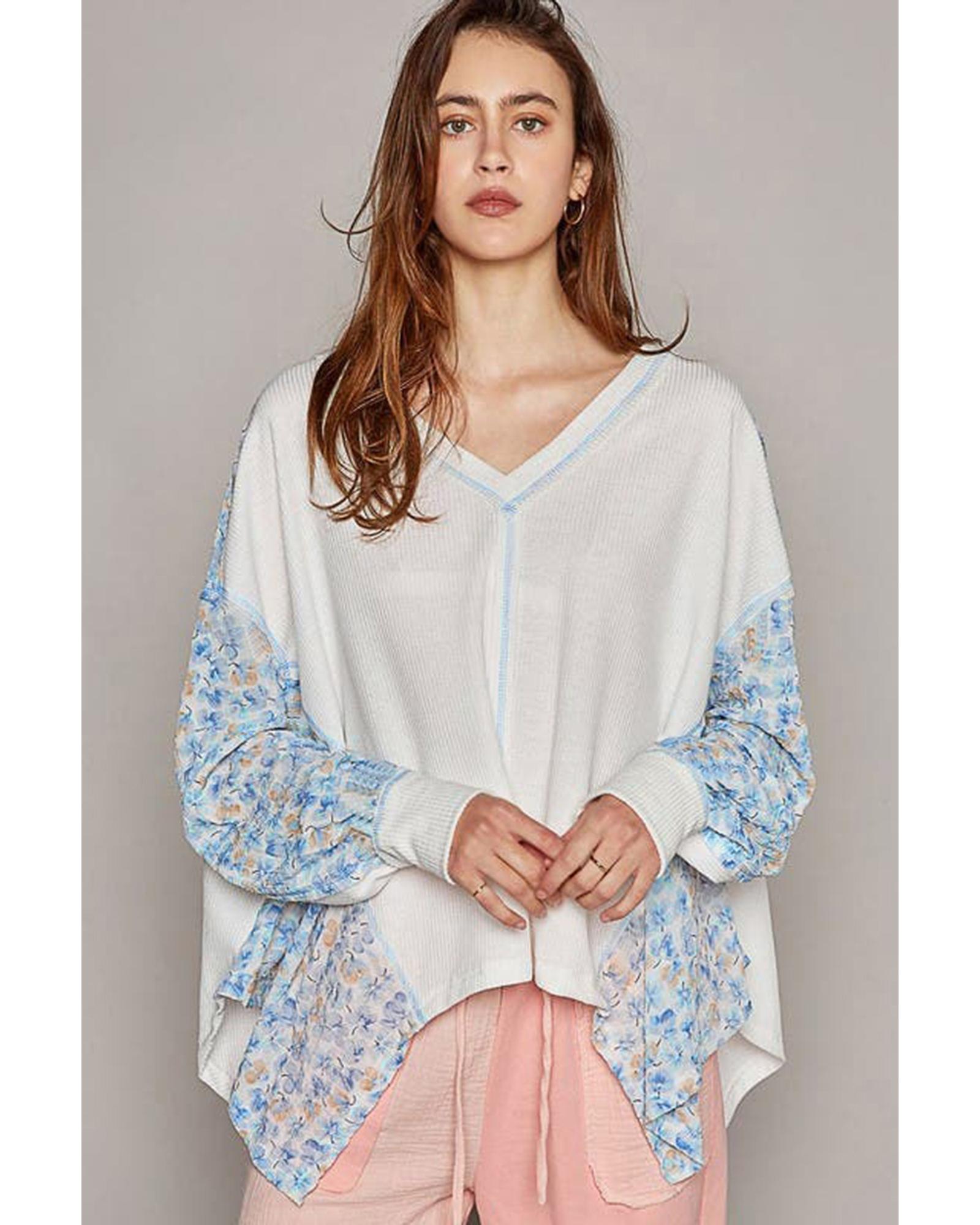 White Abstract Floral Patchwork Batwing Sleeve V Neck Blouse – XL