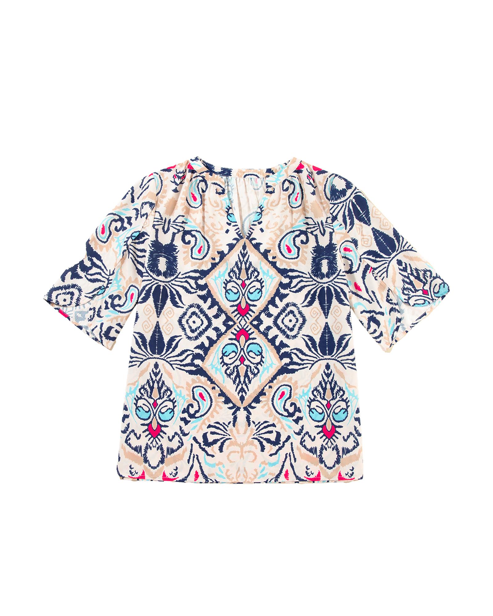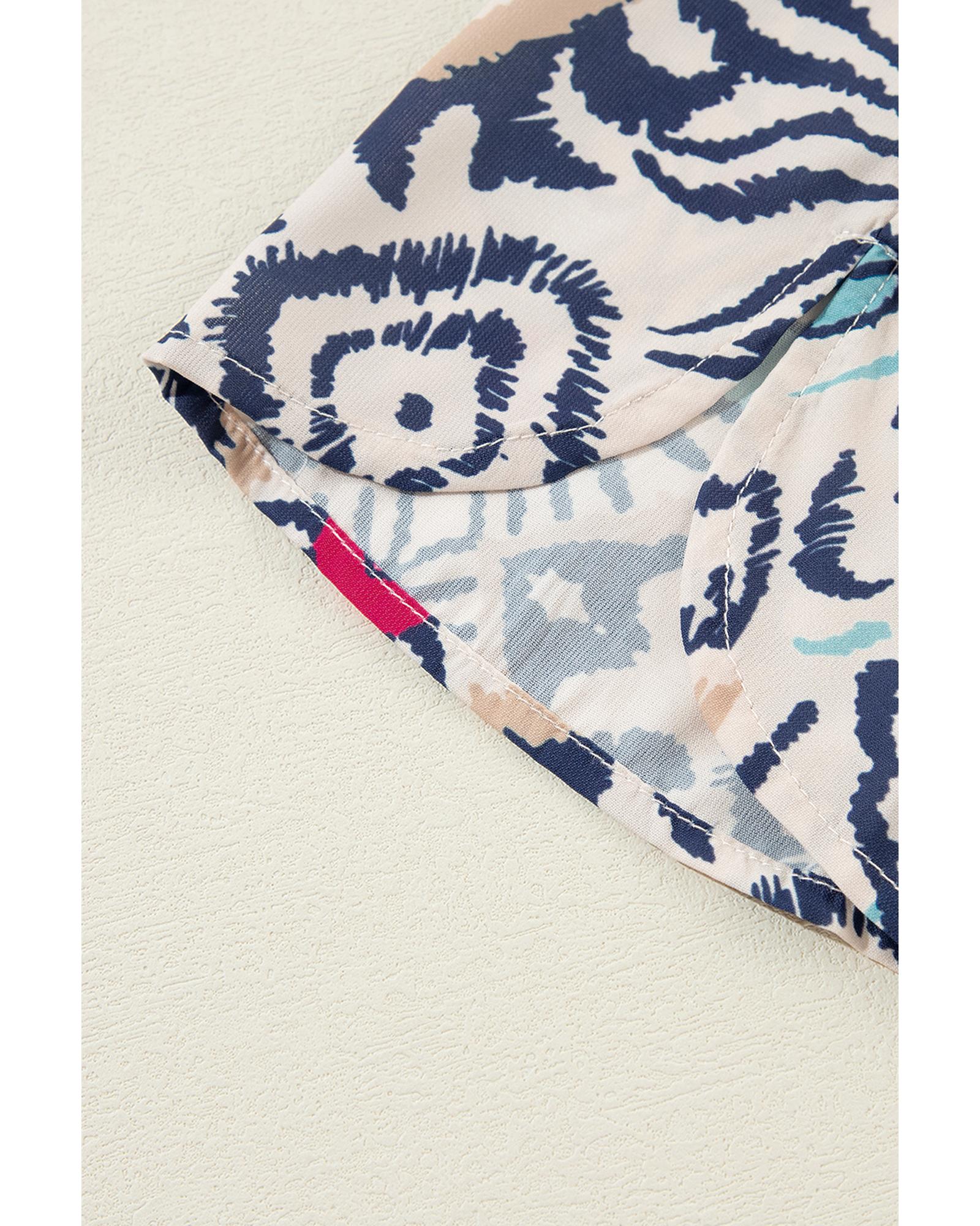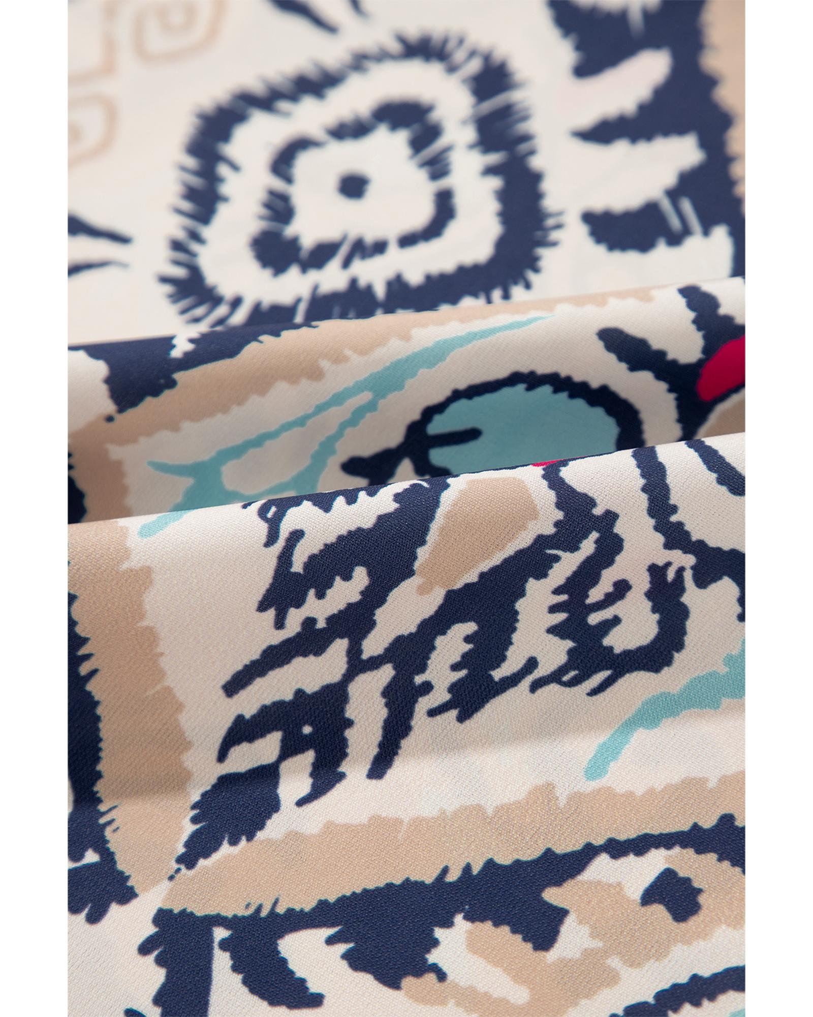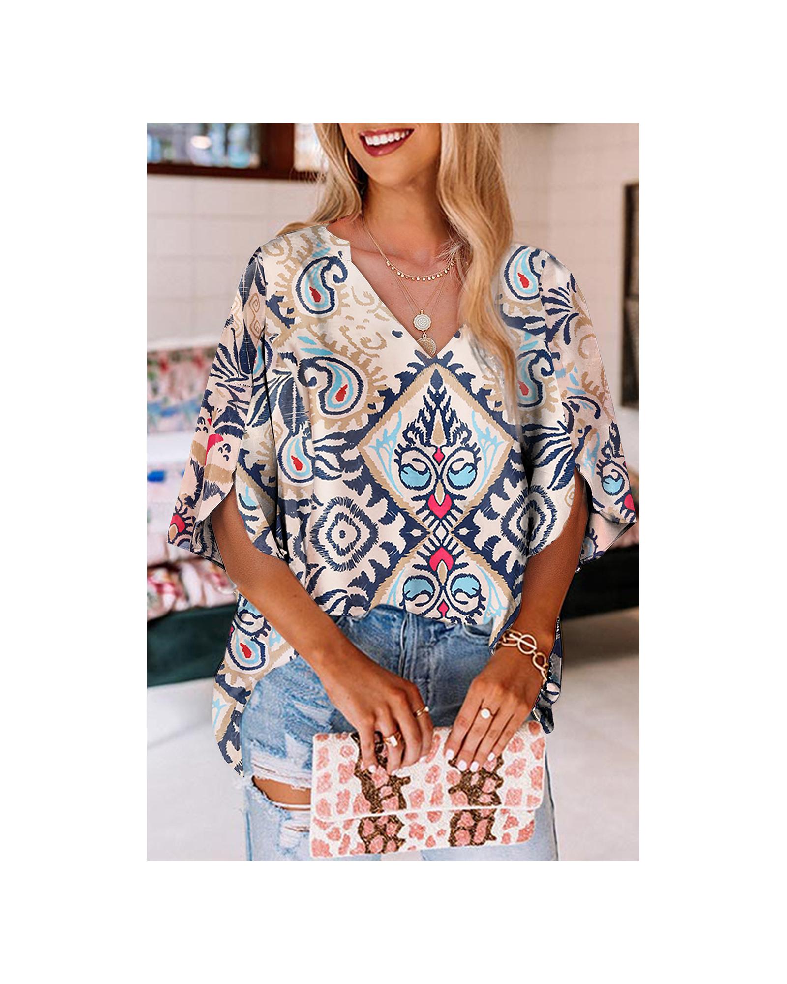 White Abstract Printed Notched V Neck Split Half Sleeve Blouse – M