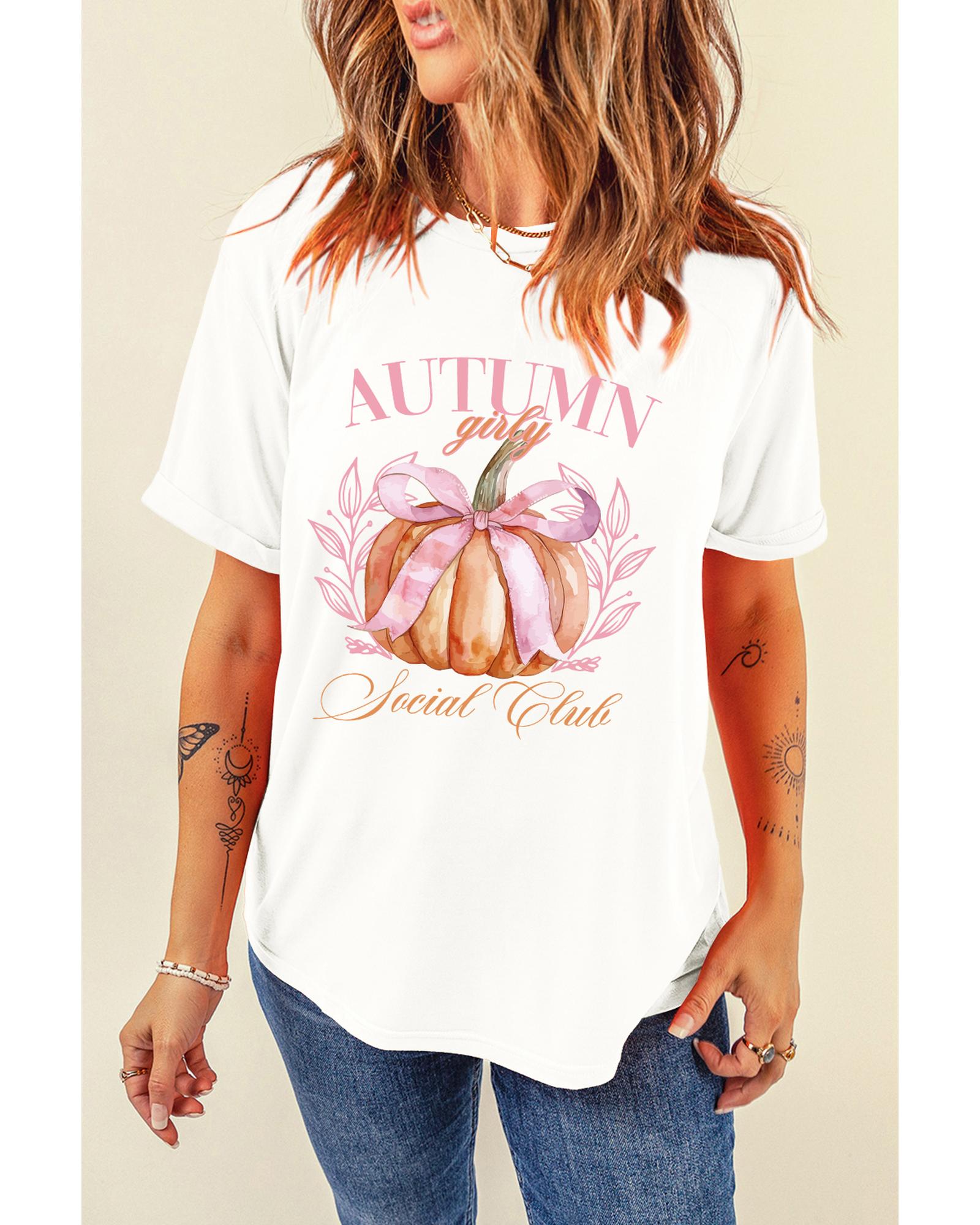 White Autumn Girly Thanksgiving Bowknot Pumpkin Graphic T Shirt – M