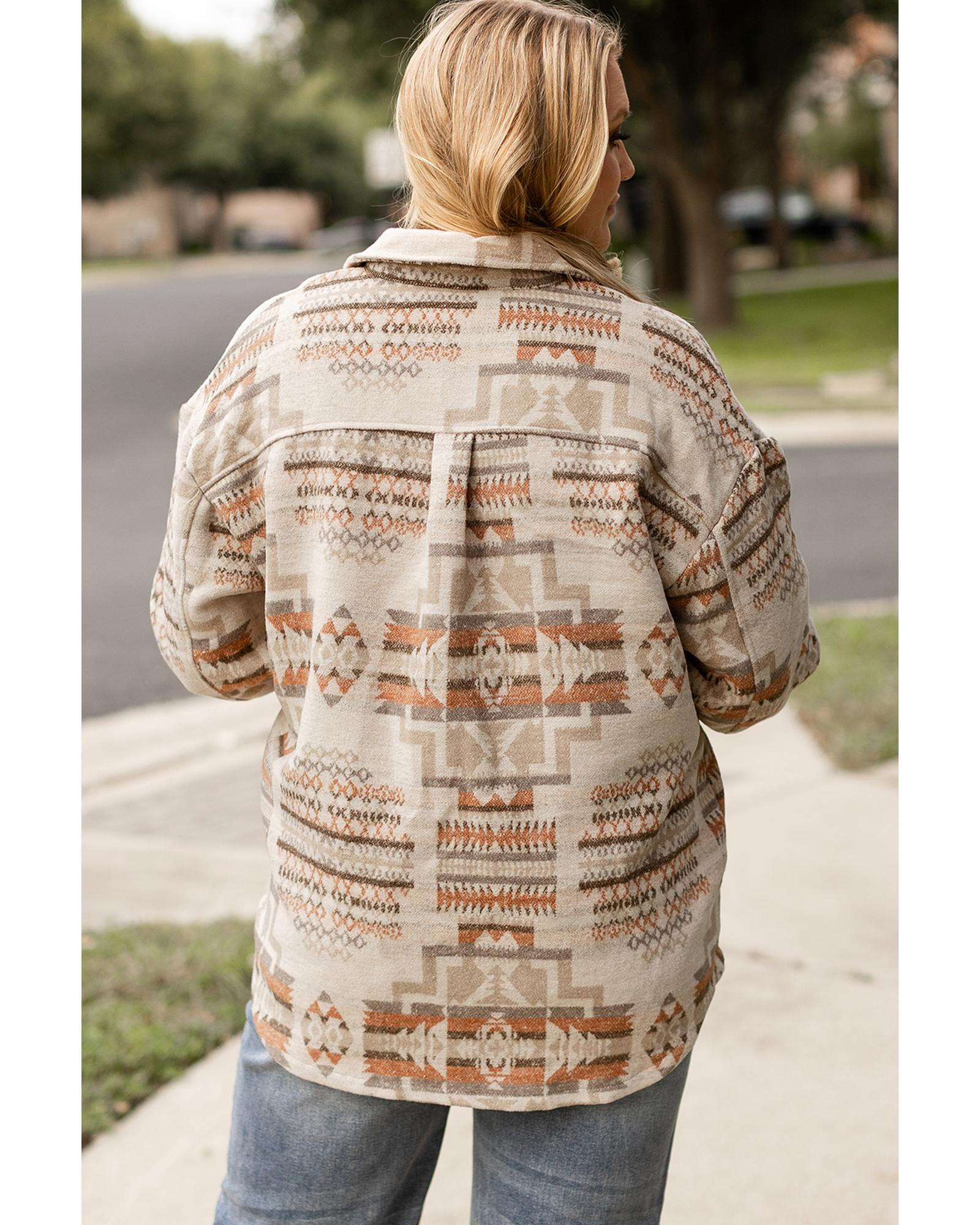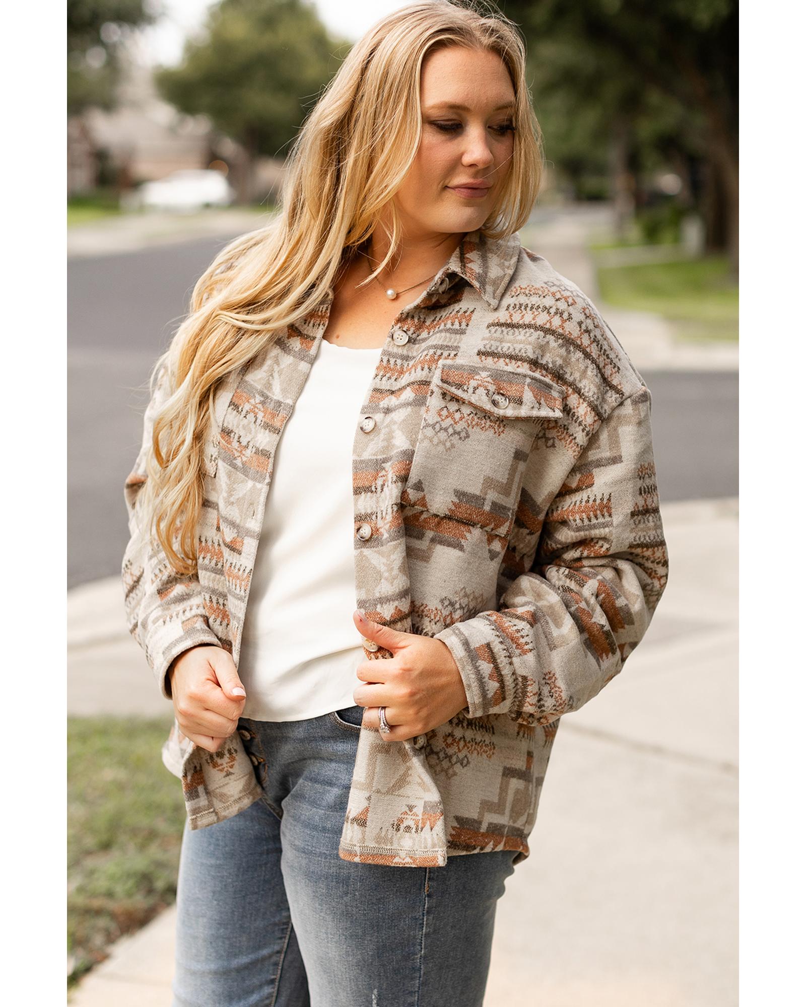 White Aztec Geometric Print Pockets Plus Size Jacket – 1X
