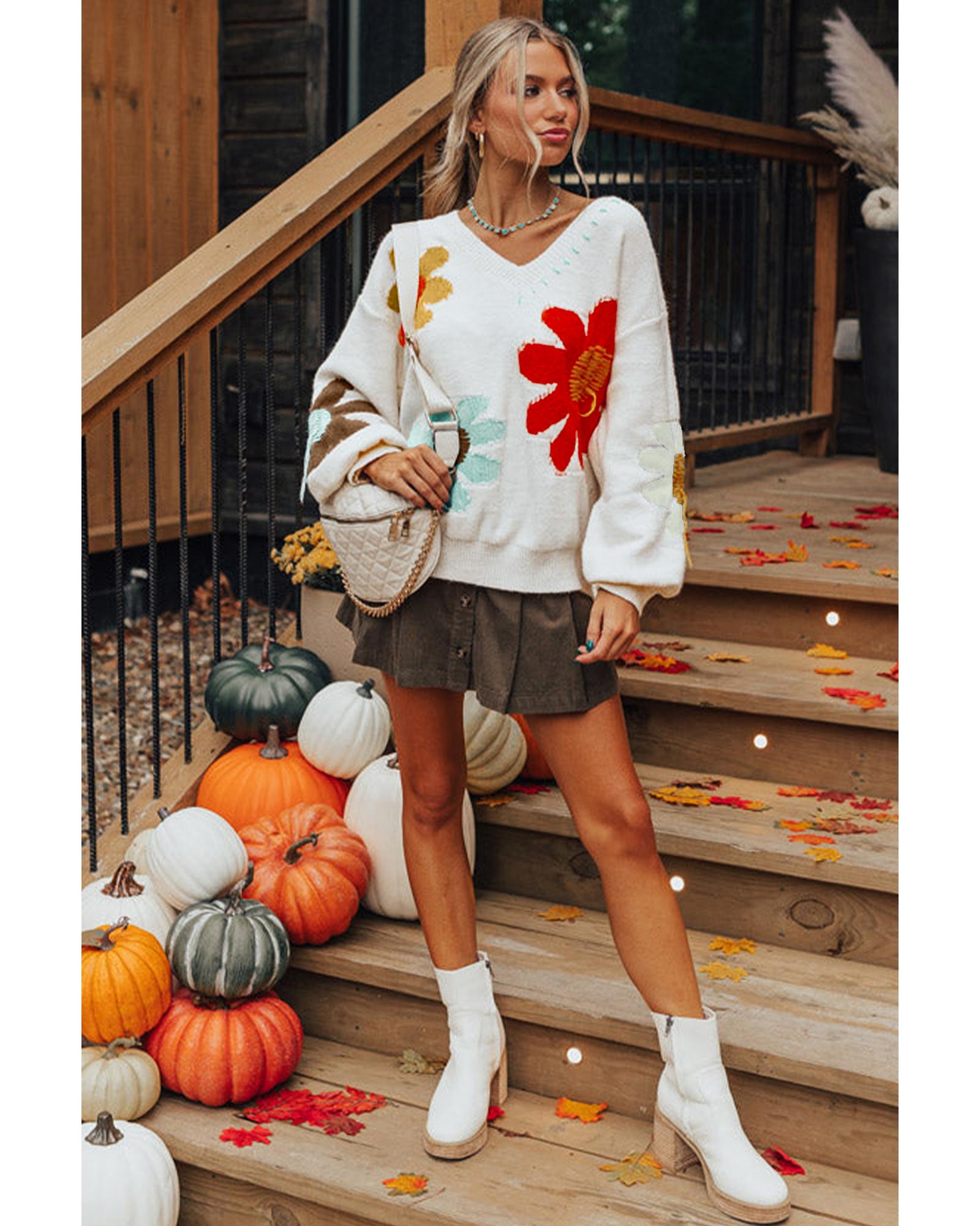 - White Big Flower Pattern V Neck Drop Shoulder Sweater