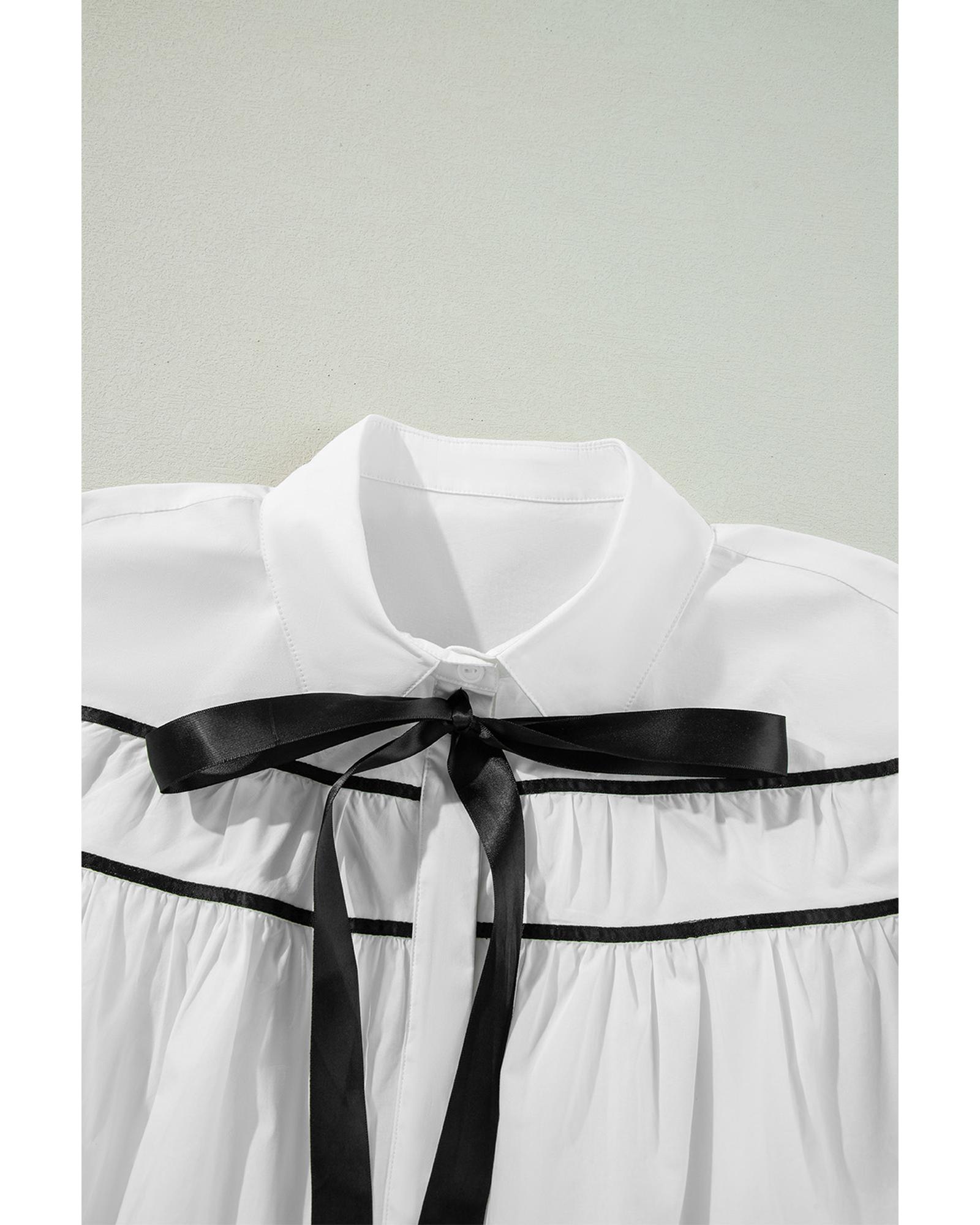 White Black Pipping Ribbon Bowtie Collared Ruffled Puff Sleeve Shirt – L