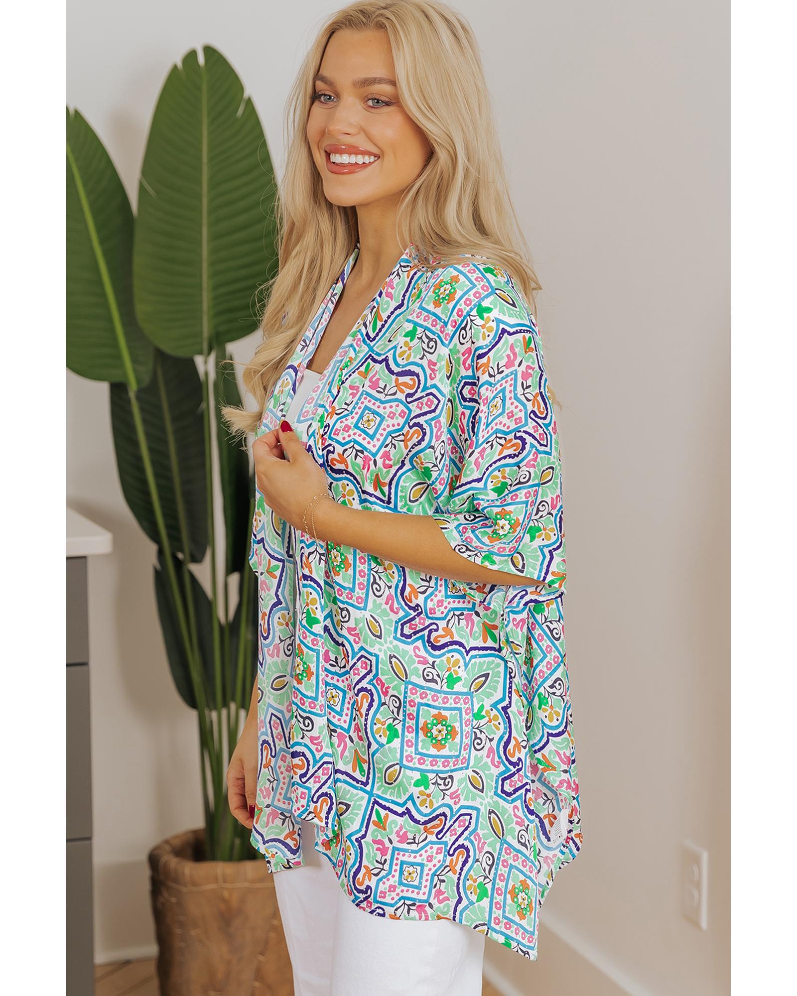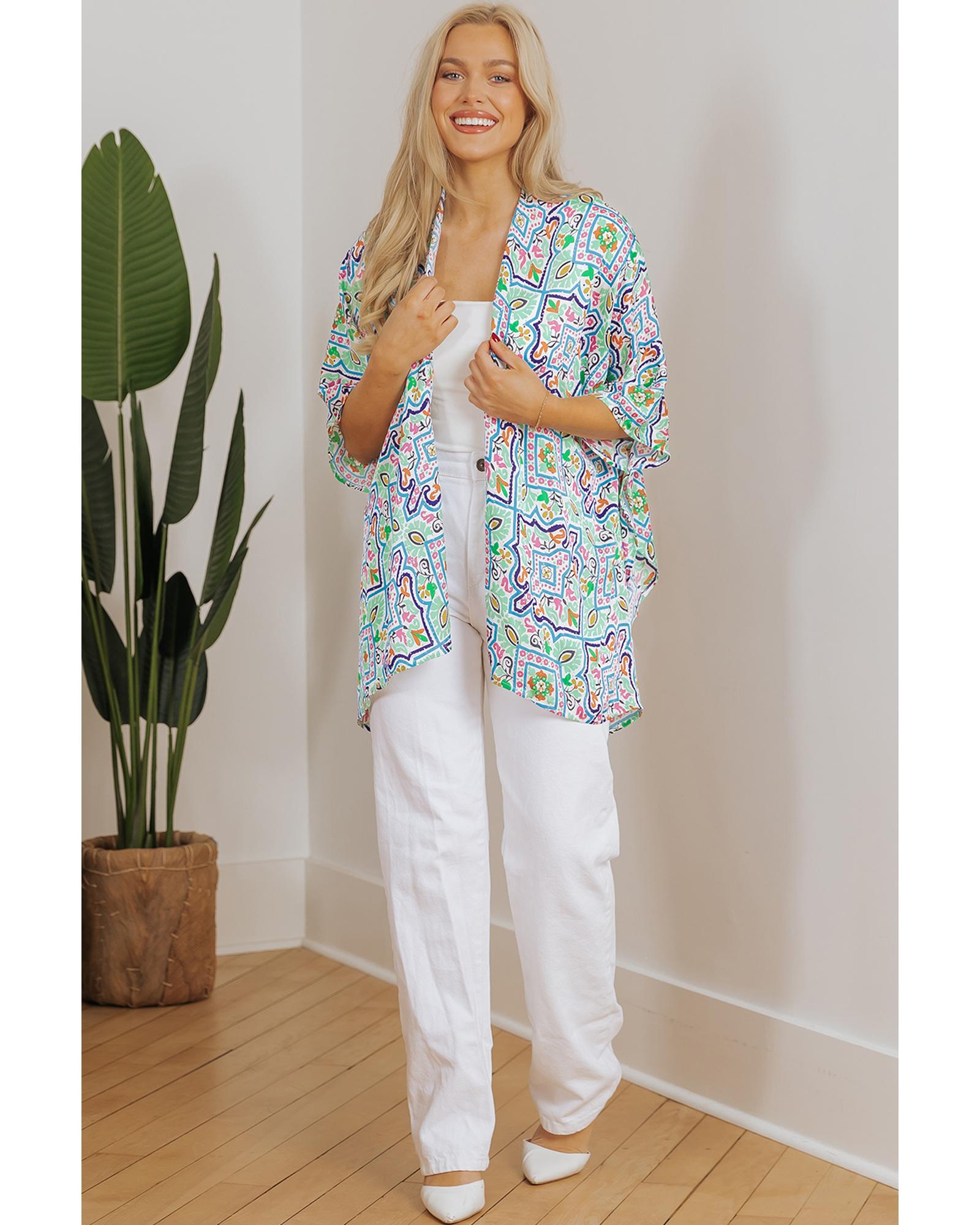 White Boho Floral Printed Rhinestone 3/4 Sleeve Open Front Kimono – L
