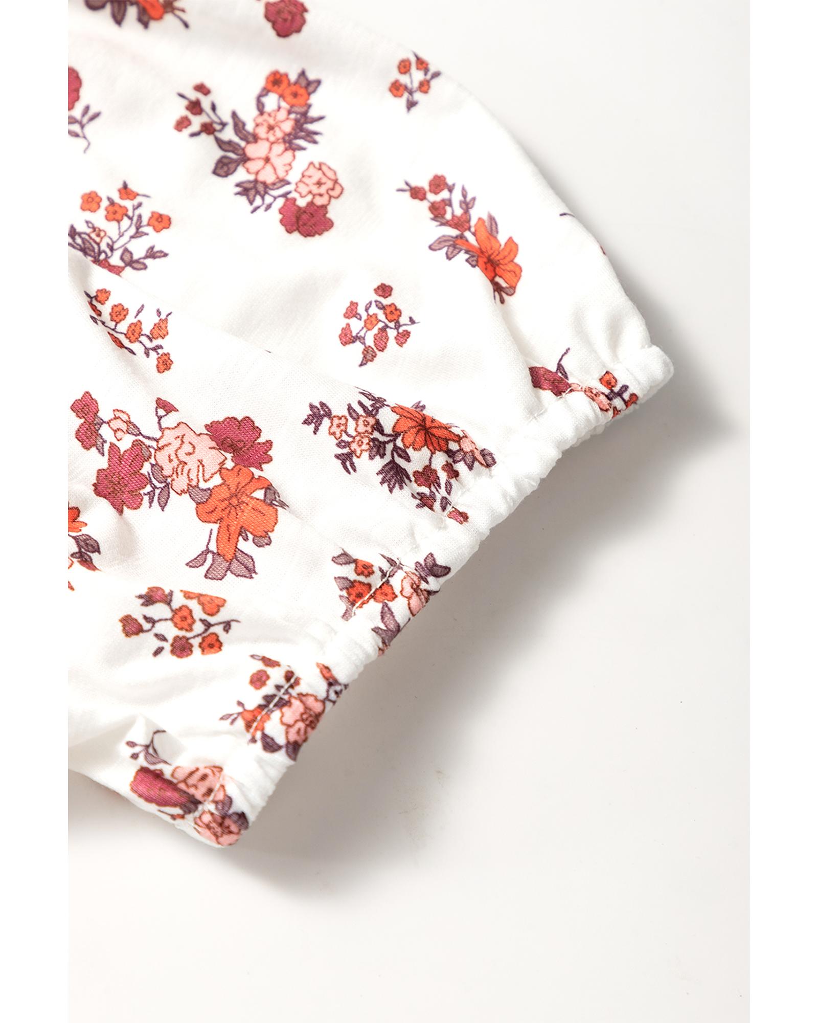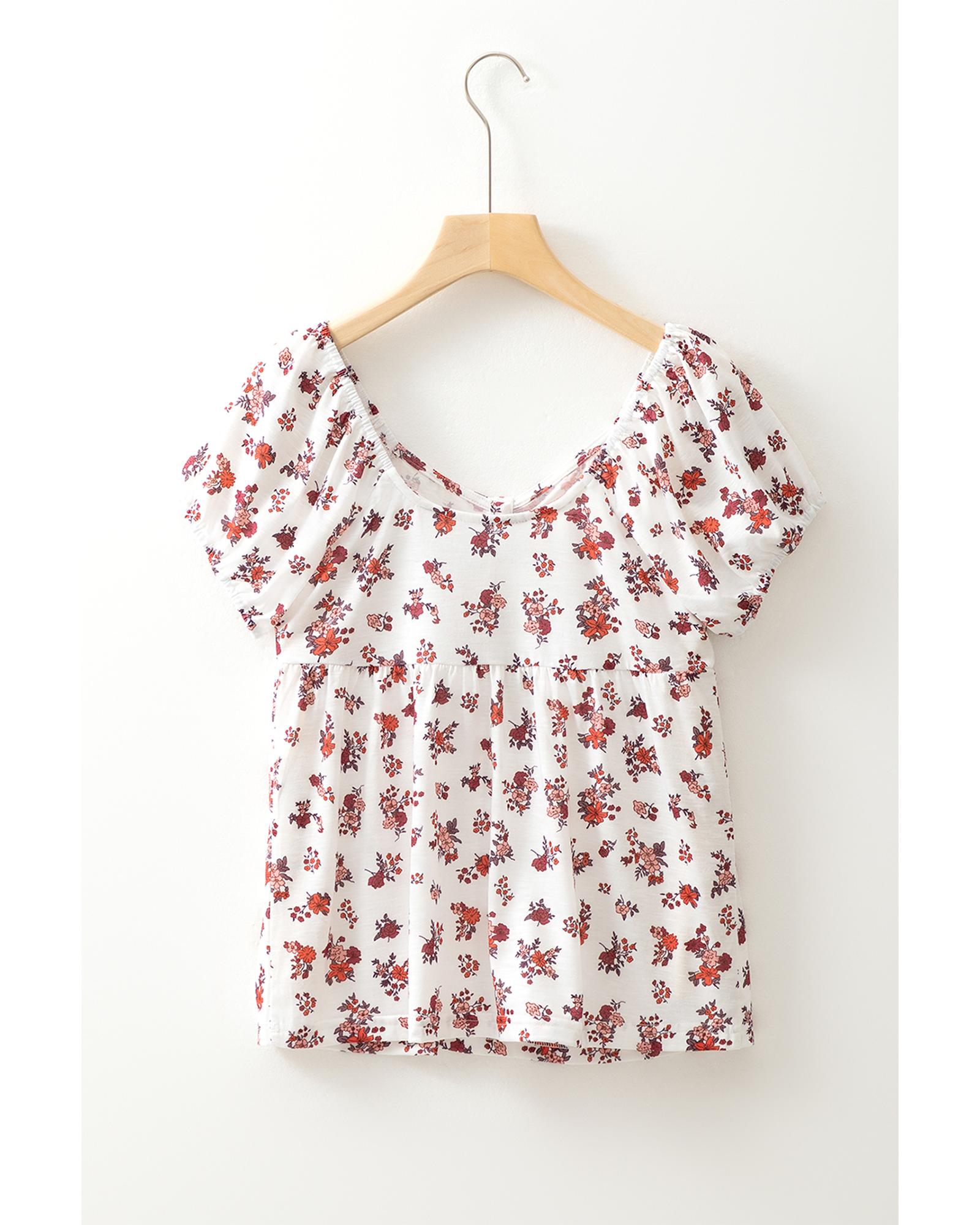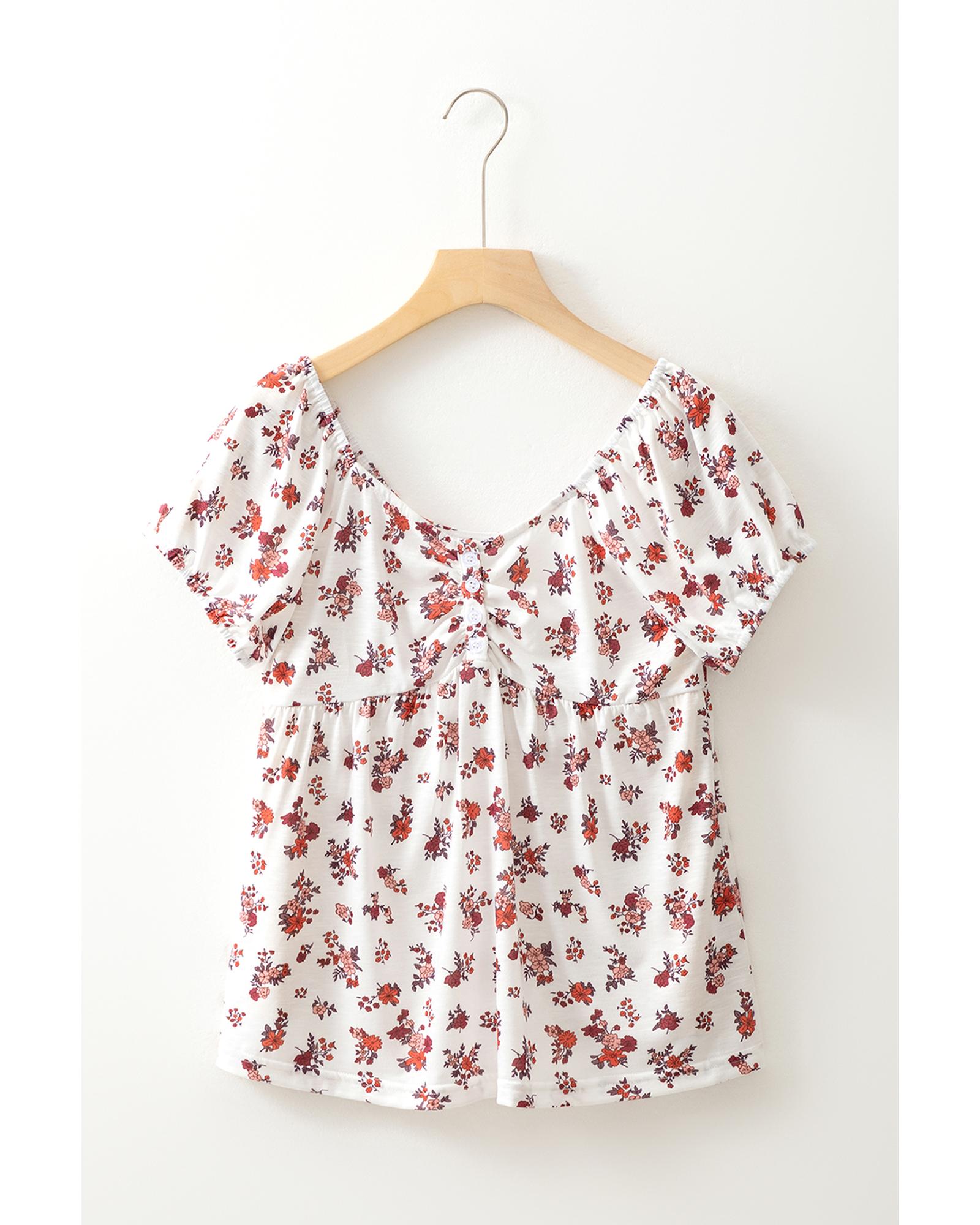 White Boho Floral Ruched Cinched Short Sleeve Blouse – S