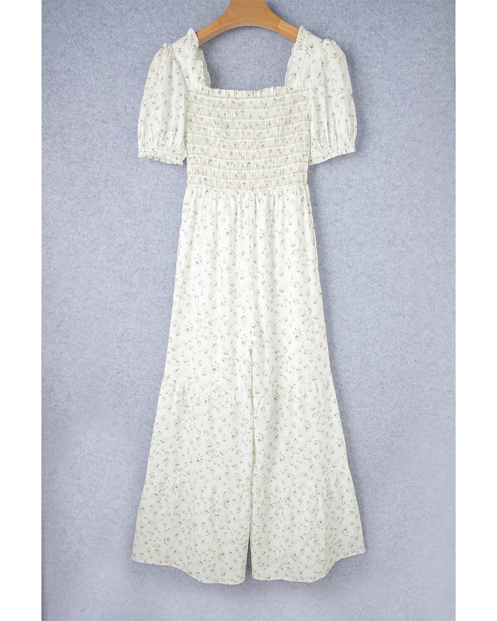 White Boho Floral Smocked Wide Leg Short Puff Sleeve Jumpsuit – L
