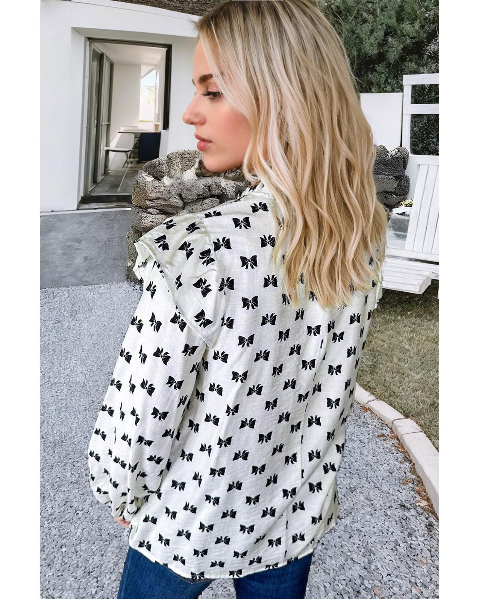 White Bow Knot Print Piping Trim Ruffled Crew Neck Blouse – S