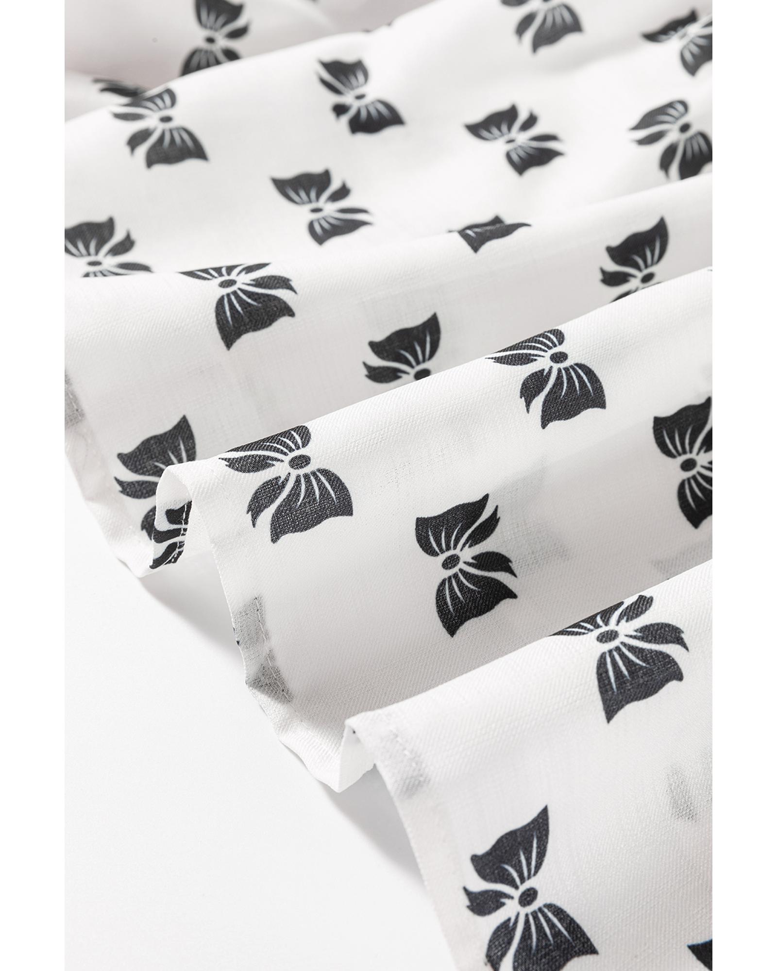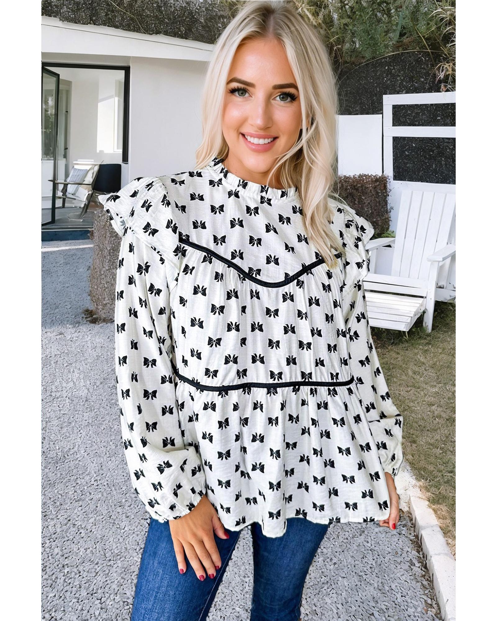 White Bow Knot Print Piping Trim Ruffled Crew Neck Blouse – XL
