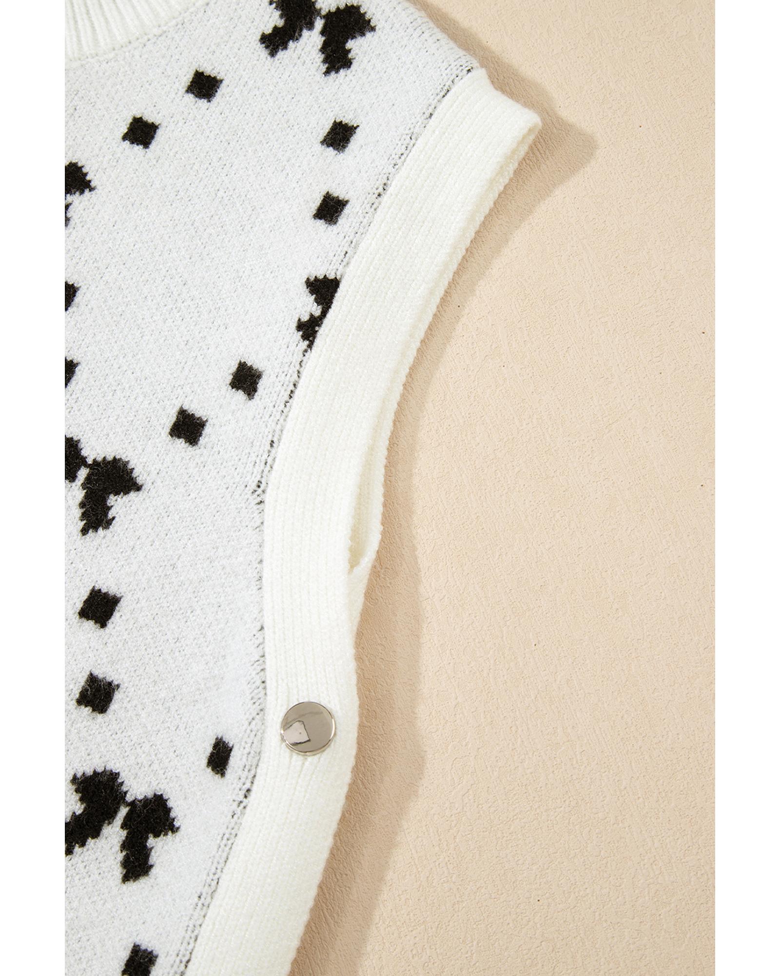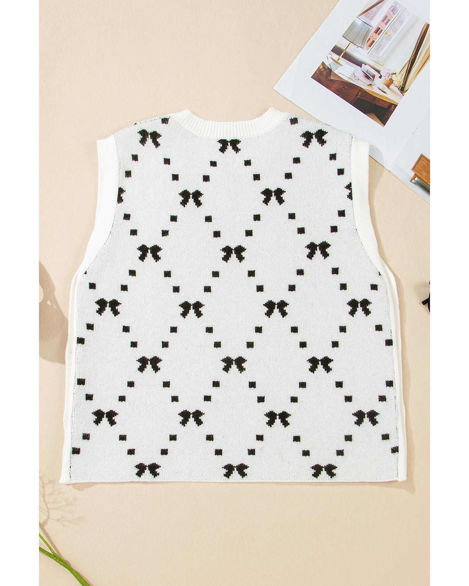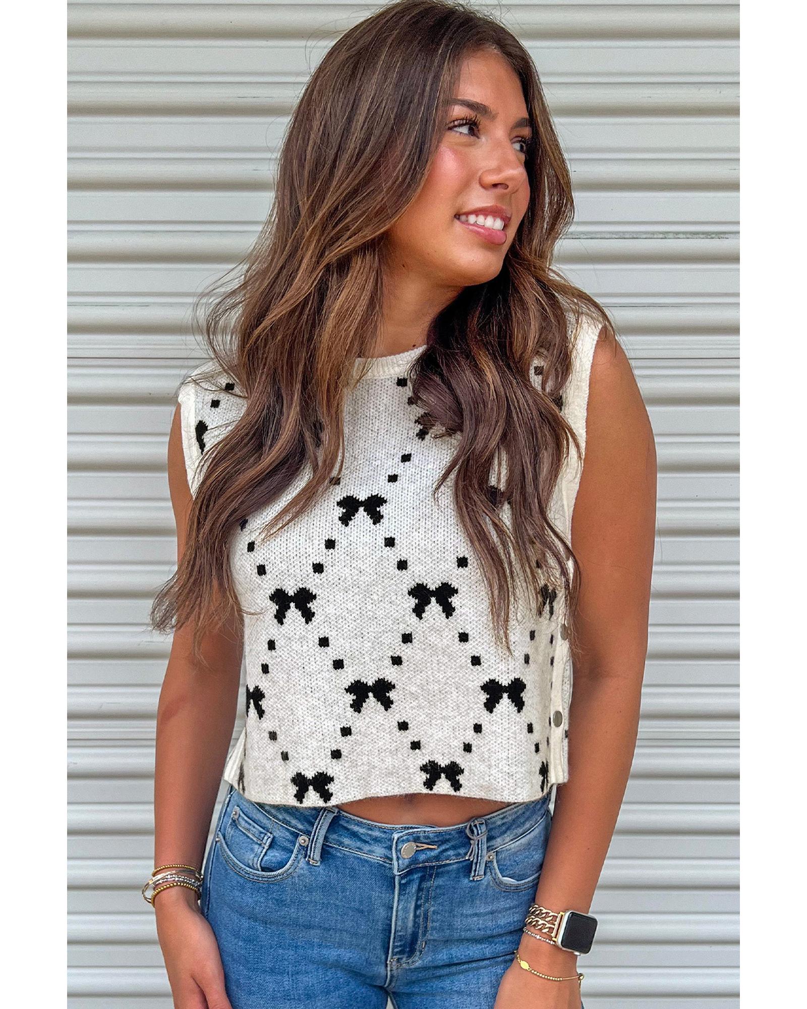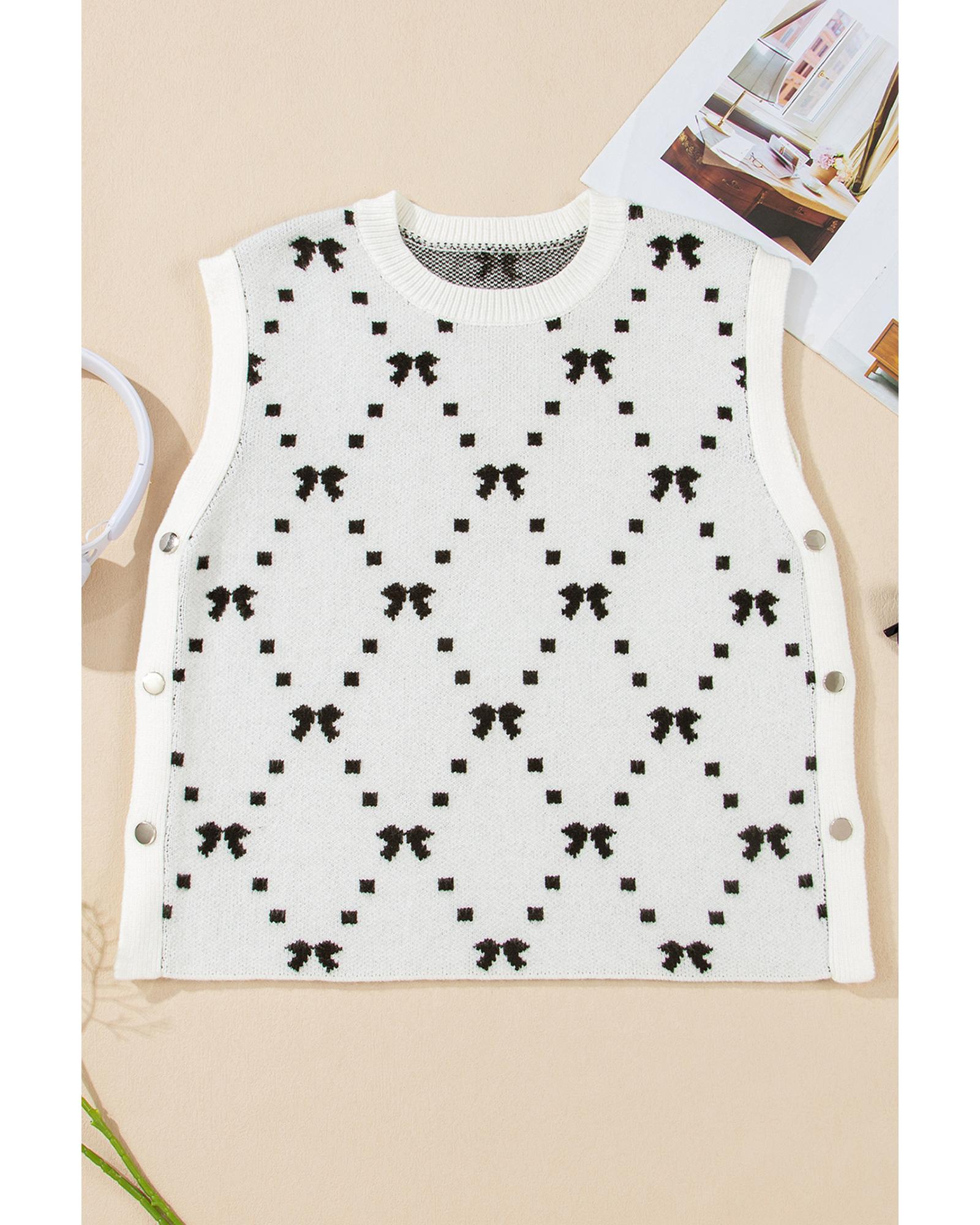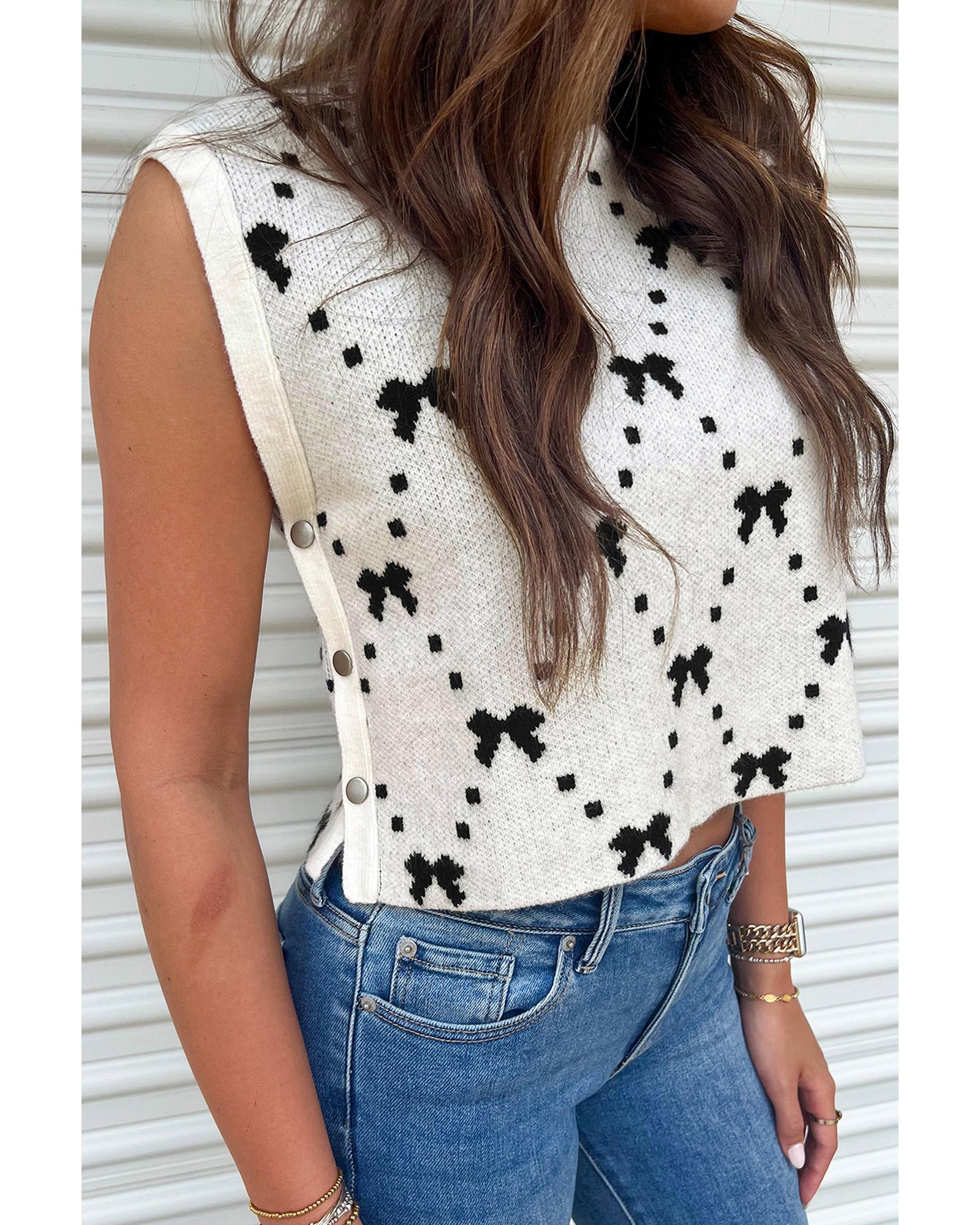 White Bow Pattern Buttoned Side Cropped Sweater Vest – L