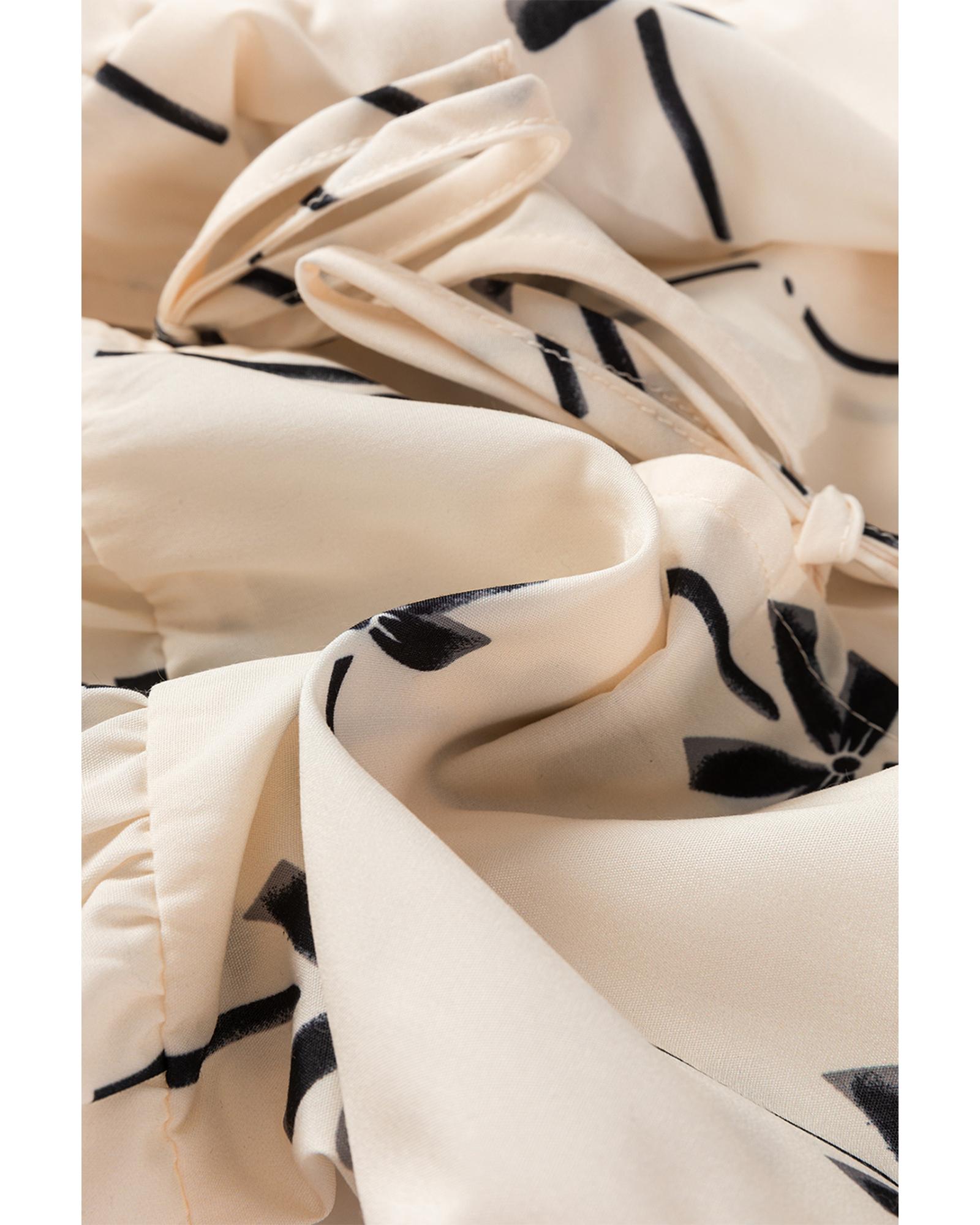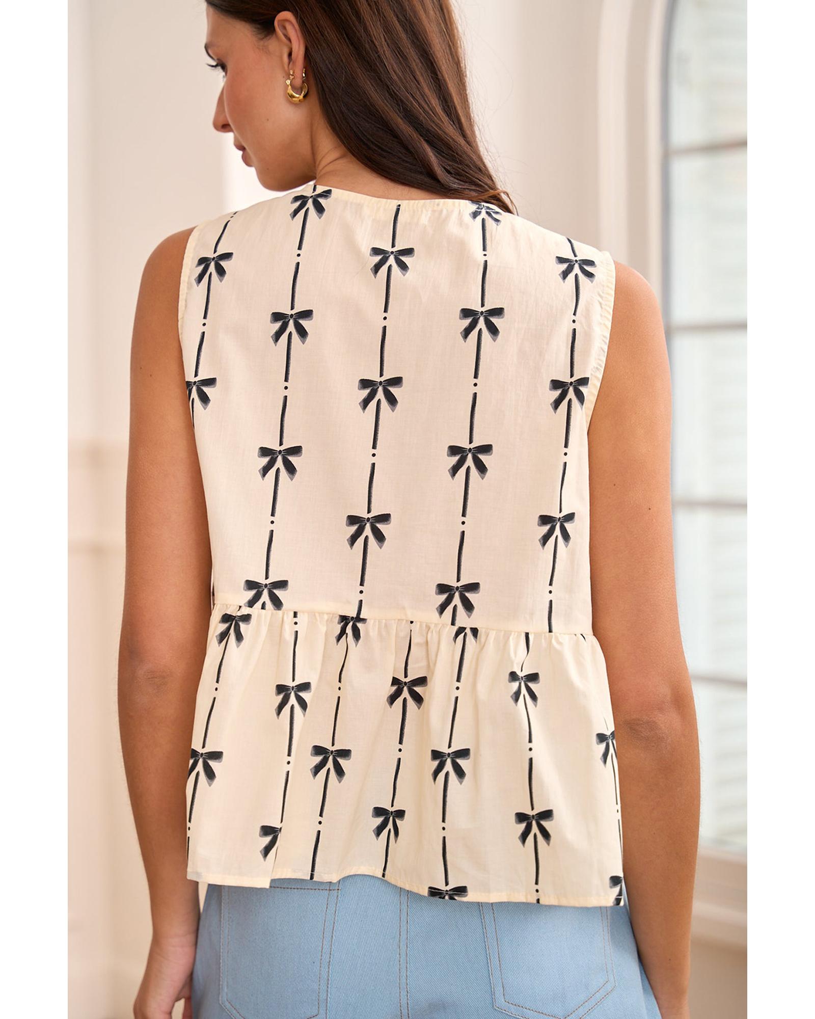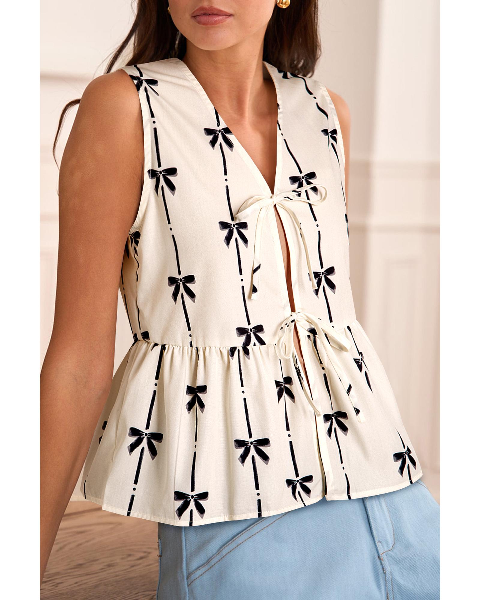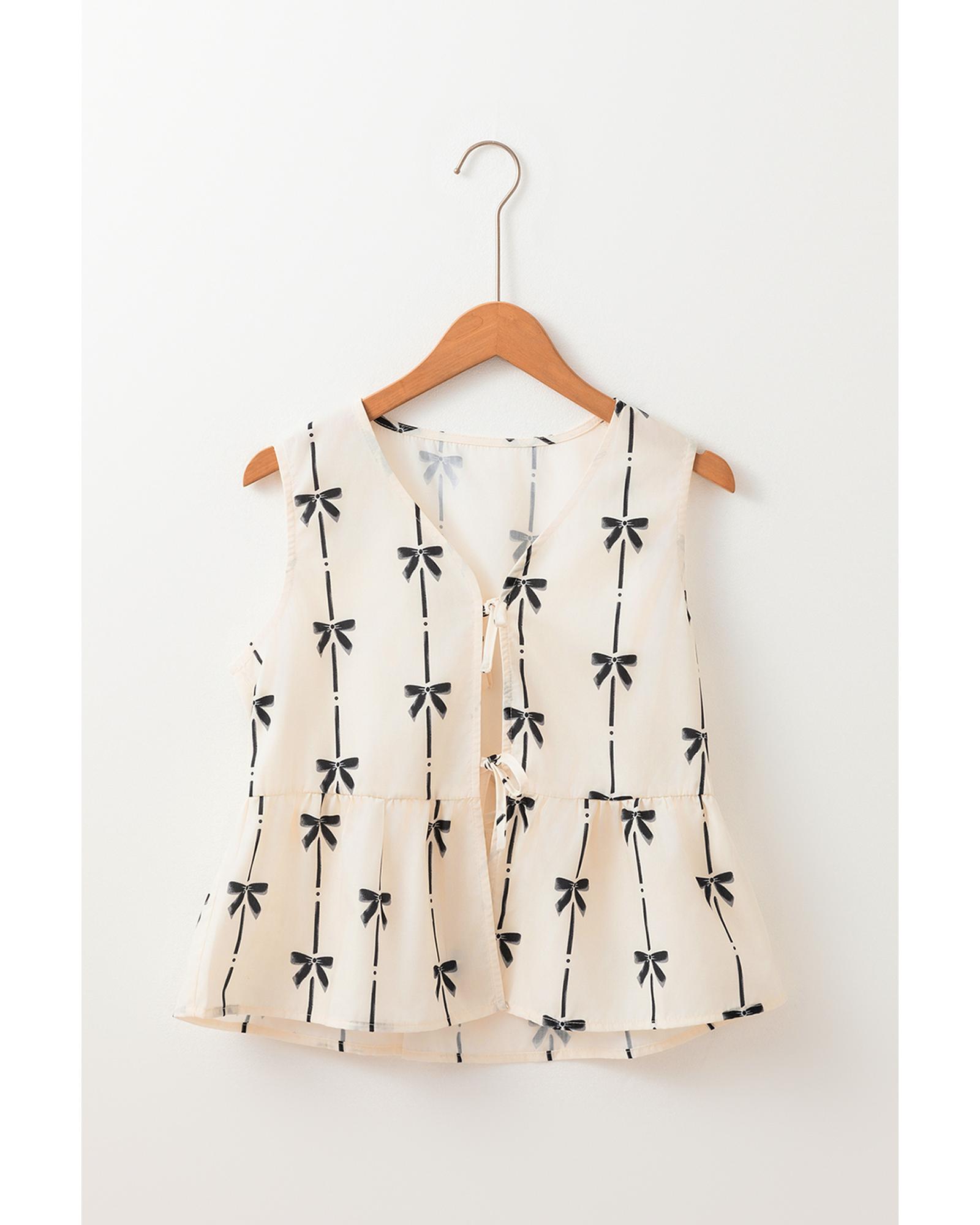 - White Bow Printed Tie Closure Ruffled Vest