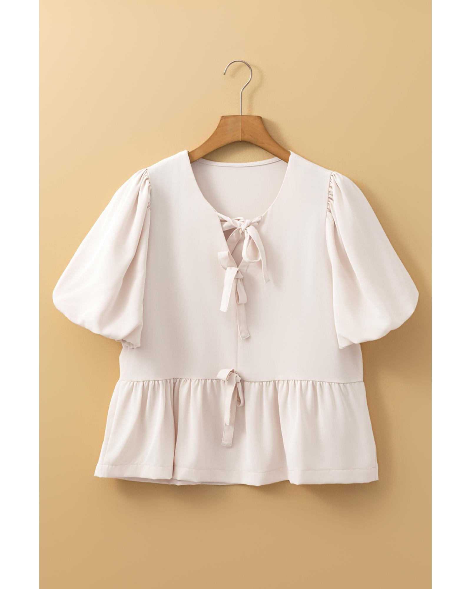 - White Bow Tie Short Puff Sleeve Ruffle Hem Blouse