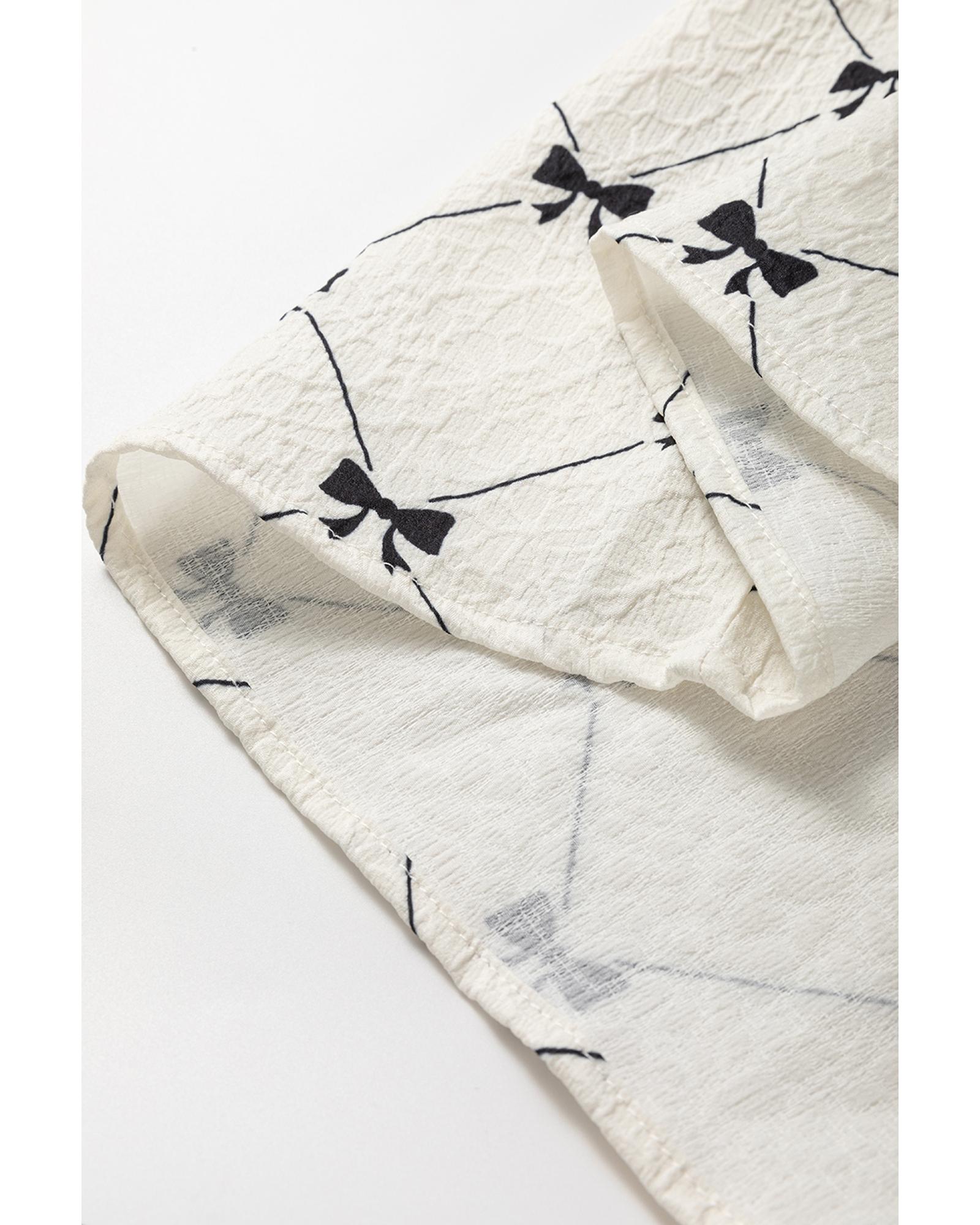White Bowtie Pattern Textured Puff Half Sleeve Loose Mini Dress – L