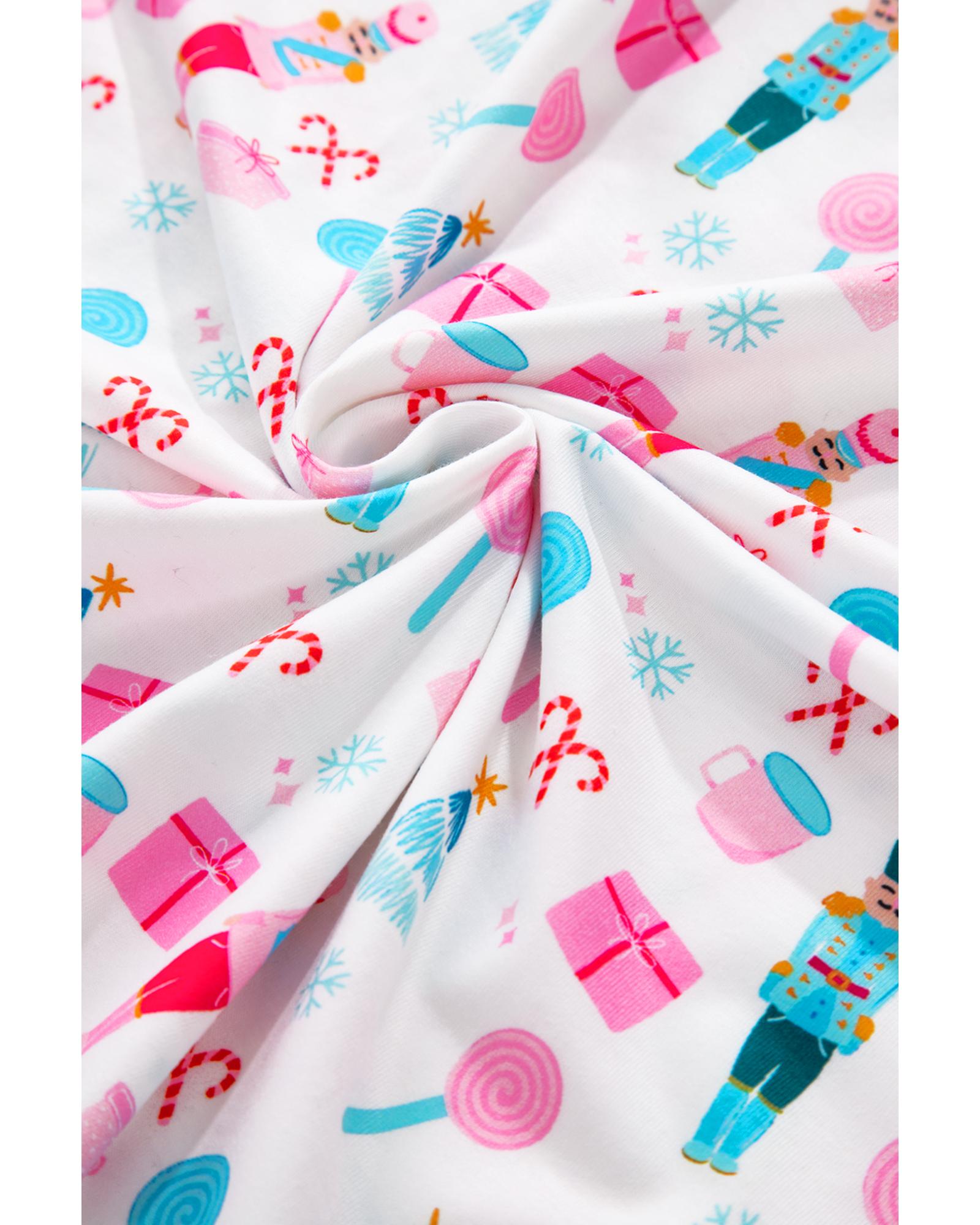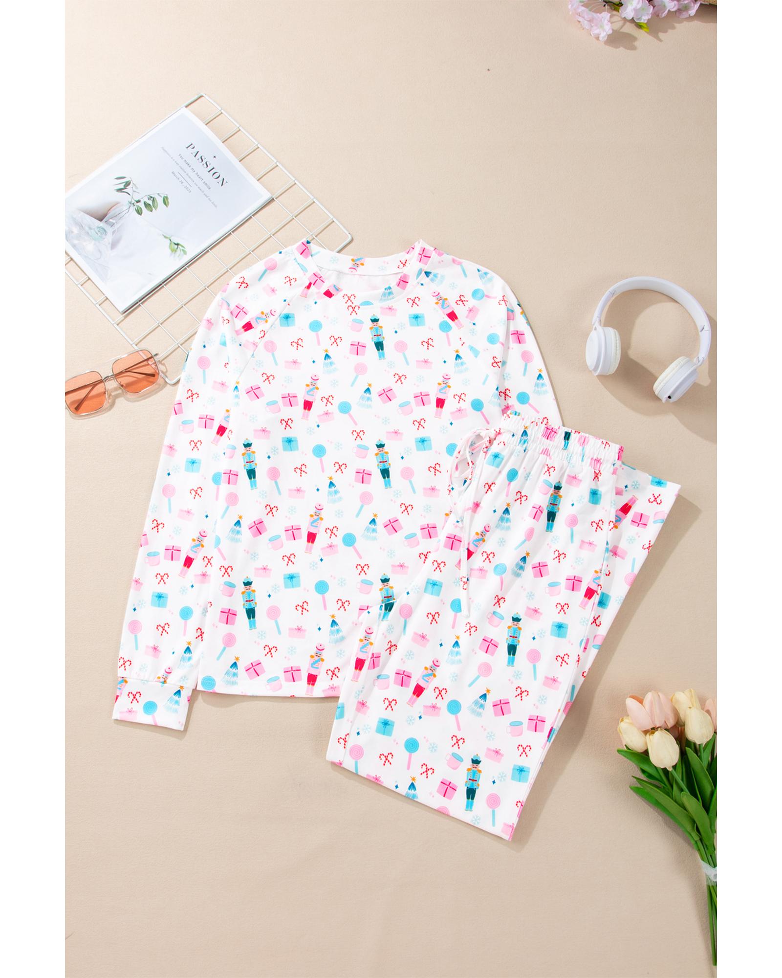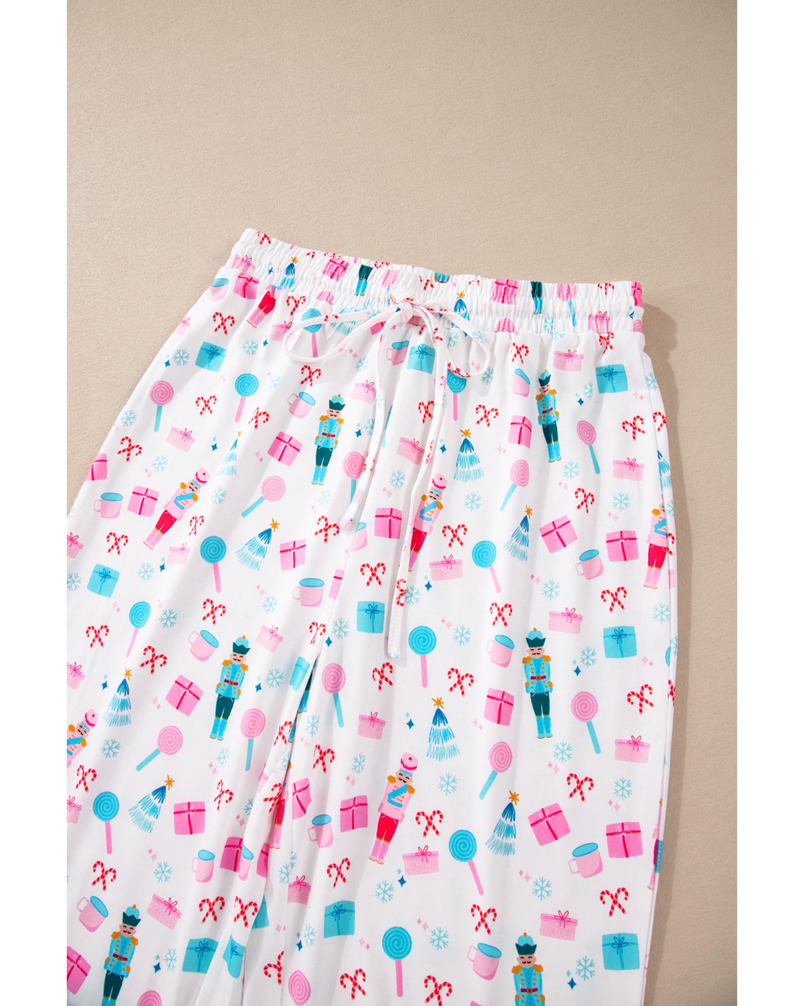 White Christmas Pattern Long Sleeve Top and Wide Leg Pants Set – M
