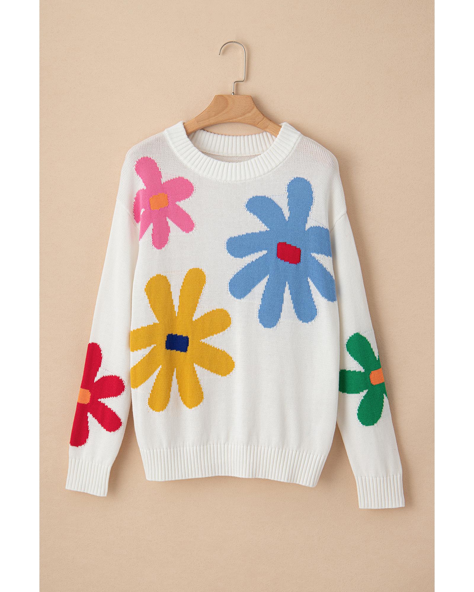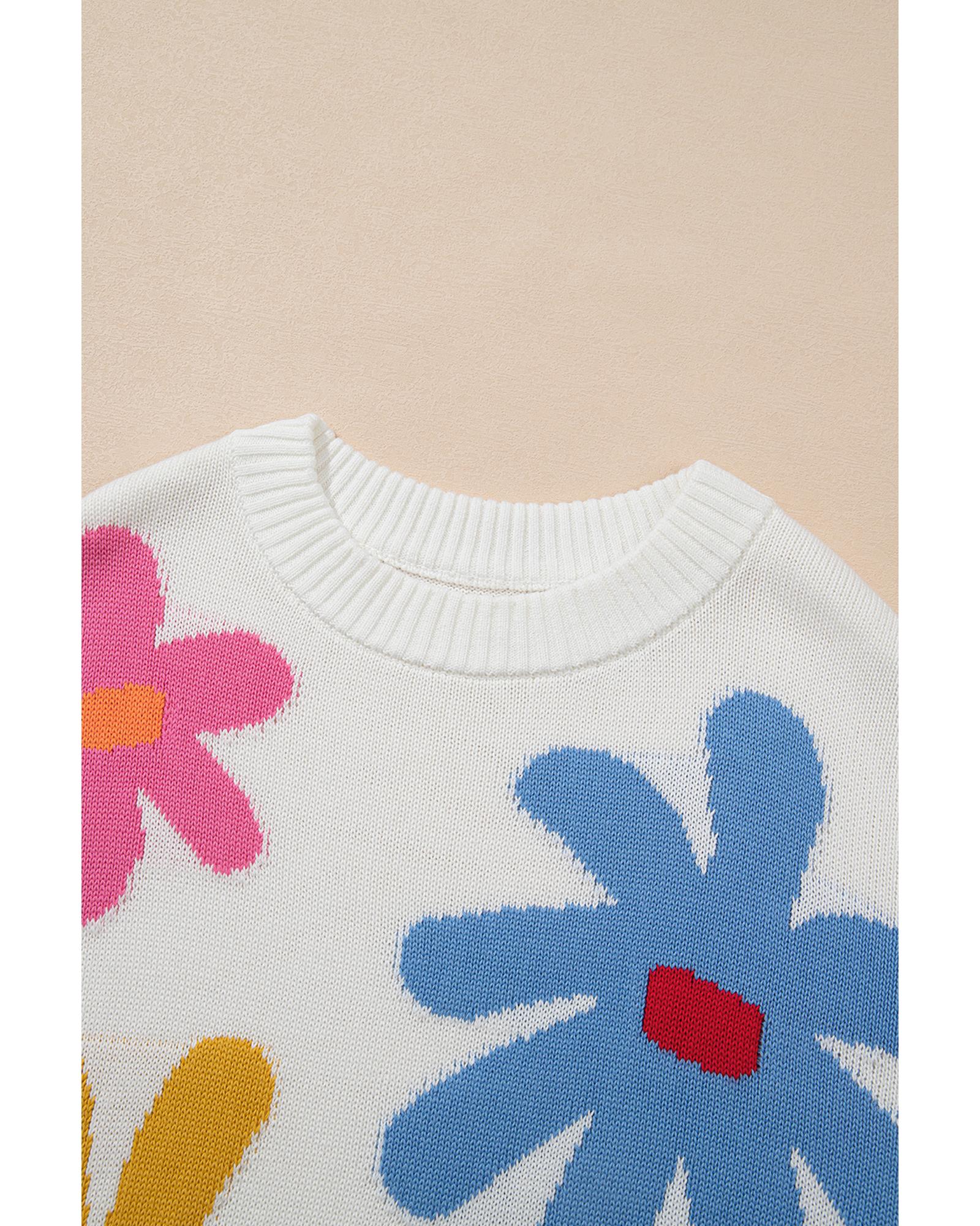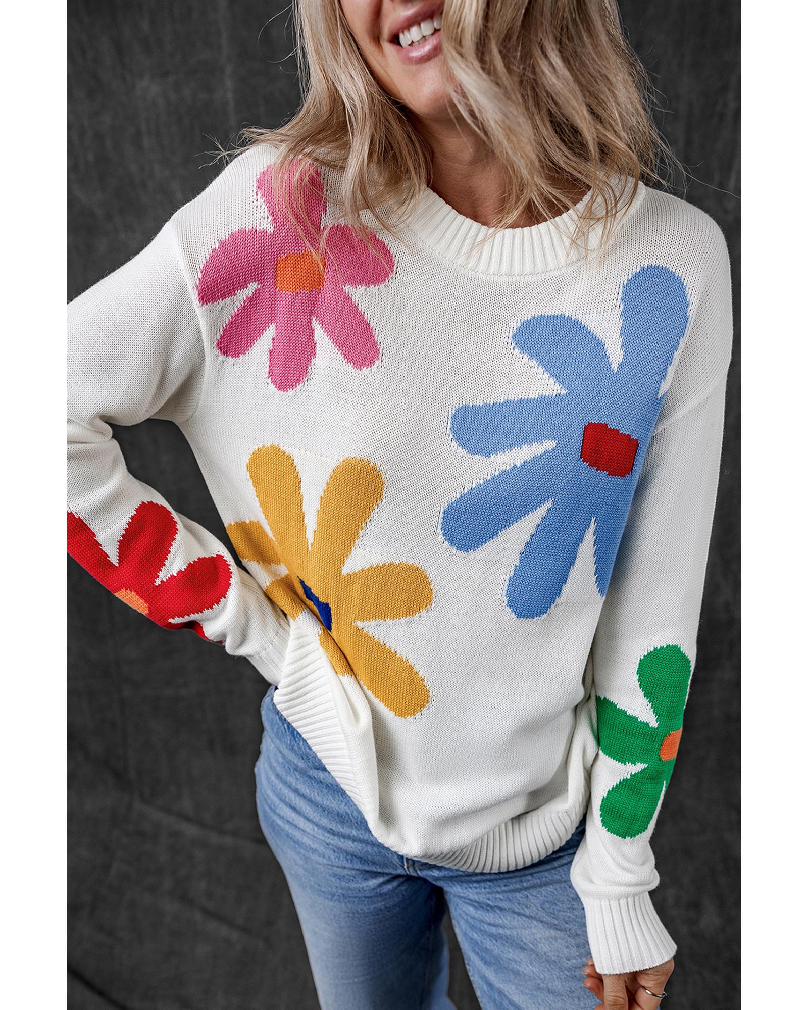 White Colorful Big Flower Pattern Crewneck Sweater – XL
