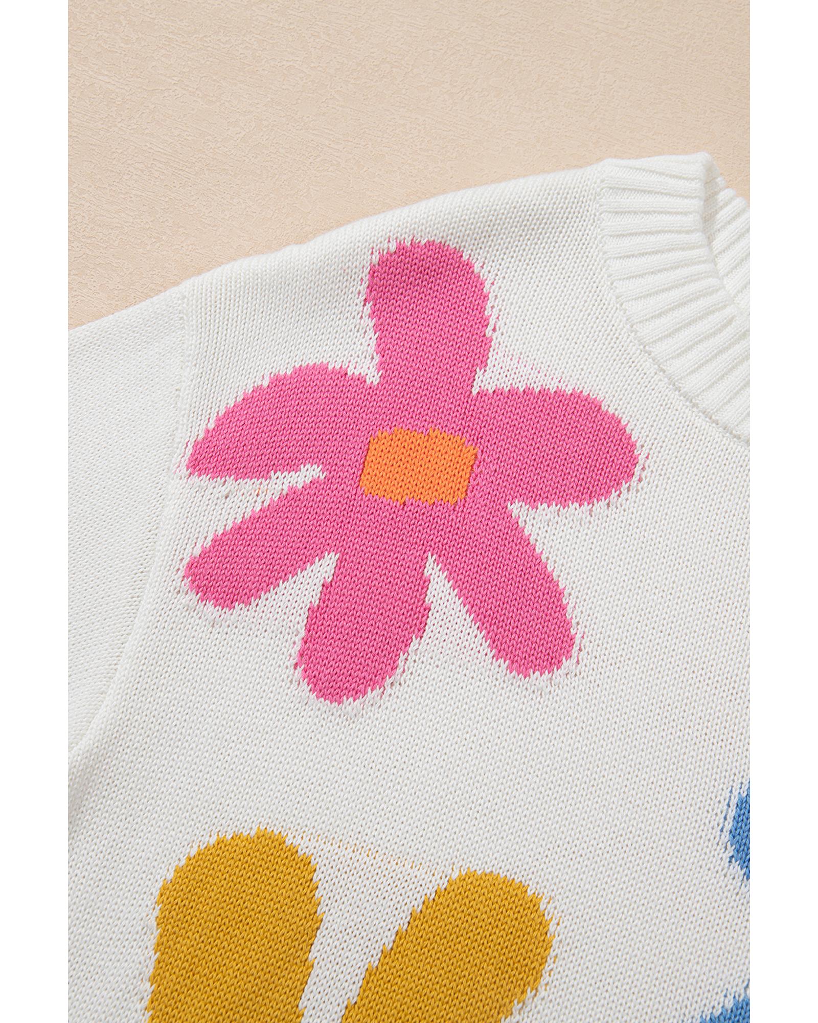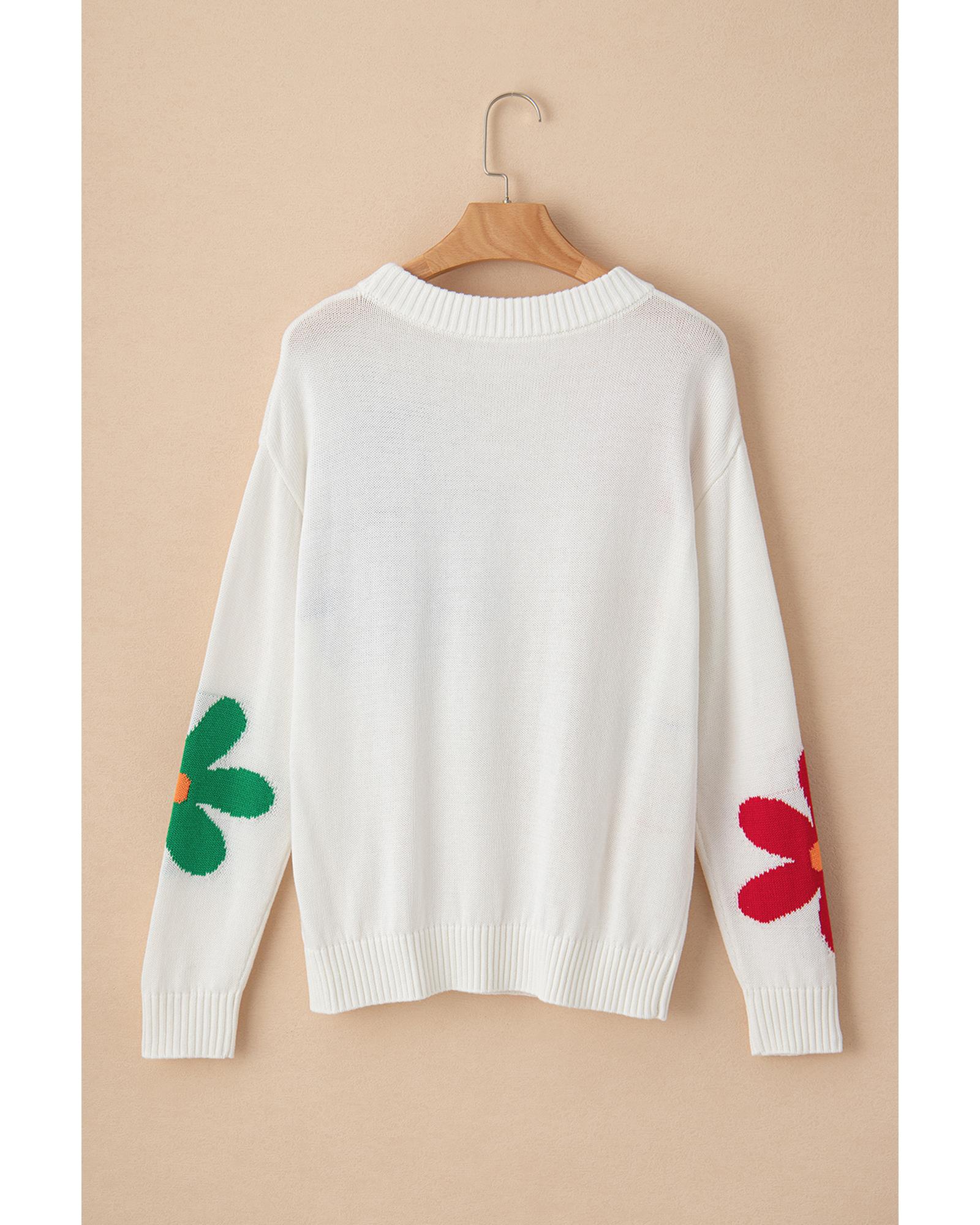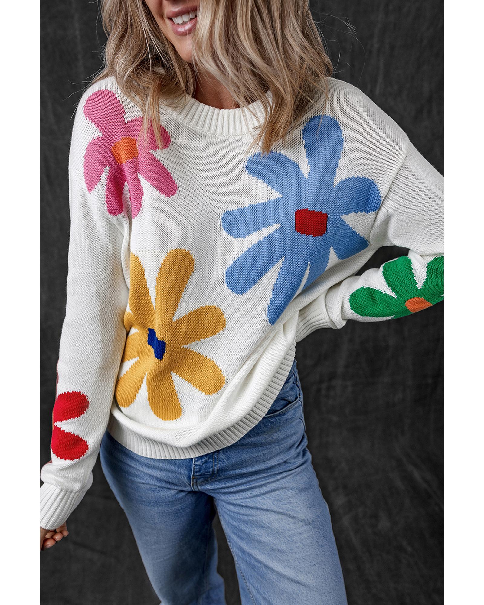 White Colorful Big Flower Pattern Crewneck Sweater – XL