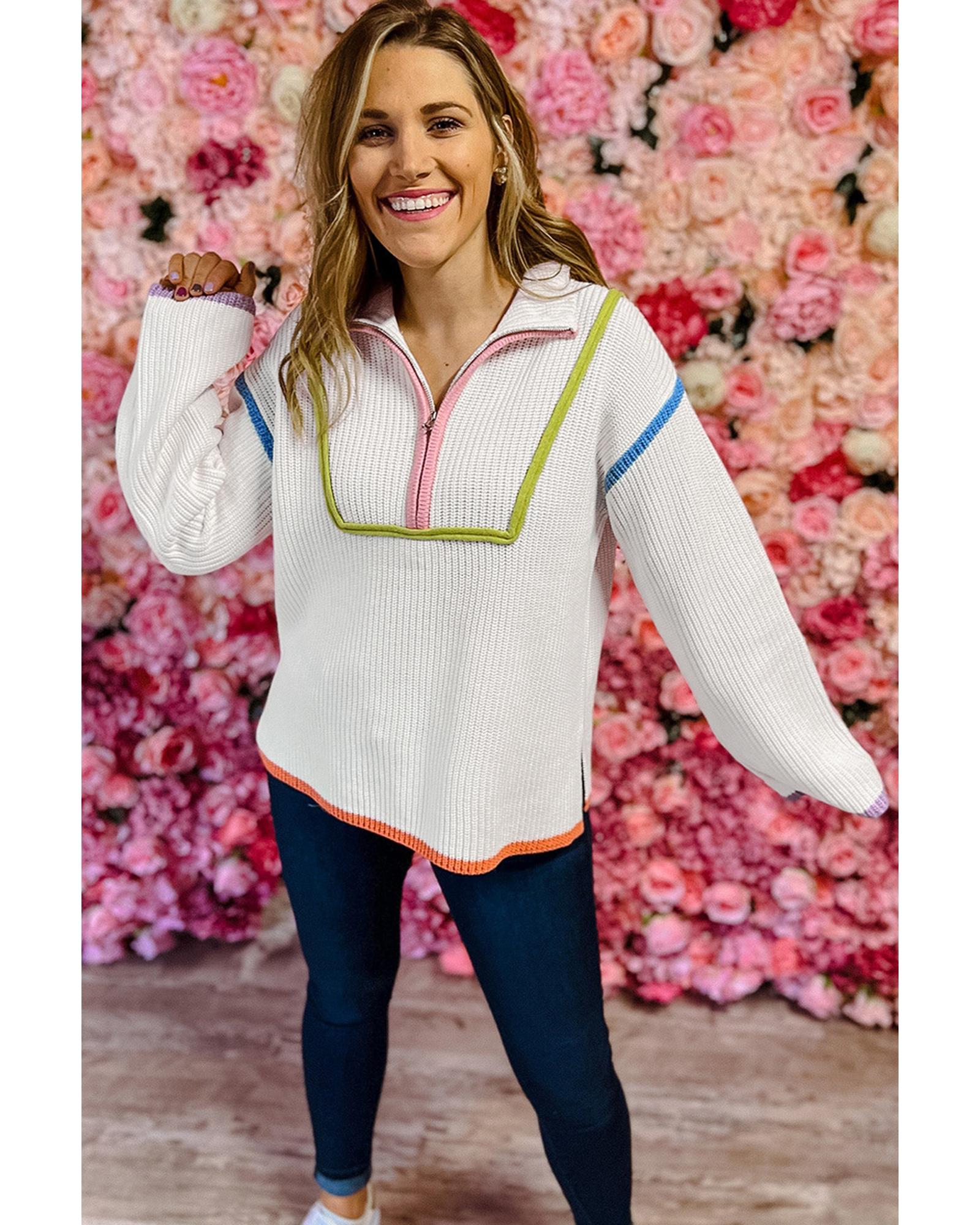 • White Colorful Edge Quarter Zip Drop Shoulder Sweater