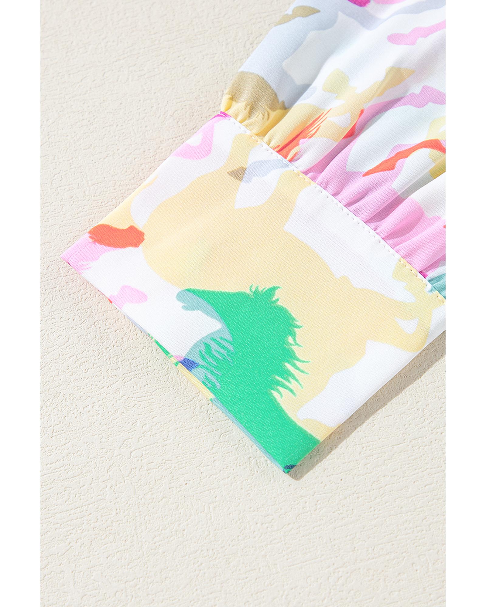 White Colorful Horse Printed Long Sleeve Button Up Casual Shirt – XL
