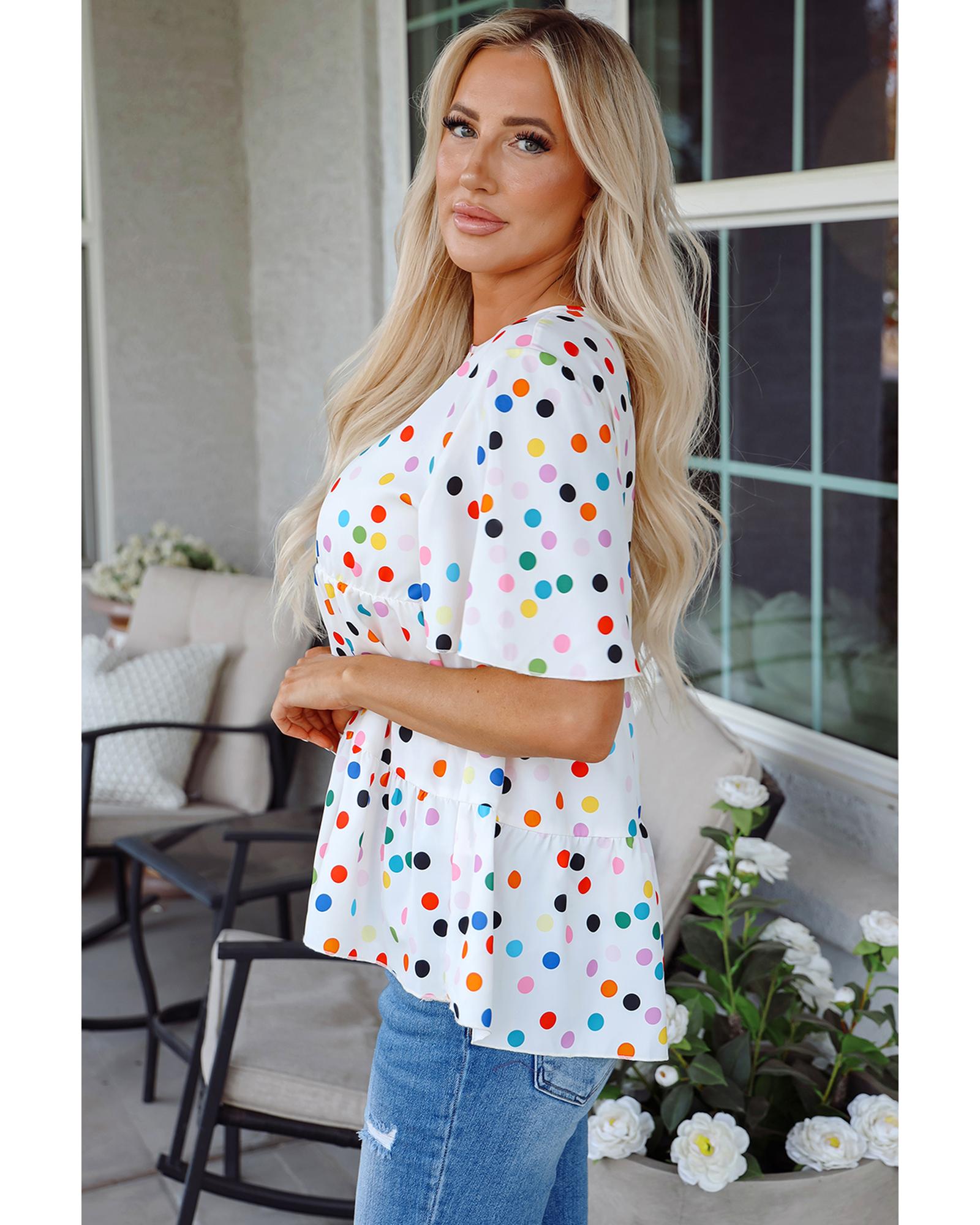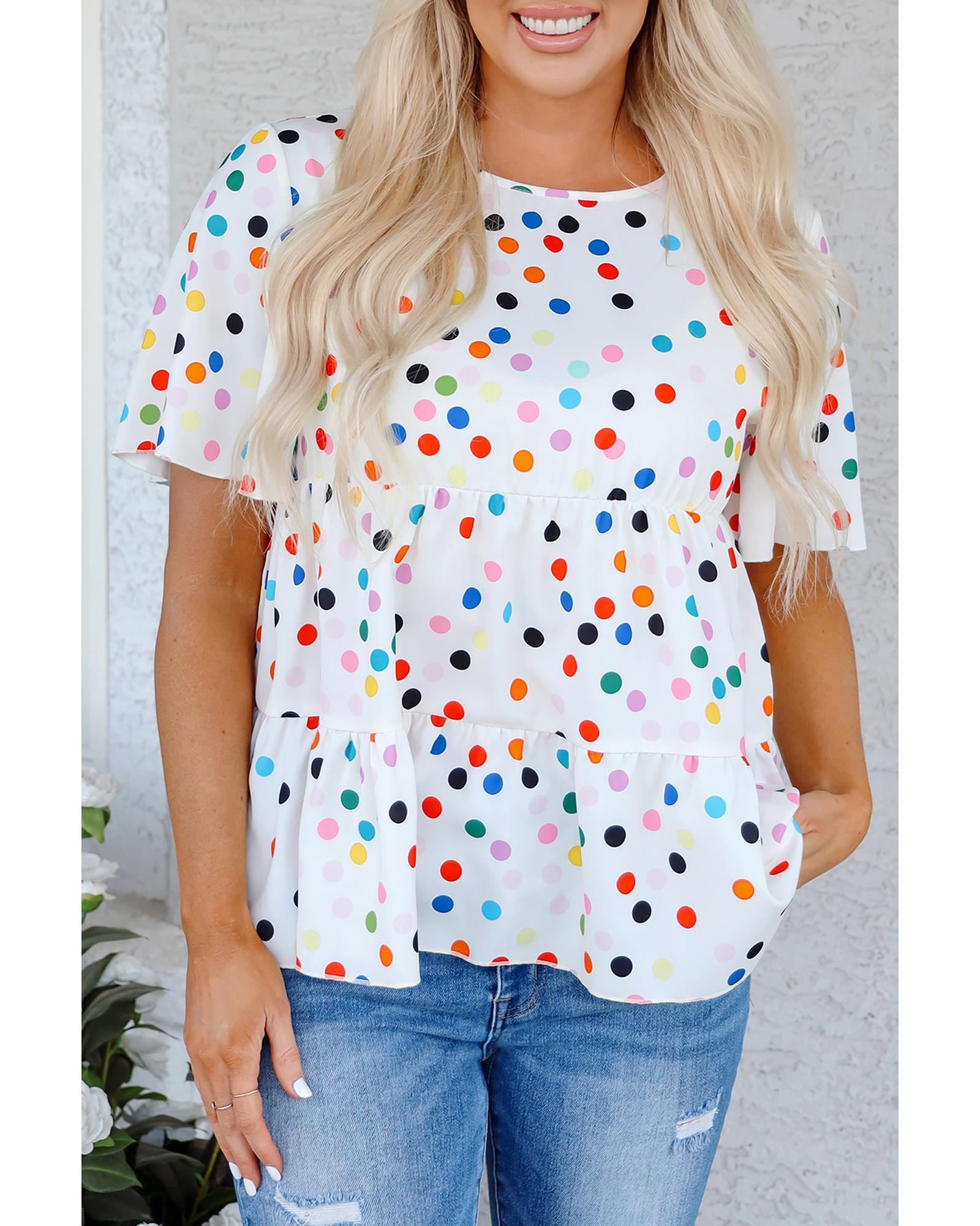 White Colorful Polka Dot Short Sleeve Tiered Ruffled Babydoll Blouse – M