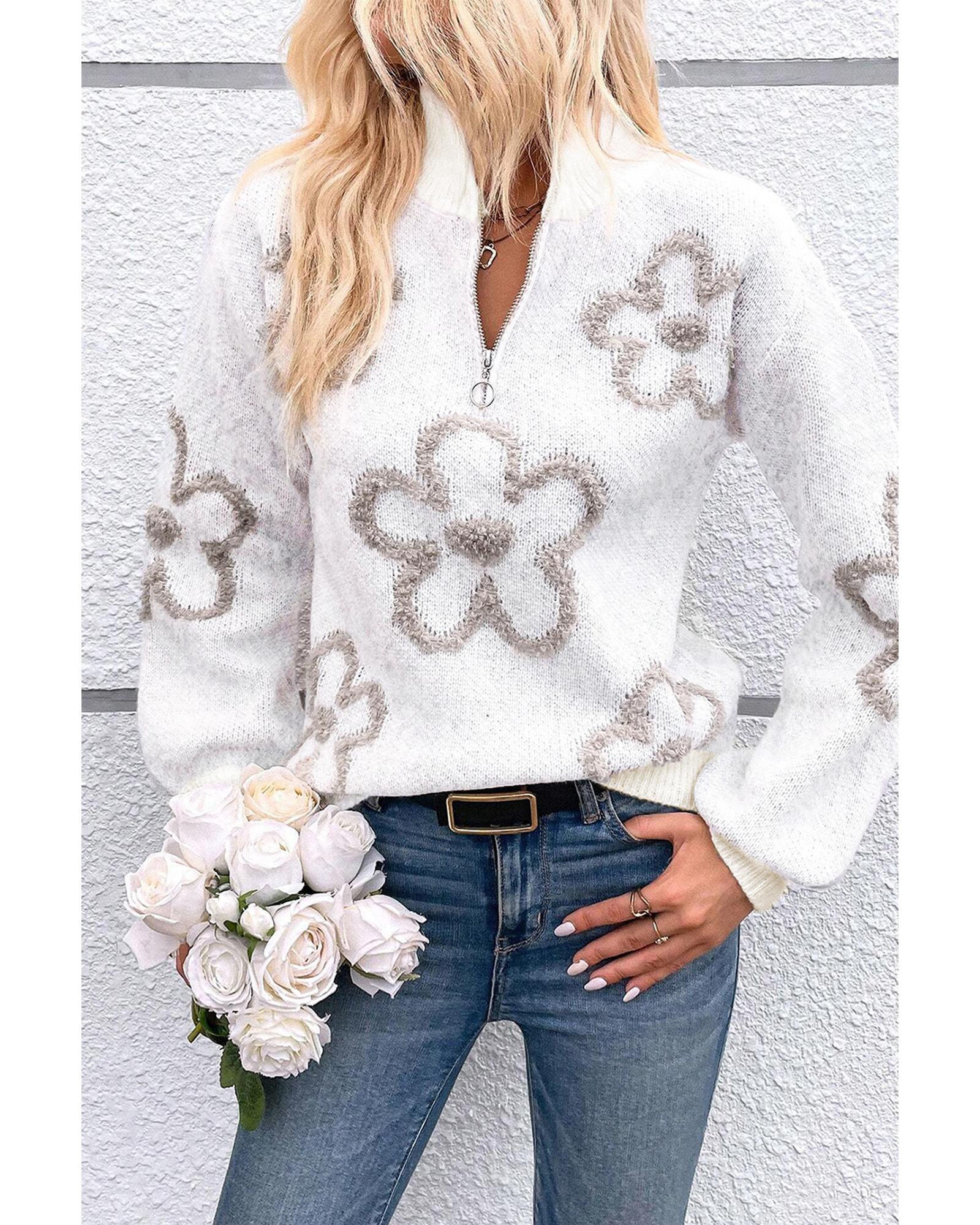 White Contrast Flower Half Zipper Stand Neck Sweater – XL