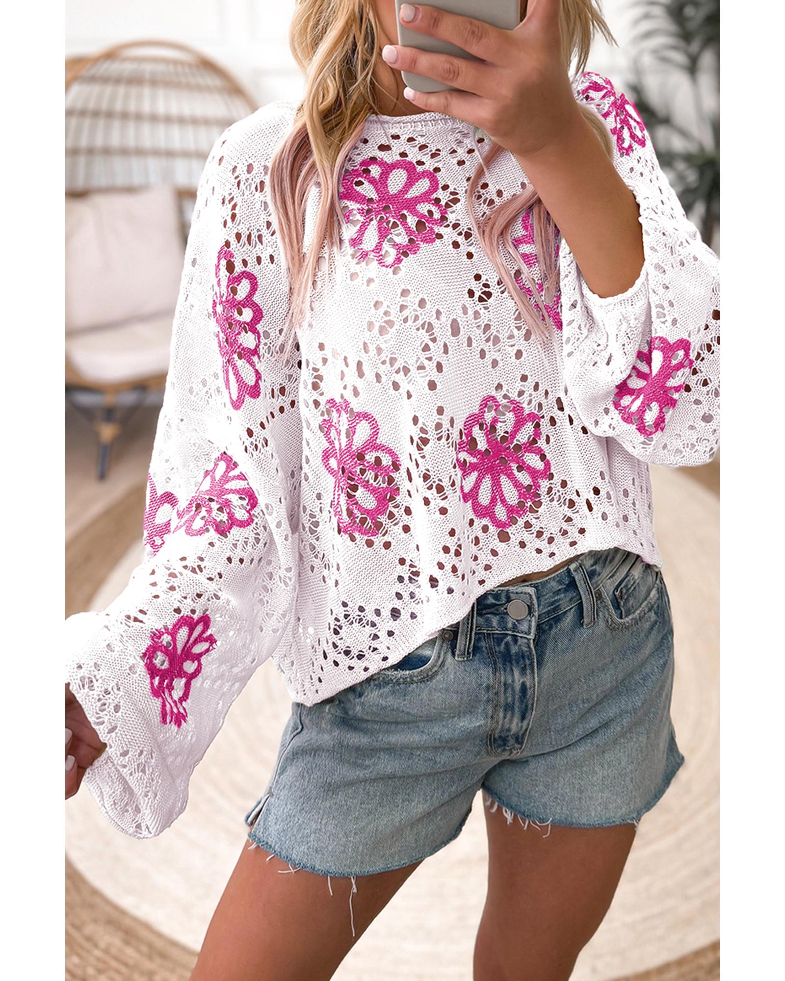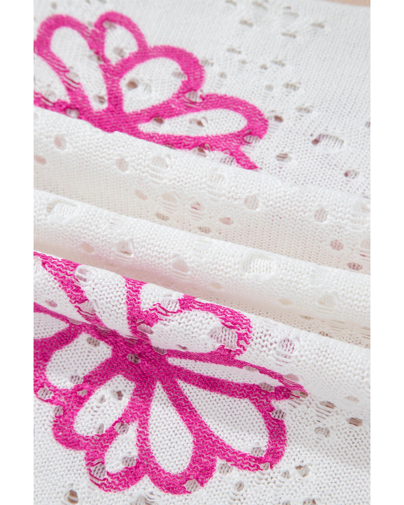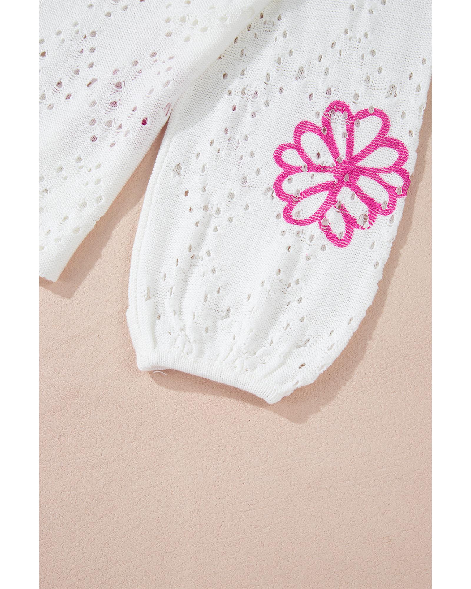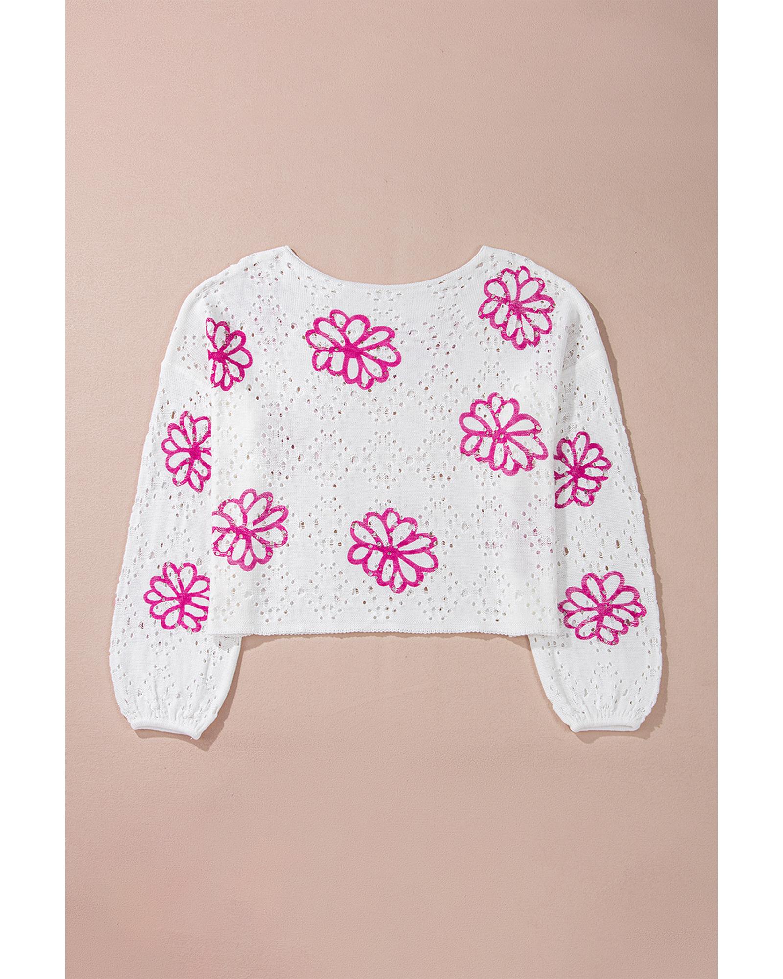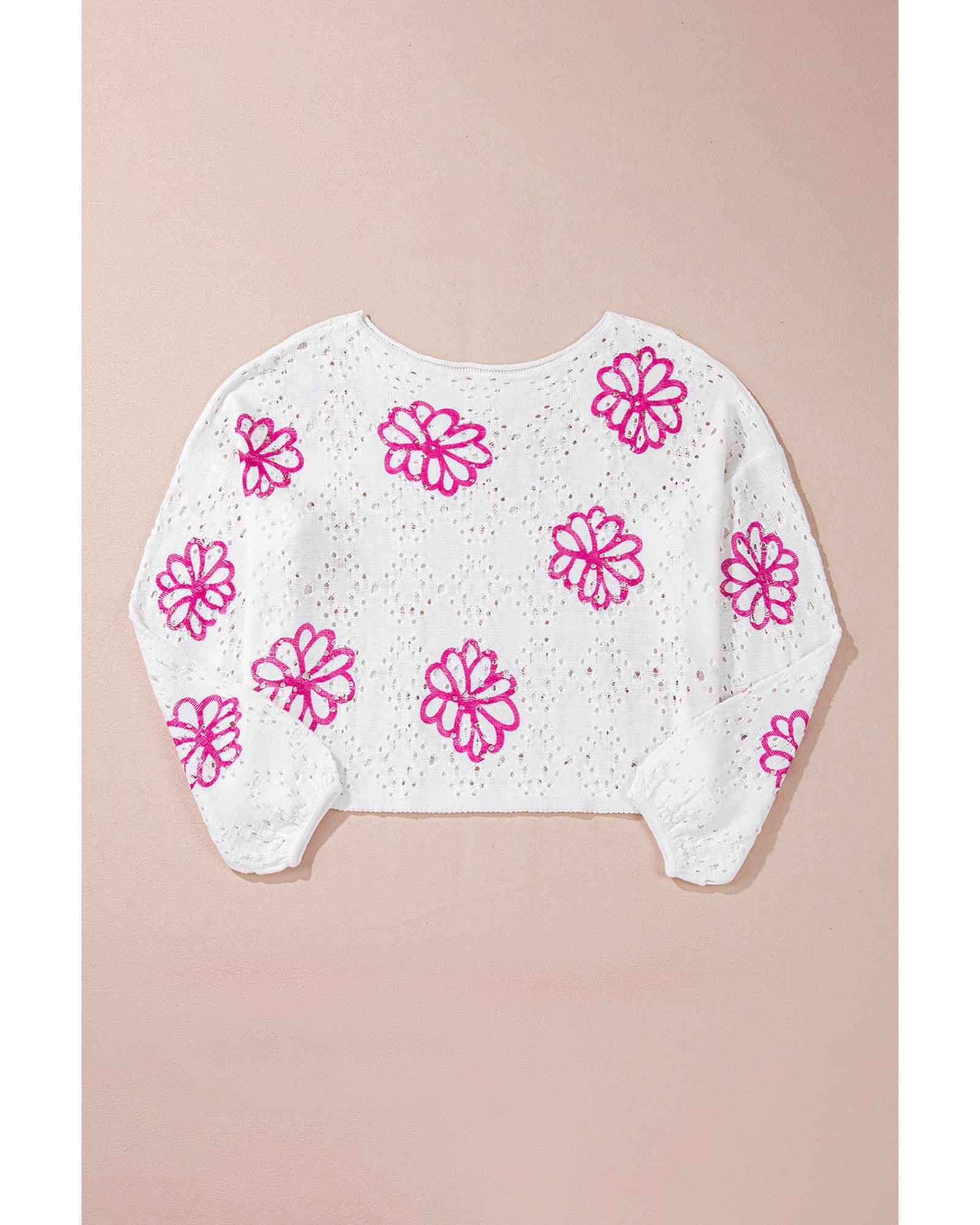 - White Contrast Flower Print Eyelet Drop Shoulder Sweater