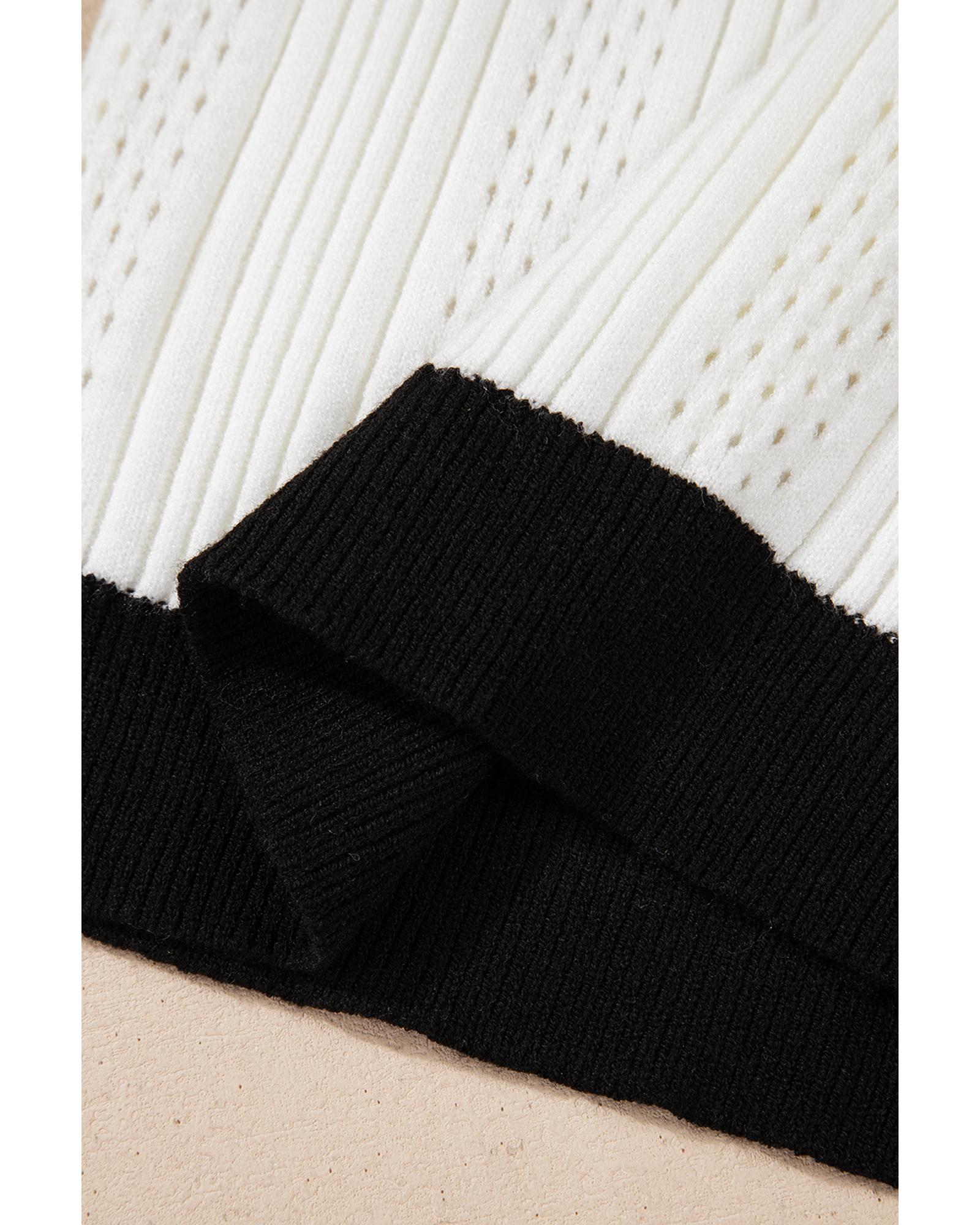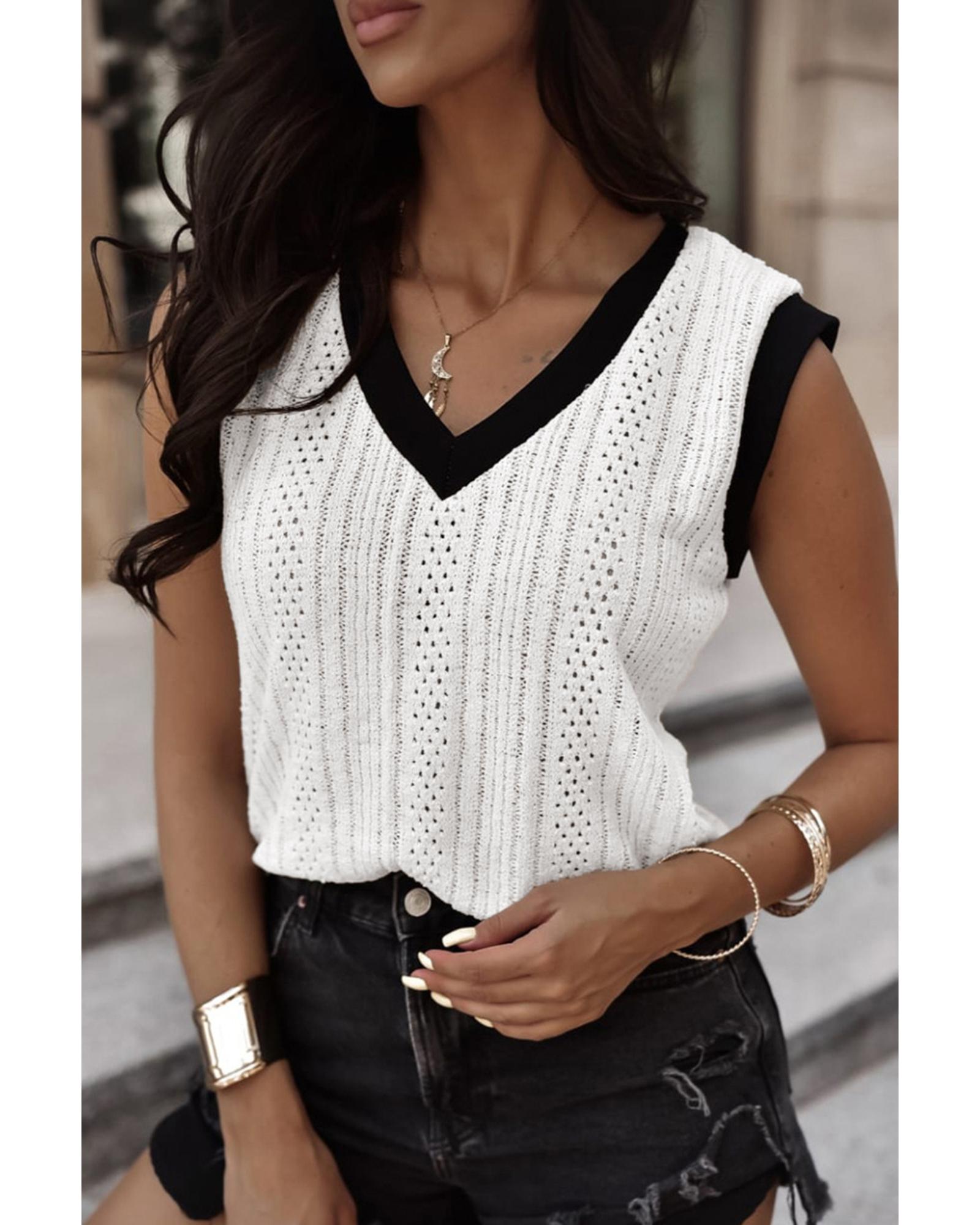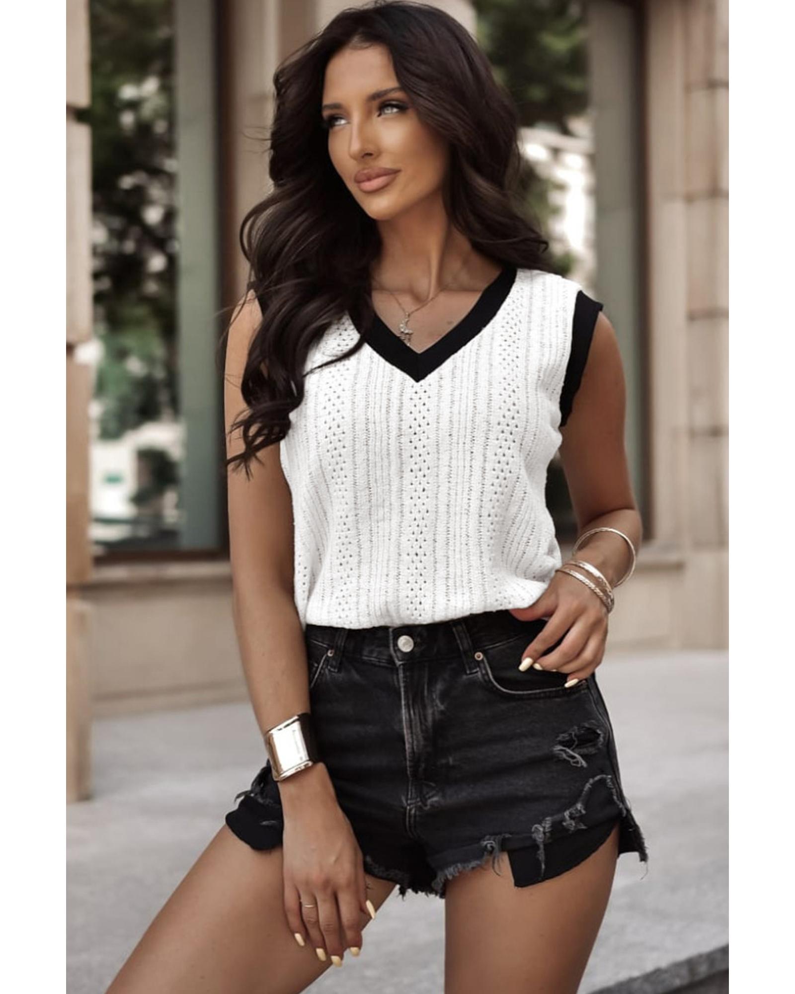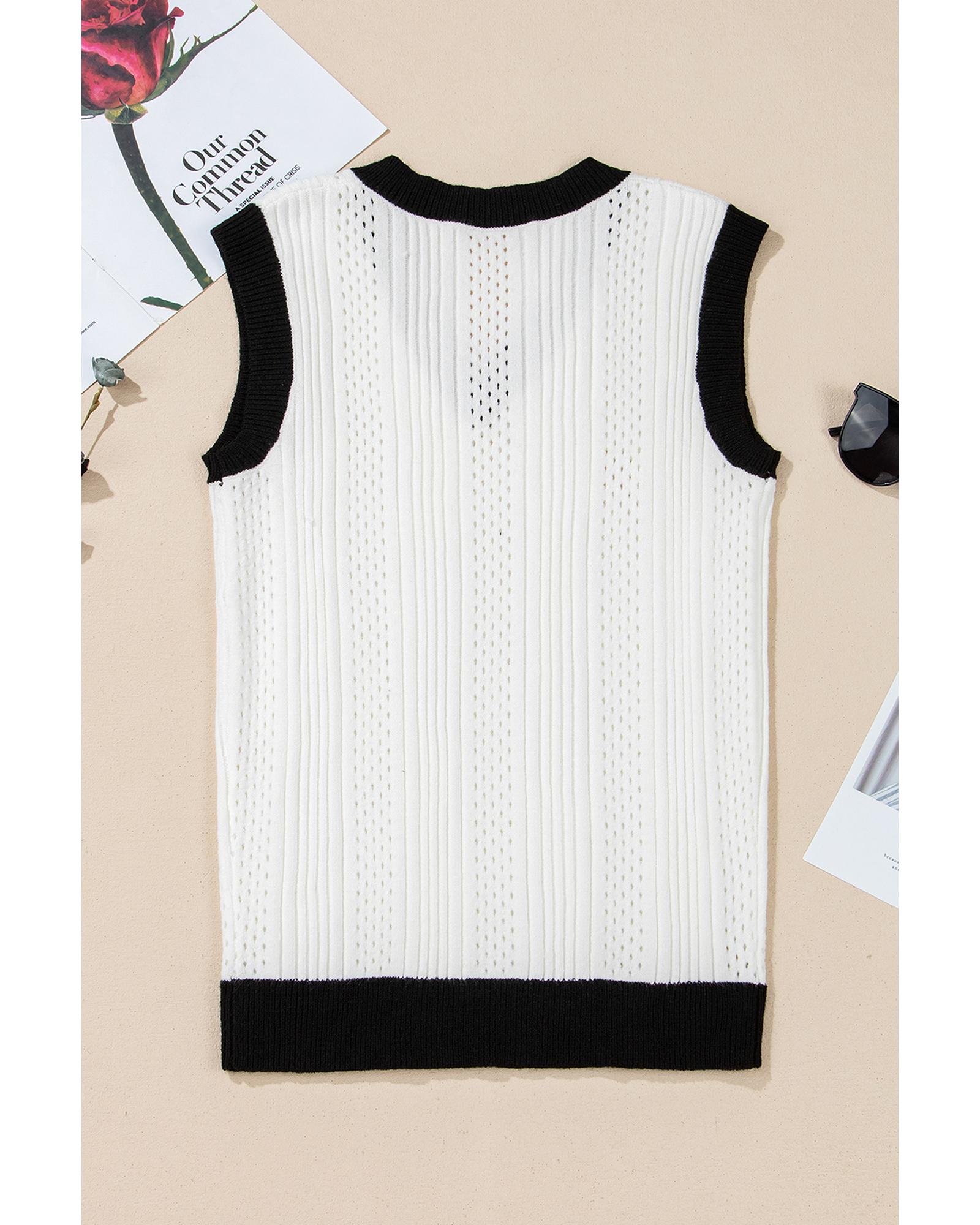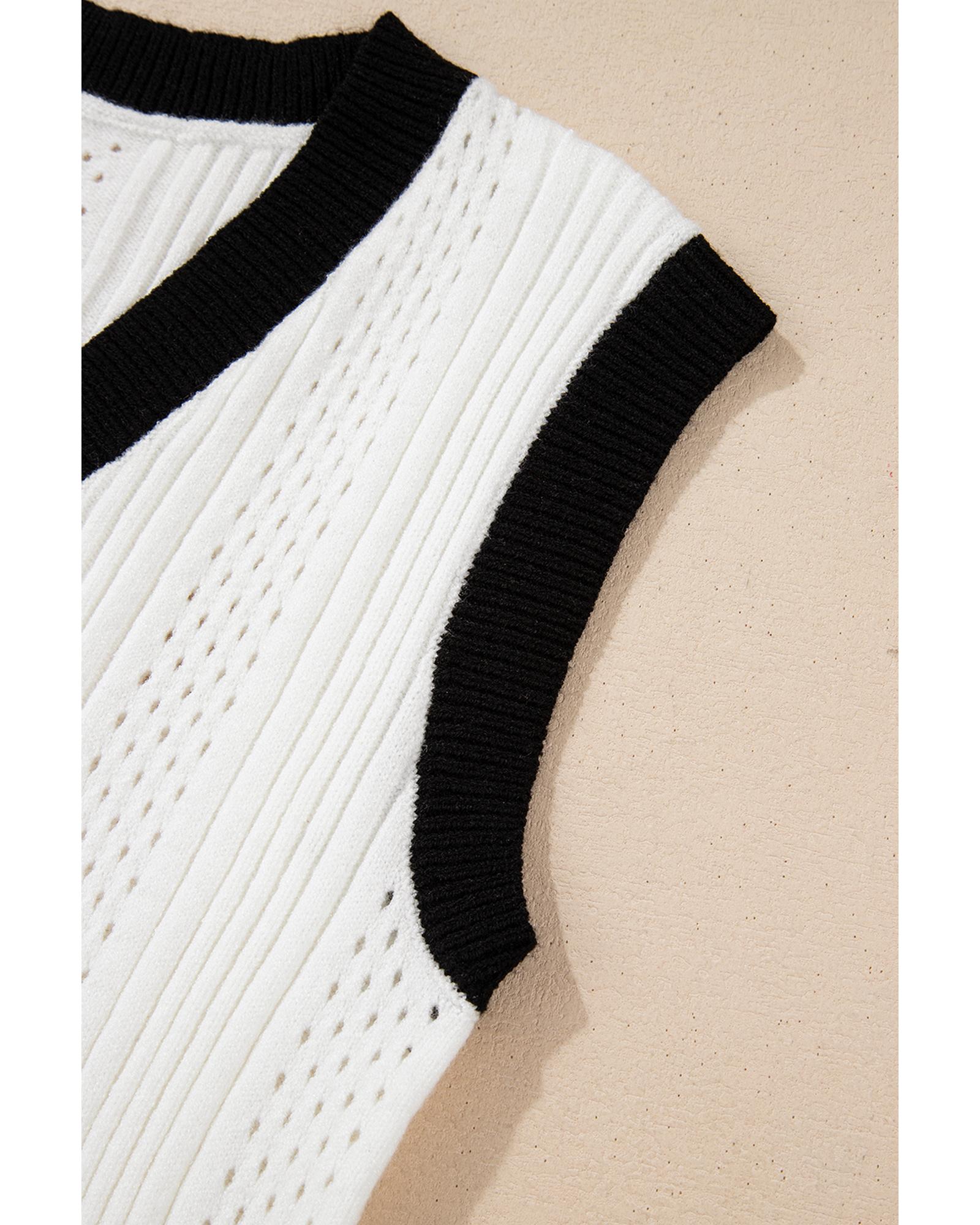 White Contrast Trim Eyelet Knit Colorblock V Neck Sweater Vest – L