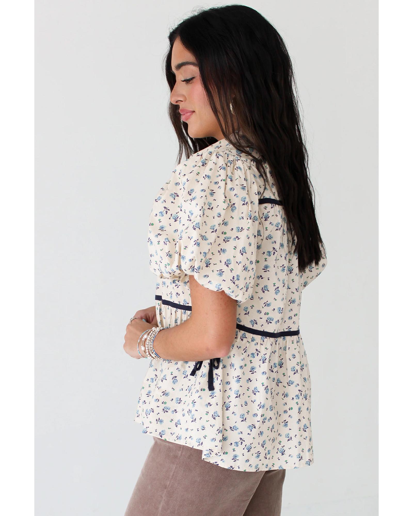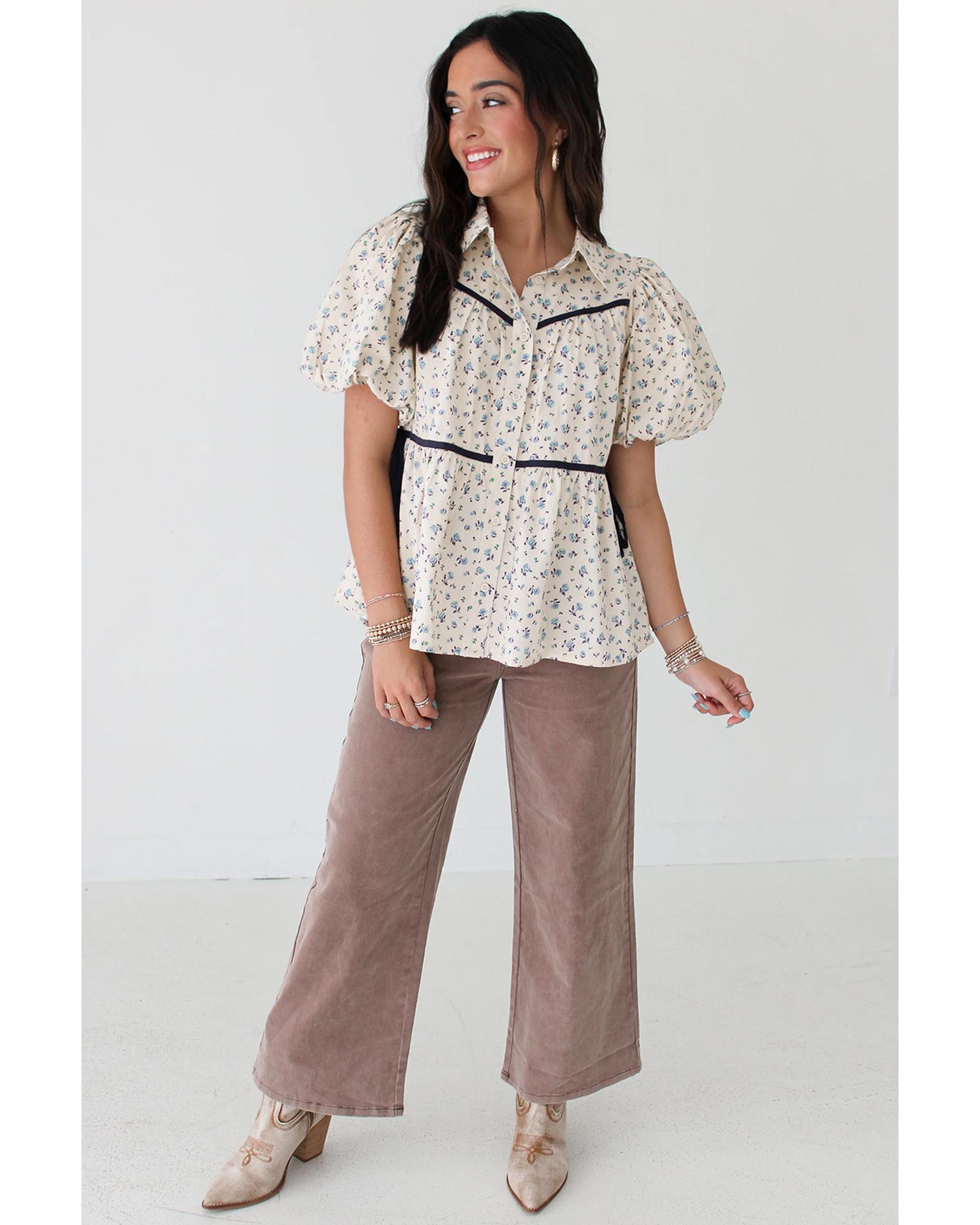 White Contrast Trim Floral Puff Short Sleeve Shirt – M