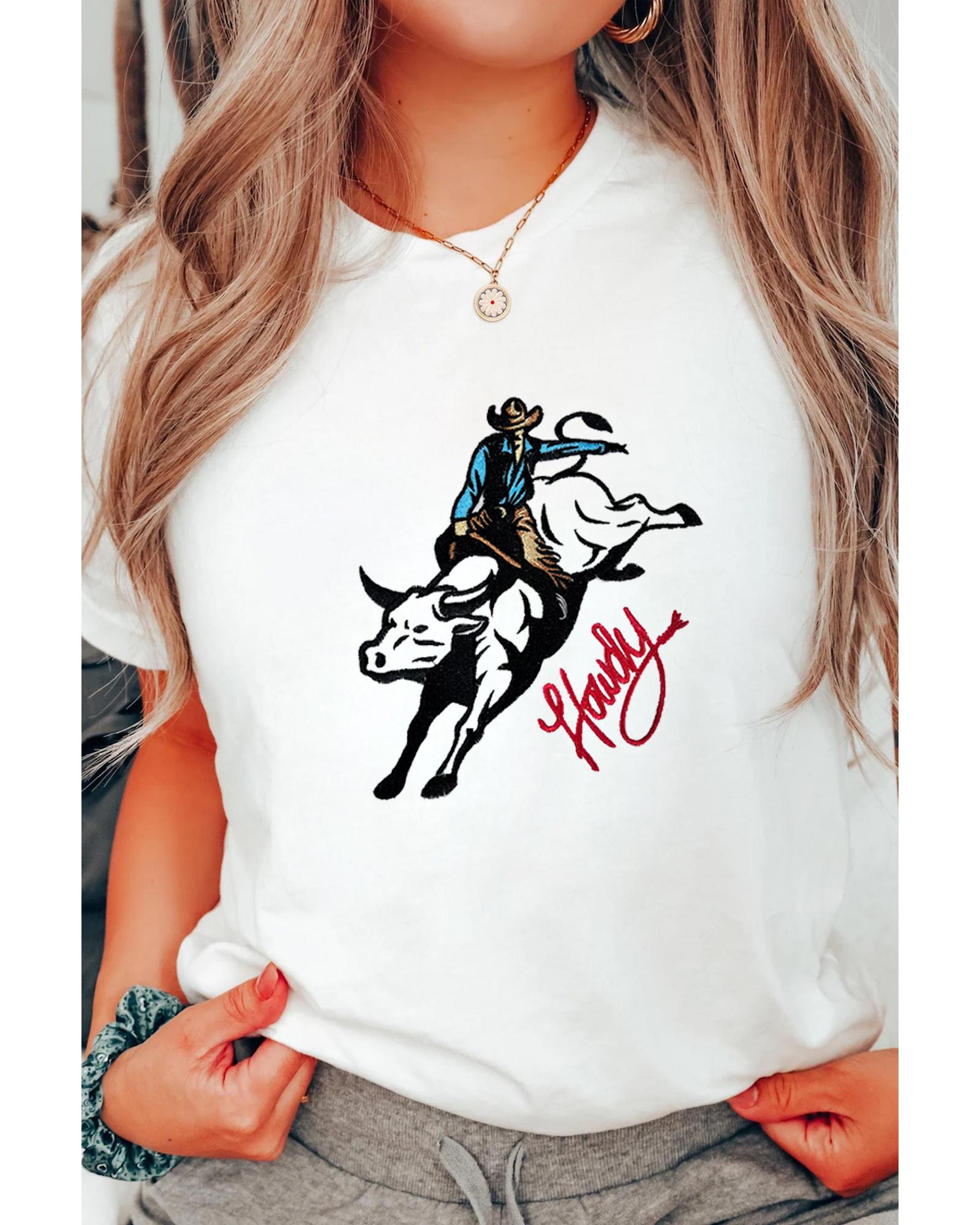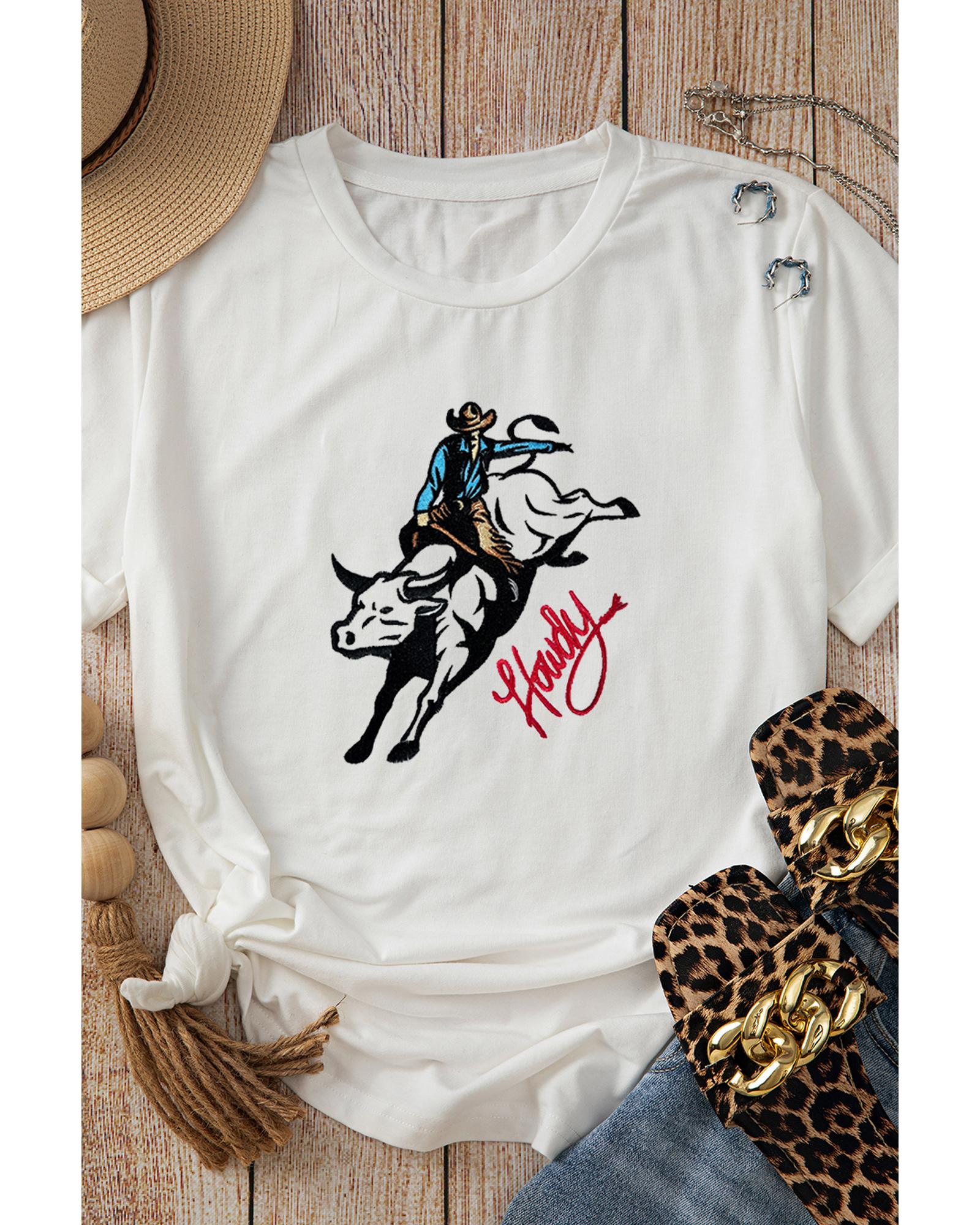 White Cowboy Howdy Embroidered Western Fashion T Shirt – M