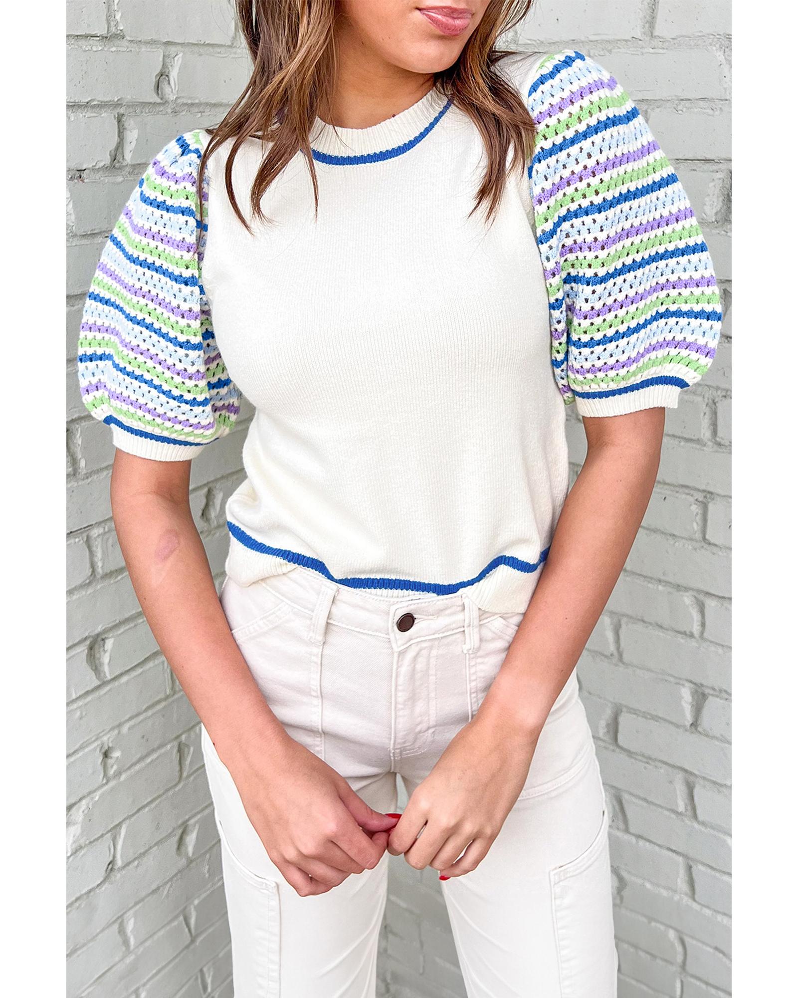 White Crochet Striped Bubble Sleeve Knit Sweater – XL