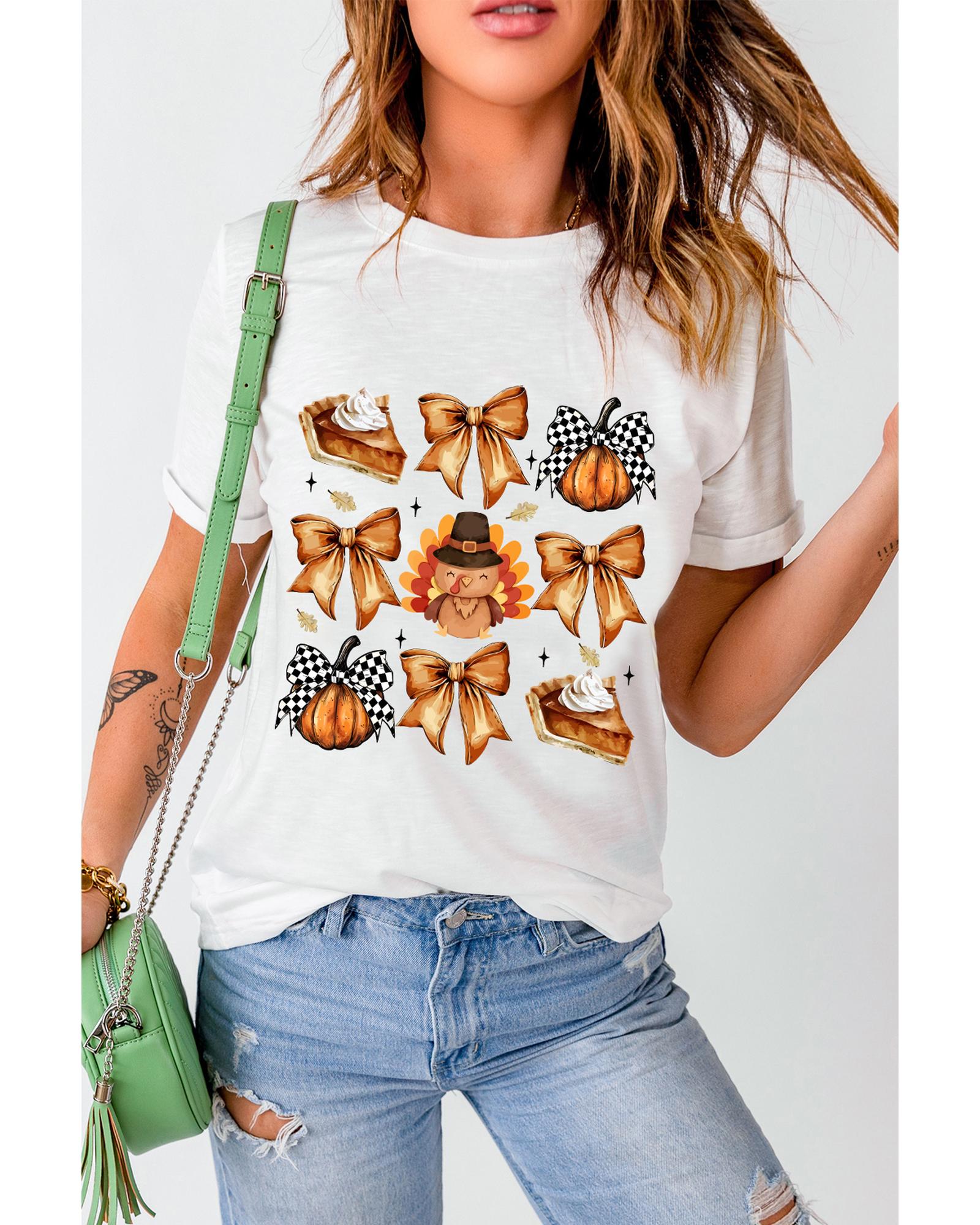 White Cute Bowknot Tanksgiving Graphic Crewneck T Shirt – M