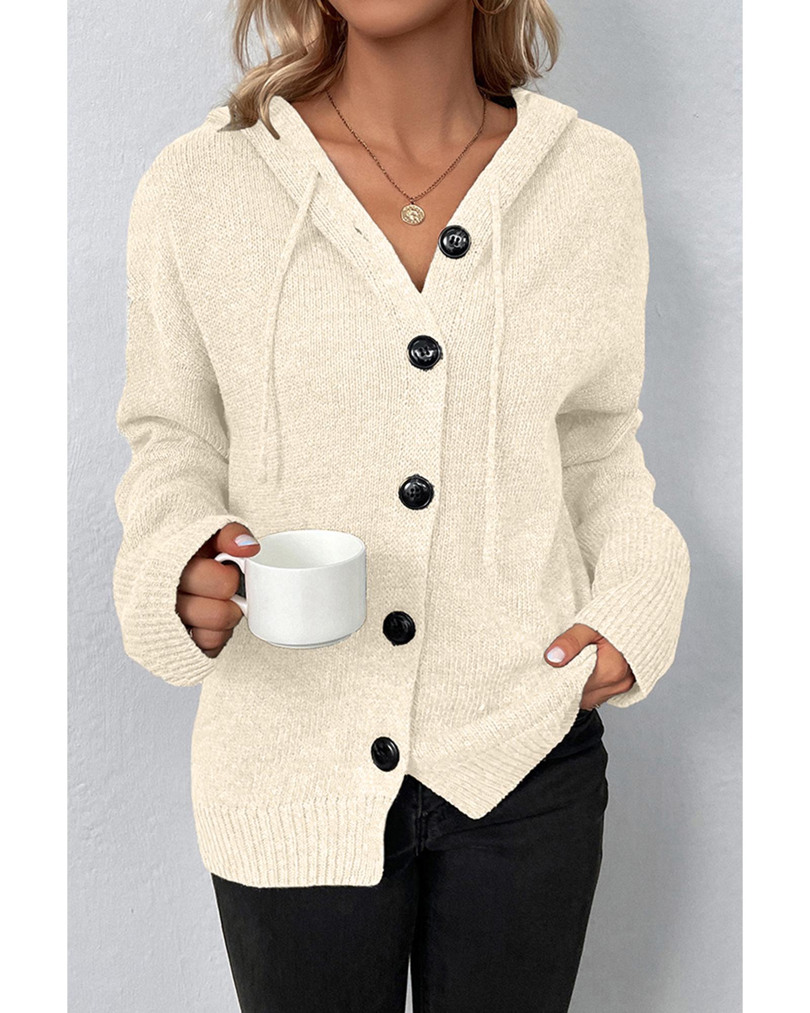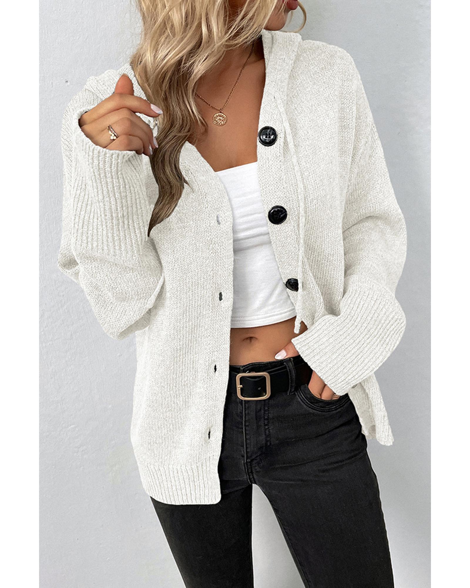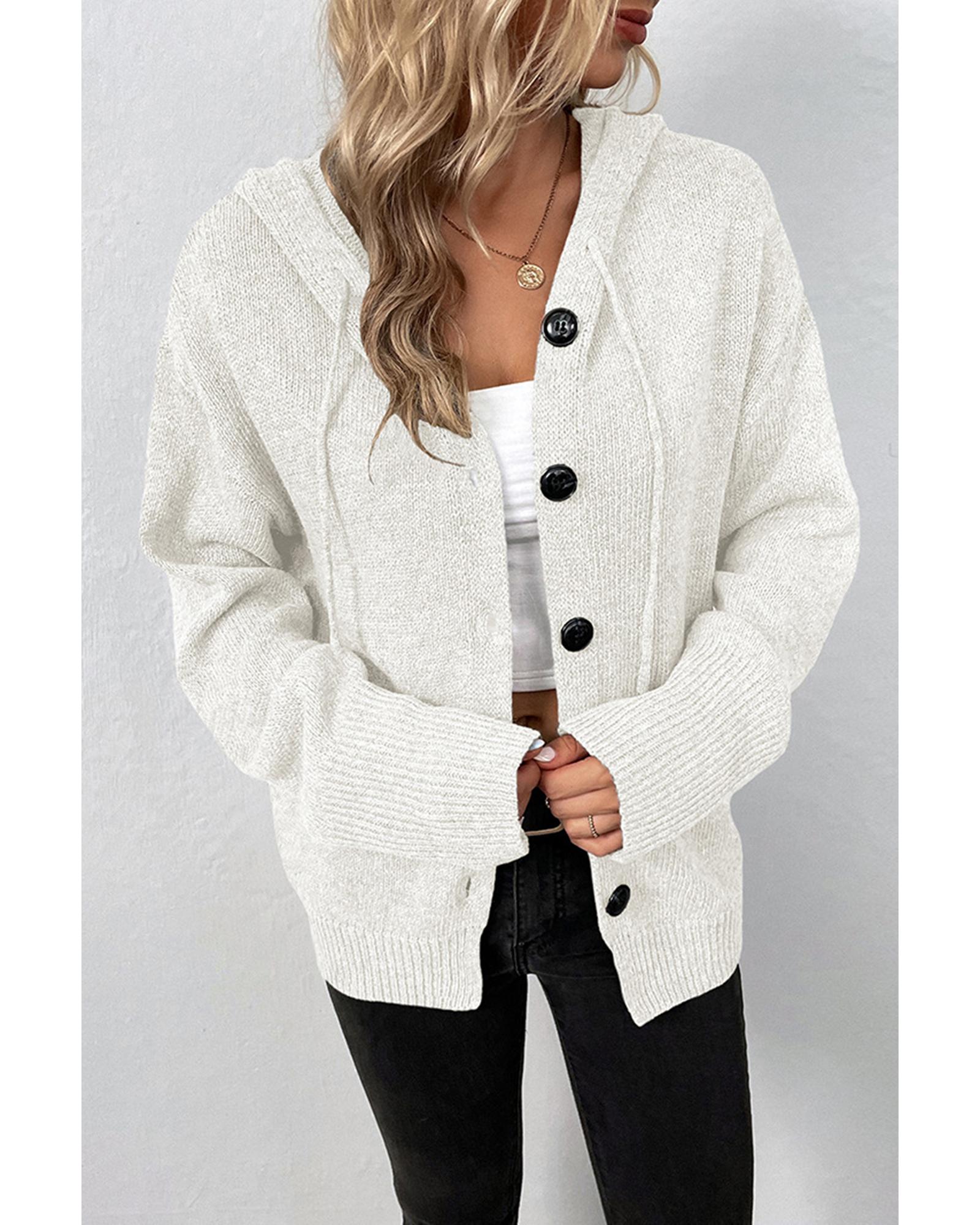 White Drawstring Hooded Button Up Drop Shoulder Sweater Cardigan – S