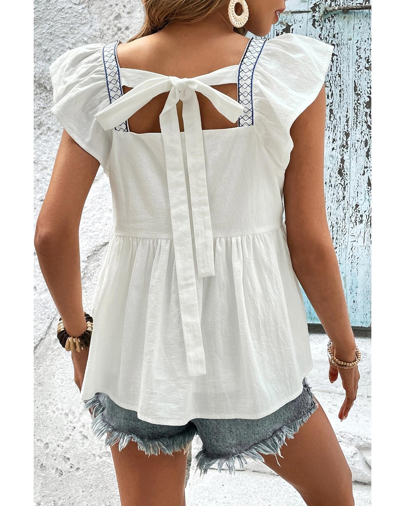 White Embroidered Bust Square Neck Peplum Blouse – L