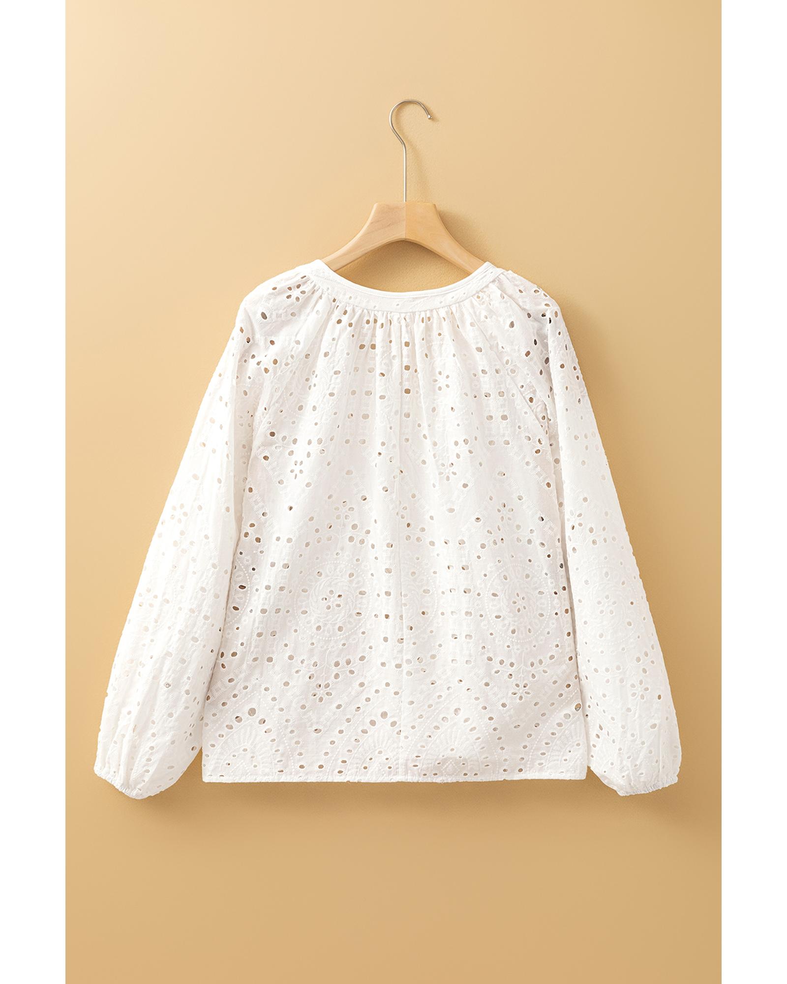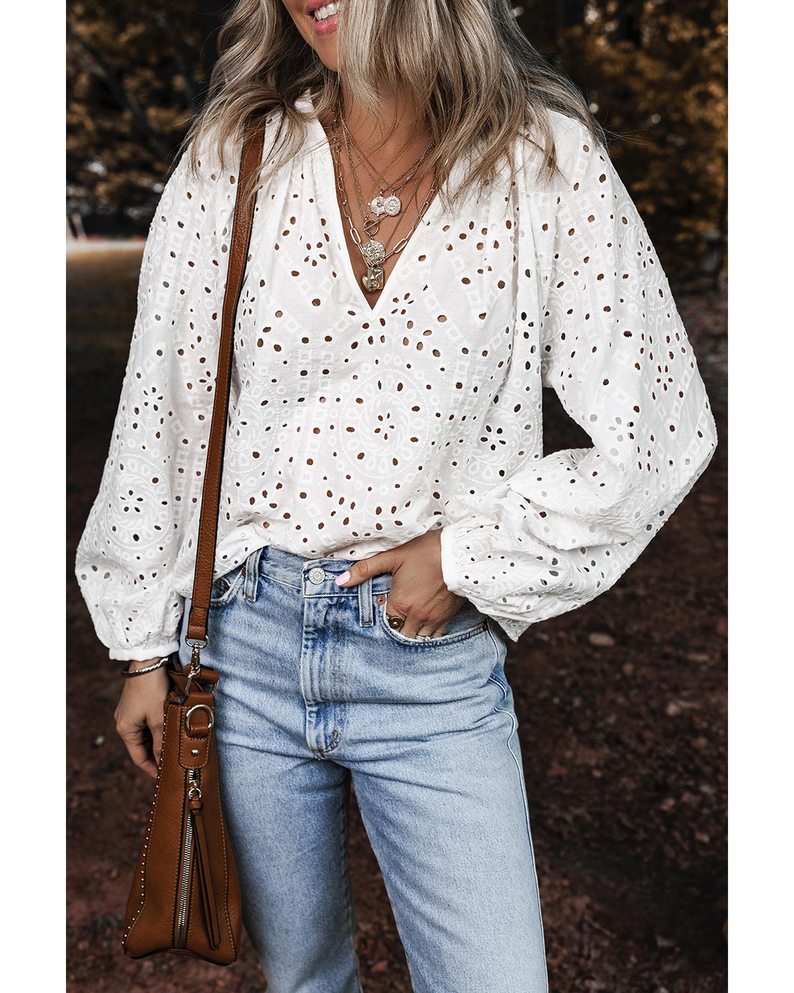 White Eyelet Embroidered Puff Sleeve V Neck Blouse – M