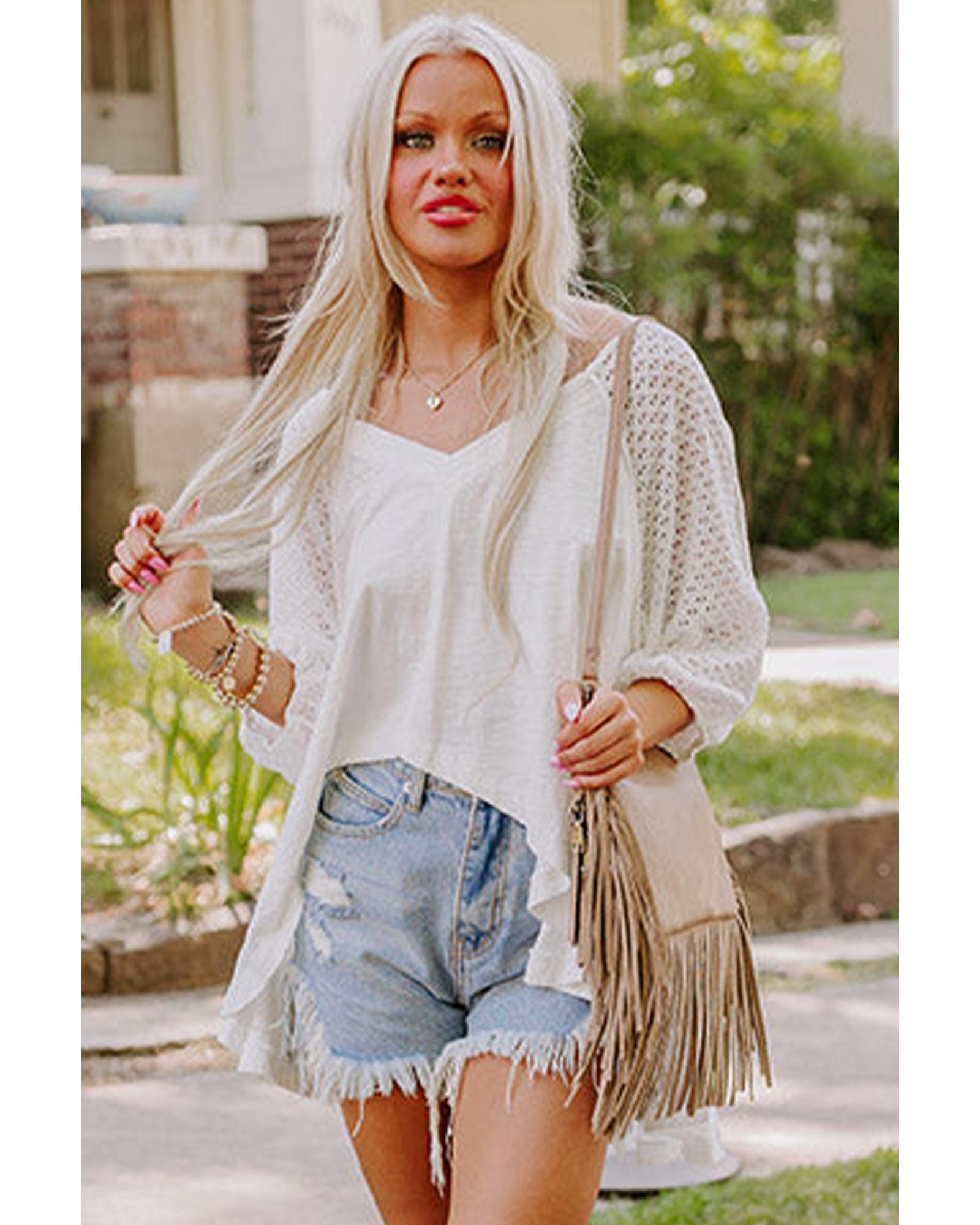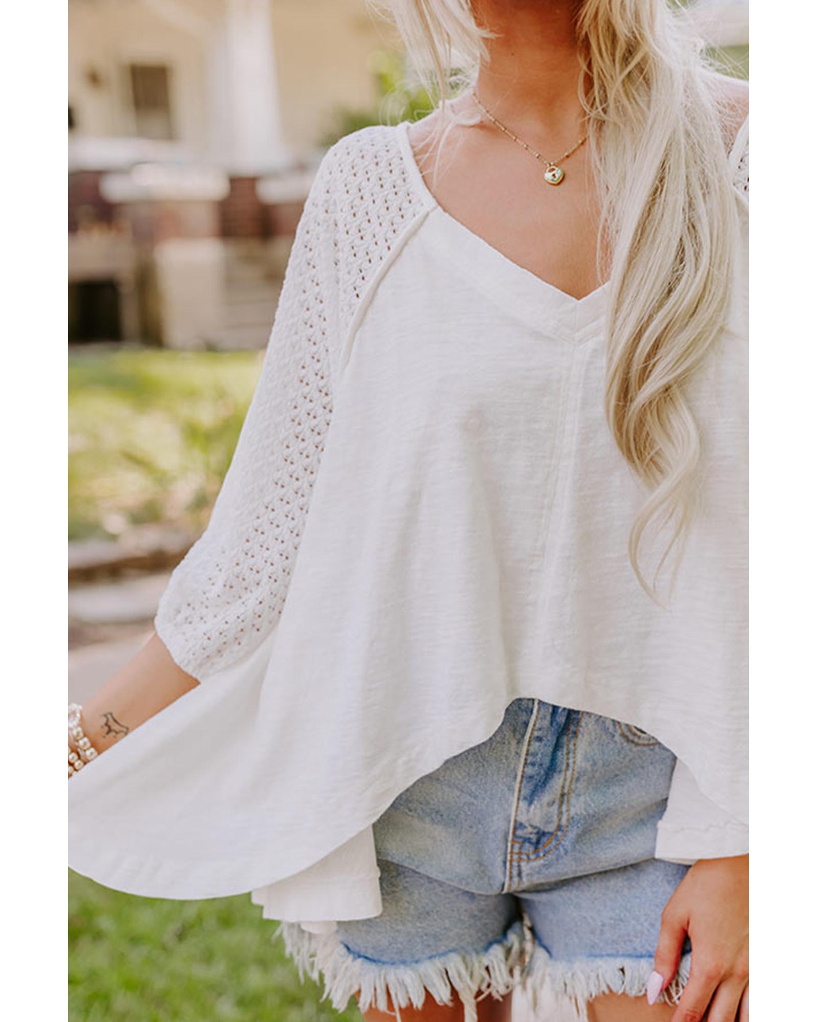 White Eyelet Patchwork High Low Hem V Neck Oversized Top – S