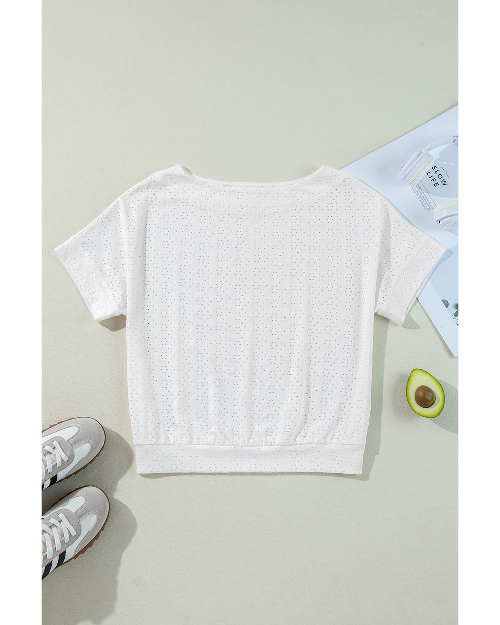 White Eyelet Pattern Boat Neck Casual Tee – S