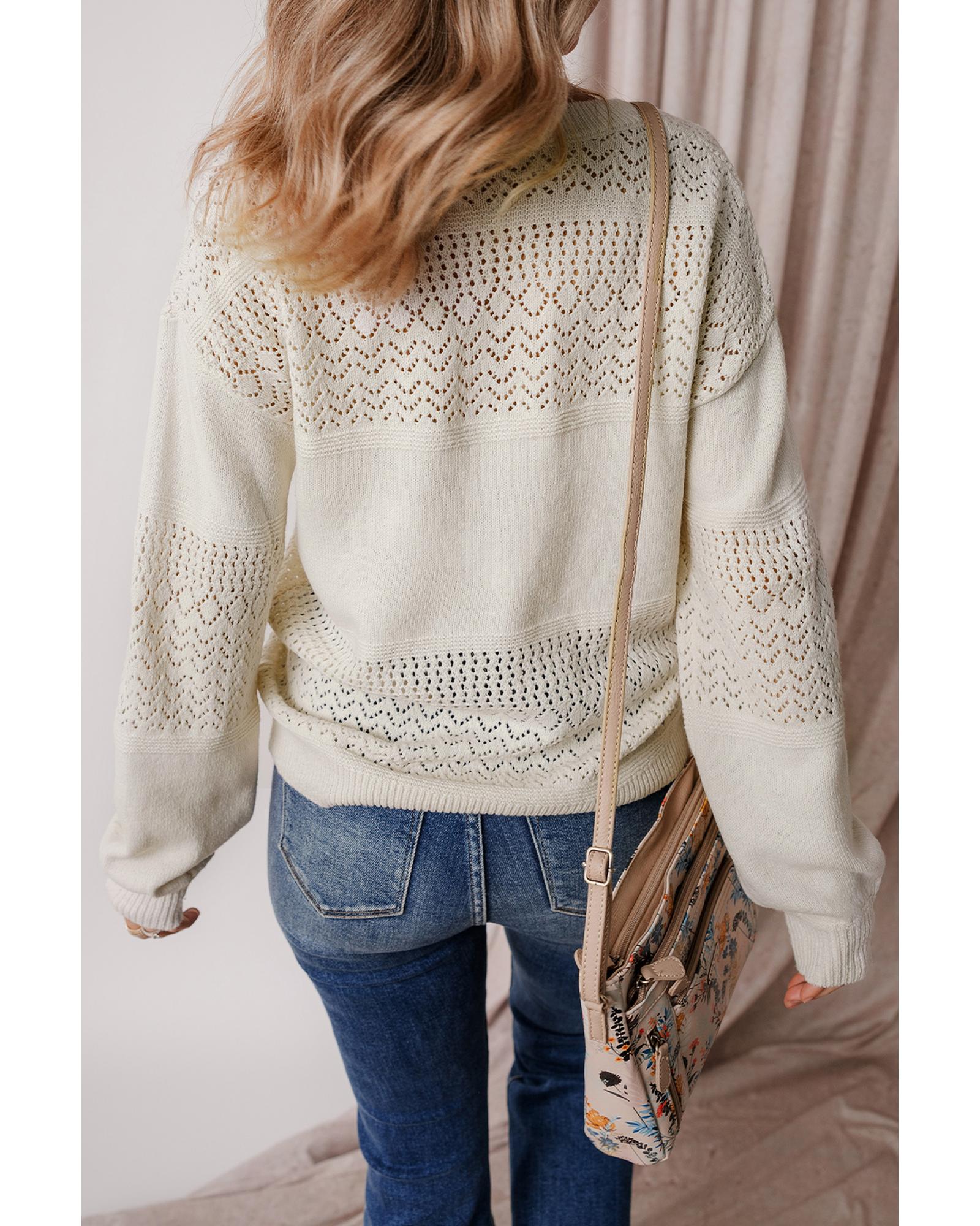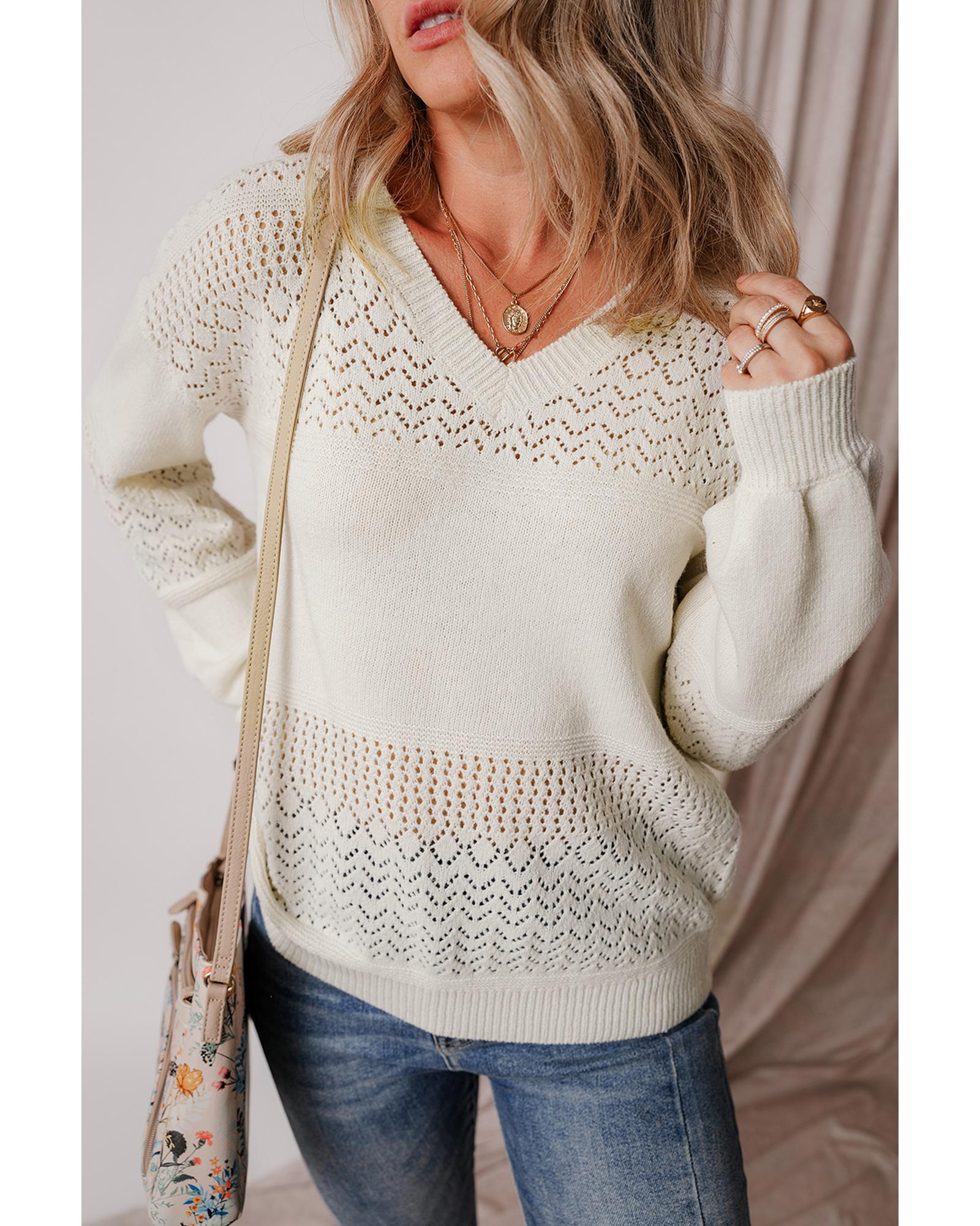 White Eyelet Pattern Detail V Neck Drop Shoulder Sweater – L