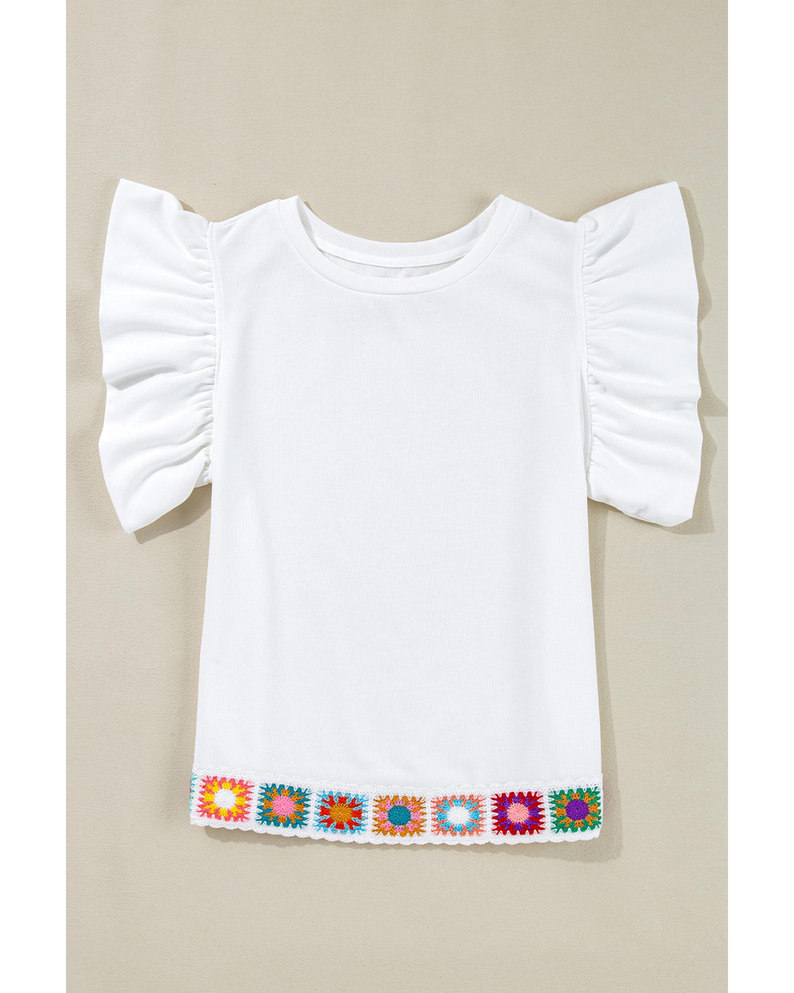 White Floral Crochet Patched Ruffled Sleeve Crewneck Blouse – M