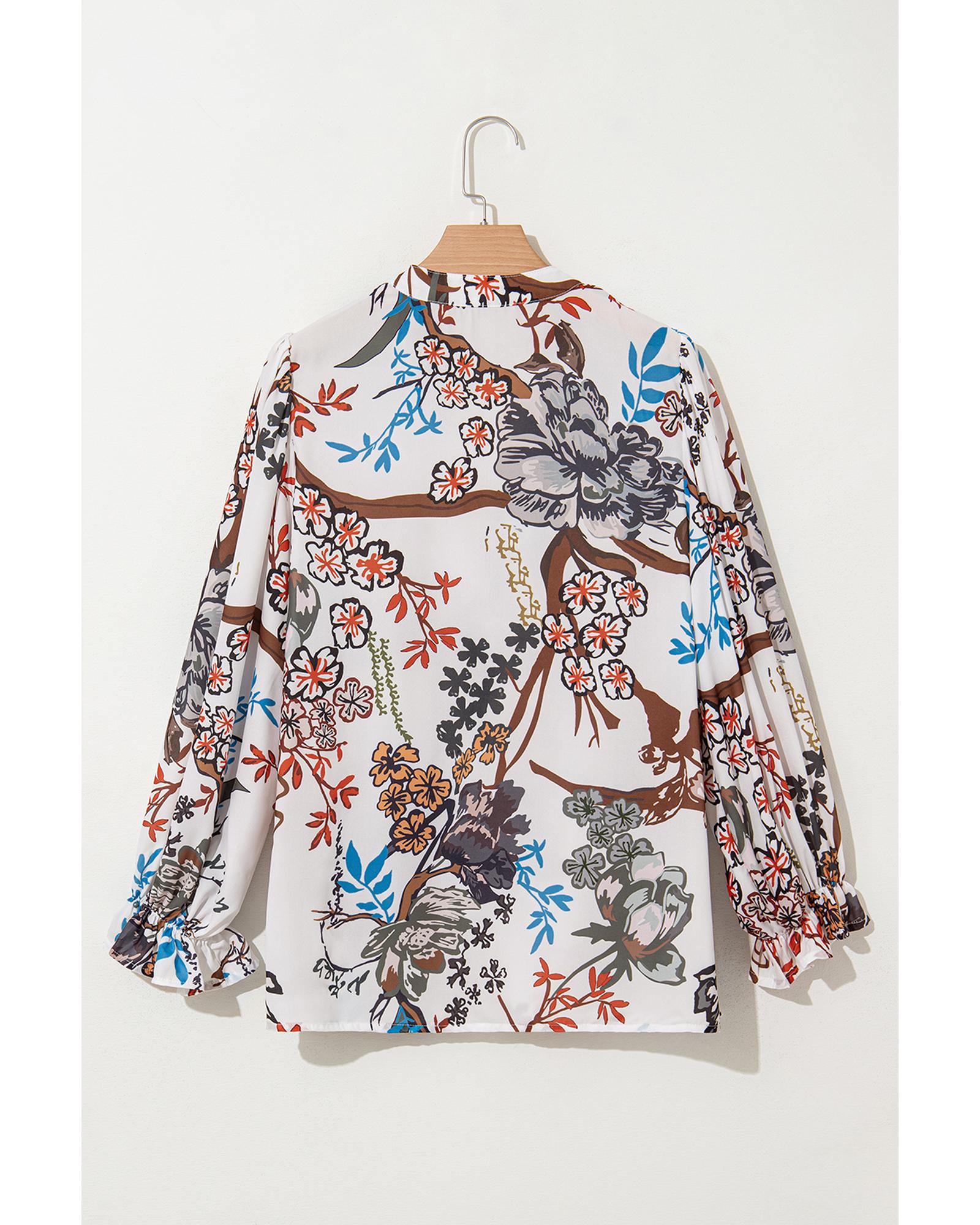 White Floral Print Balloon Sleeves Button Up Loose Casual Shirt – S