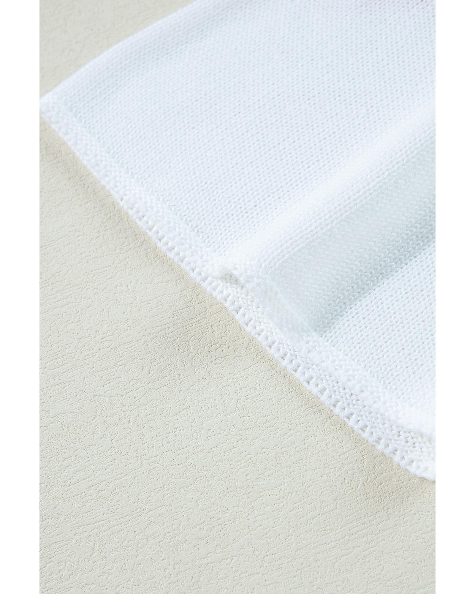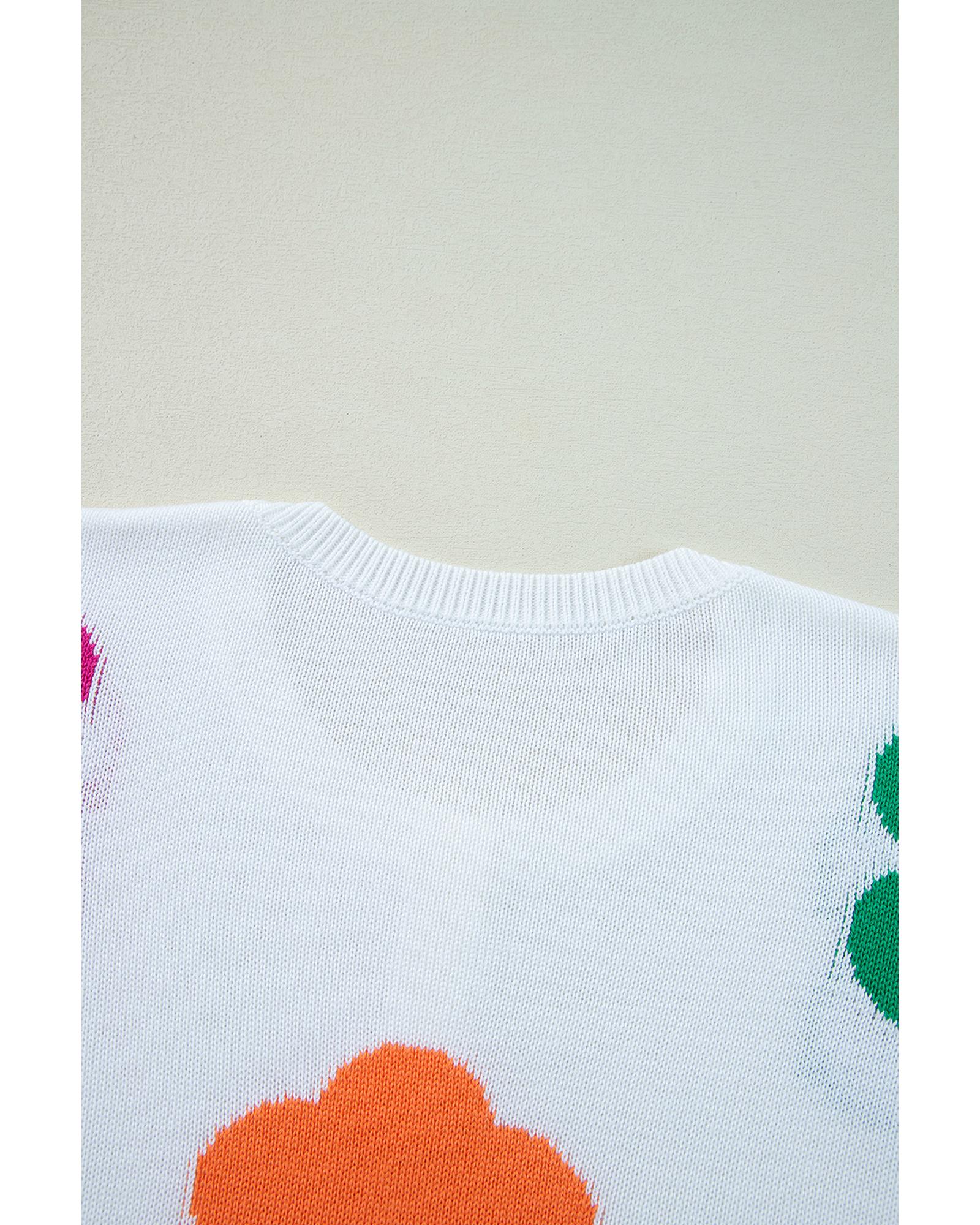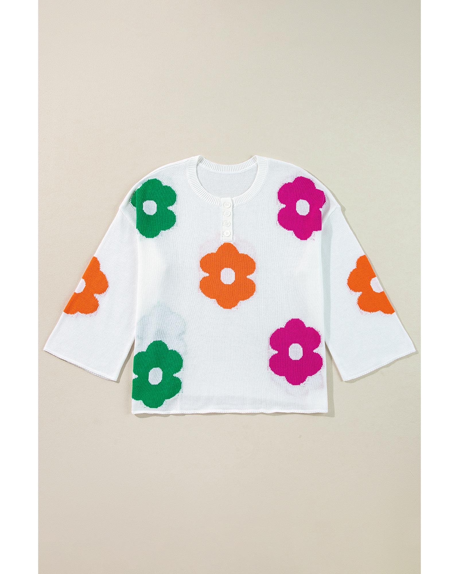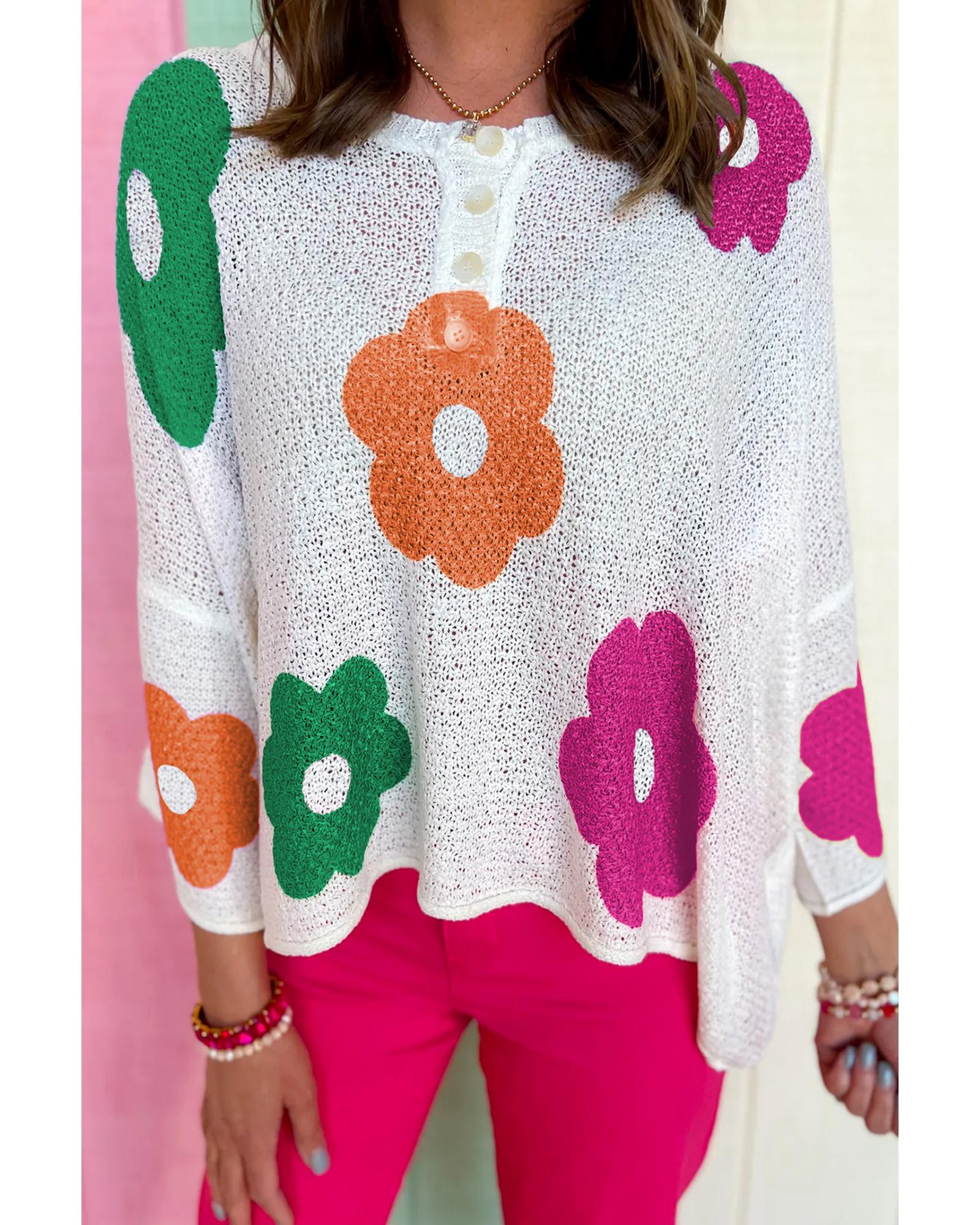White Floral Print Buttoned Loose Lightweight Sweater – M
