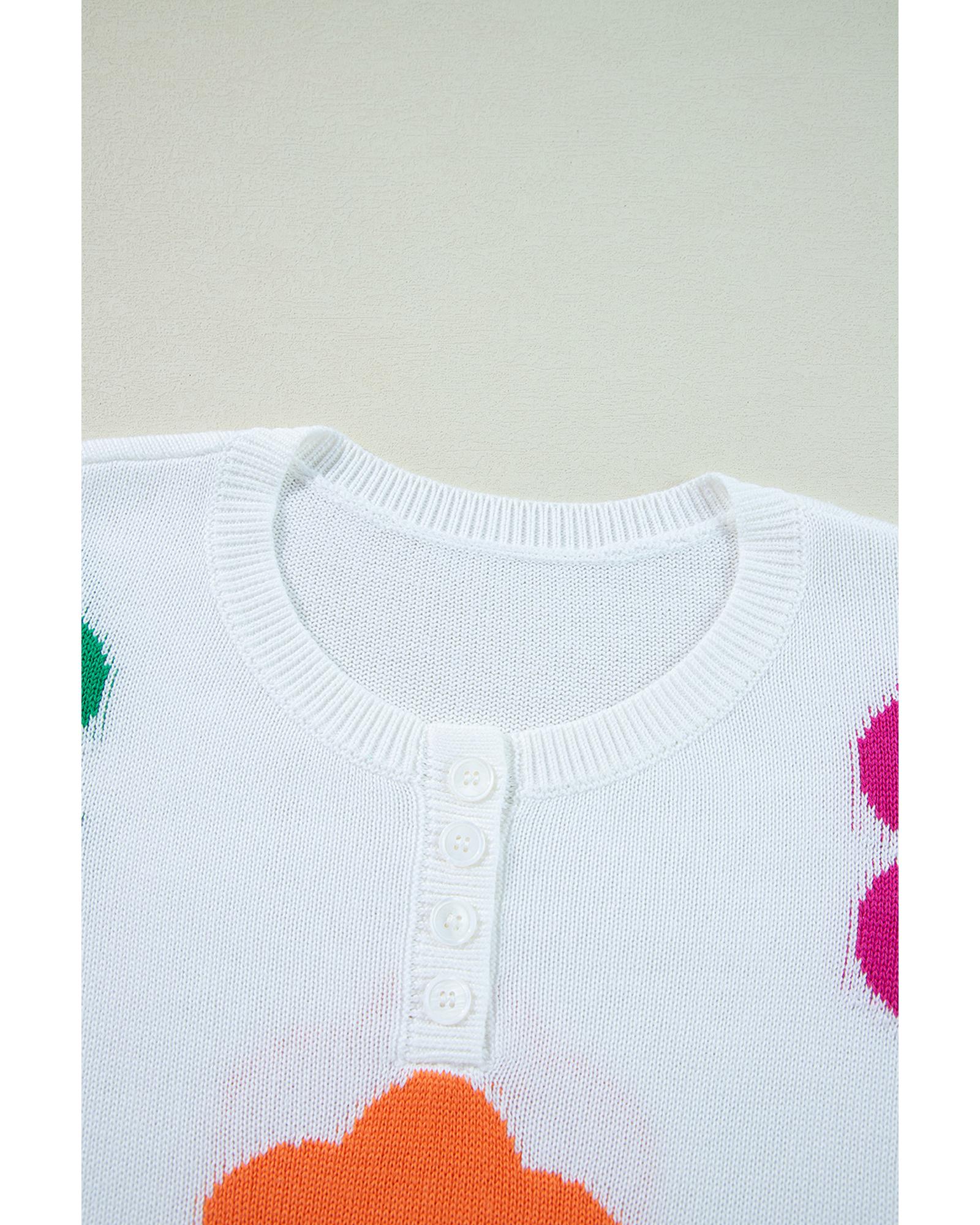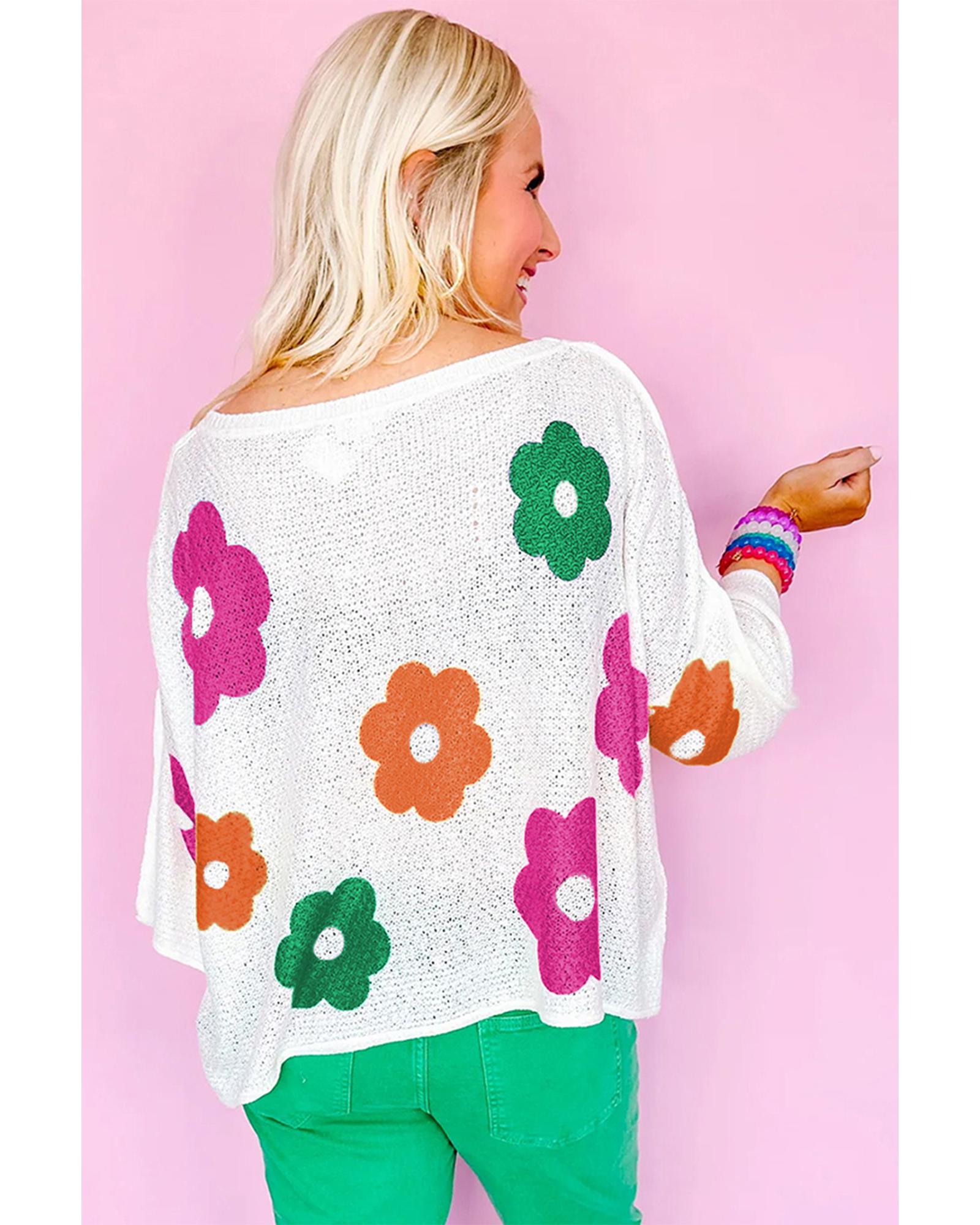 White Floral Print Buttoned Loose Lightweight Sweater – XL