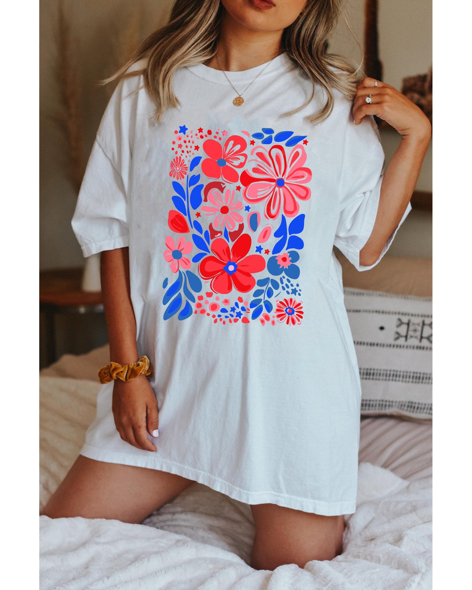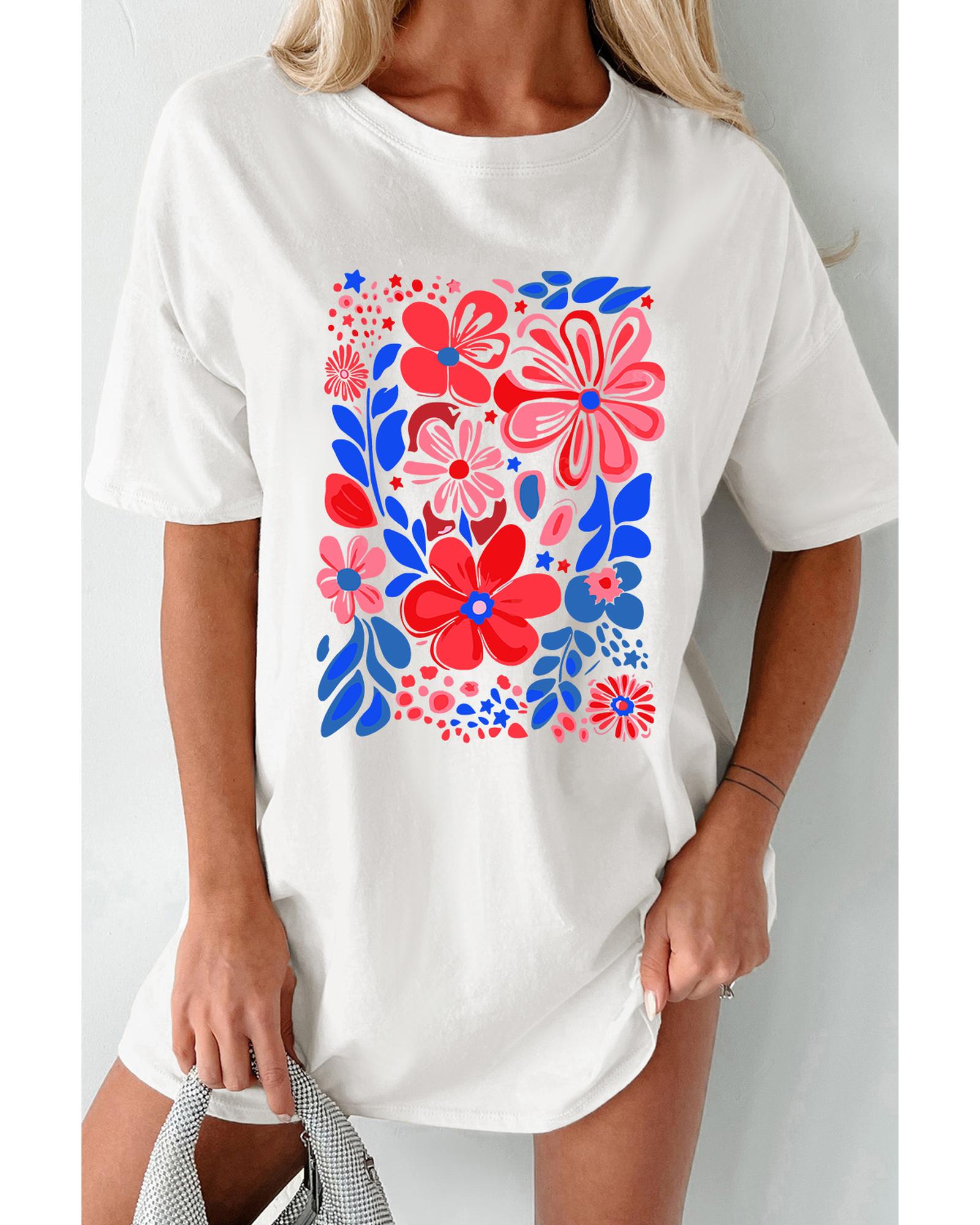 White Floral Print Half Sleeve Round Neck Oversized Tee – M