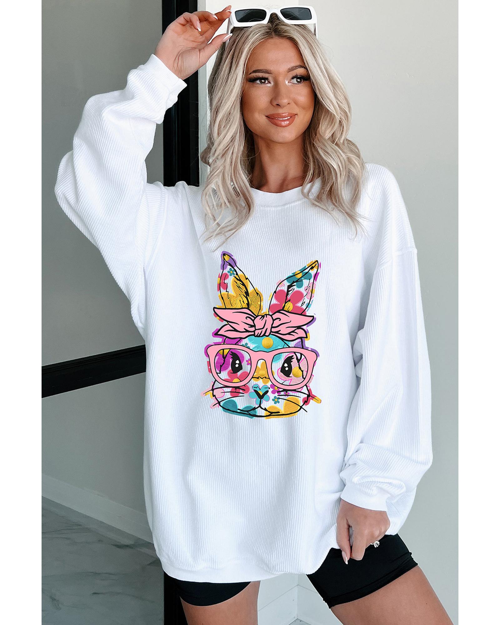 - White Floral Rabbit with Glasses Graphic Corded Easter Sweatshirt