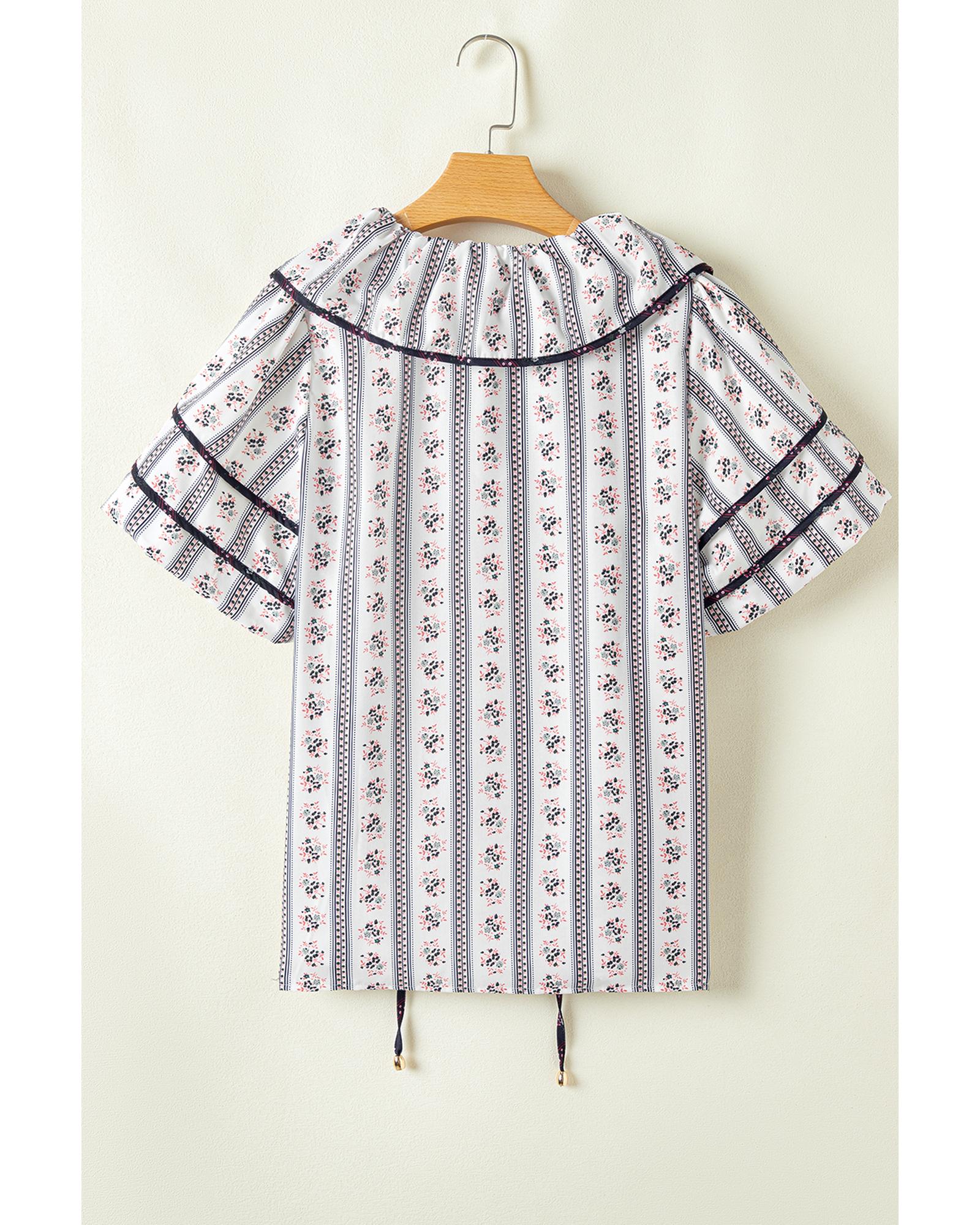 White Floral Ruffled Collar Short Puff Sleeve Printed Blouse – XL