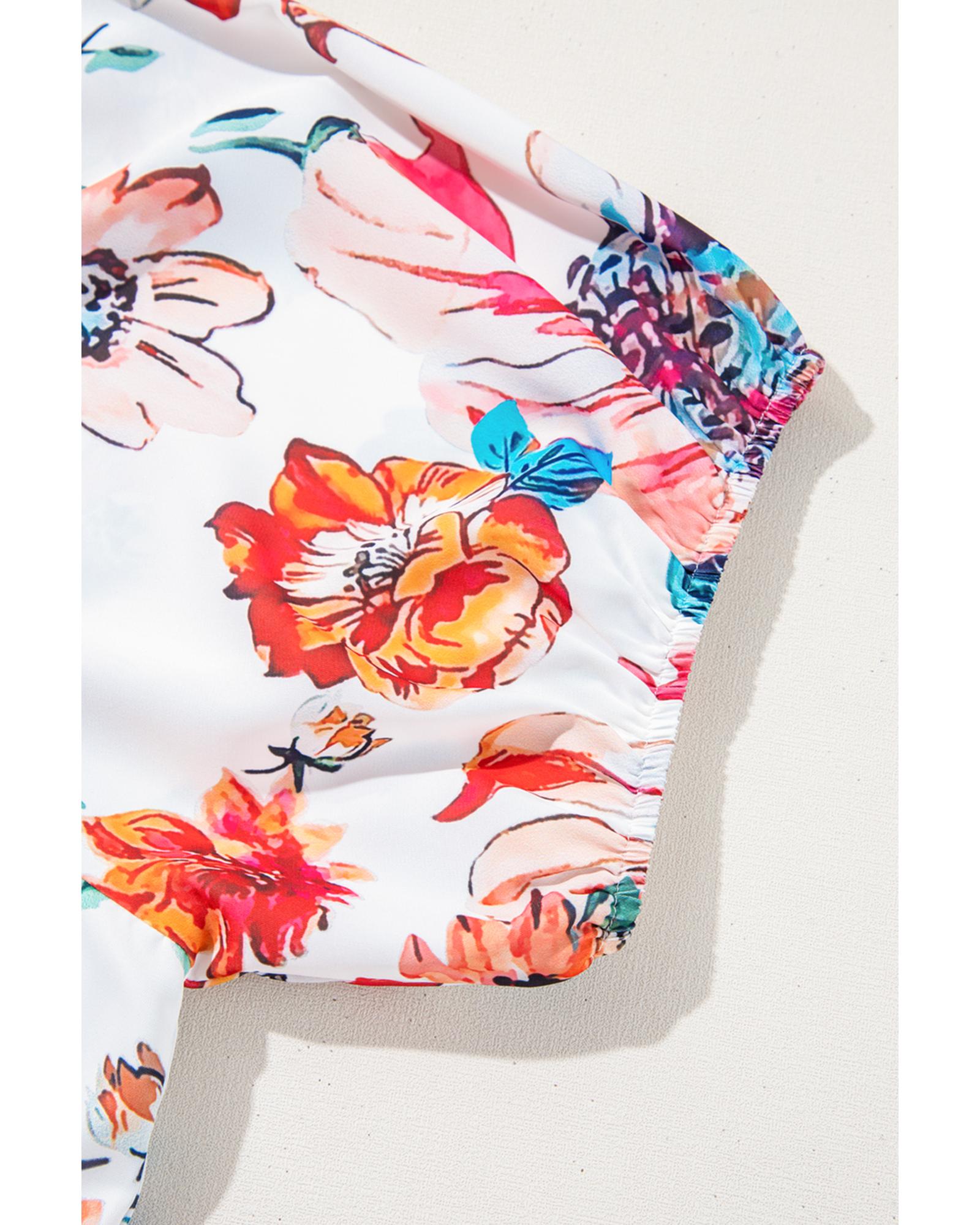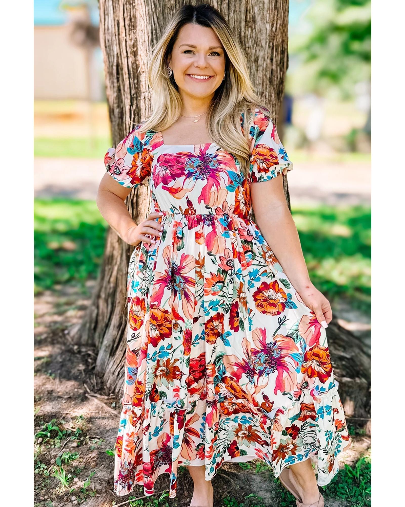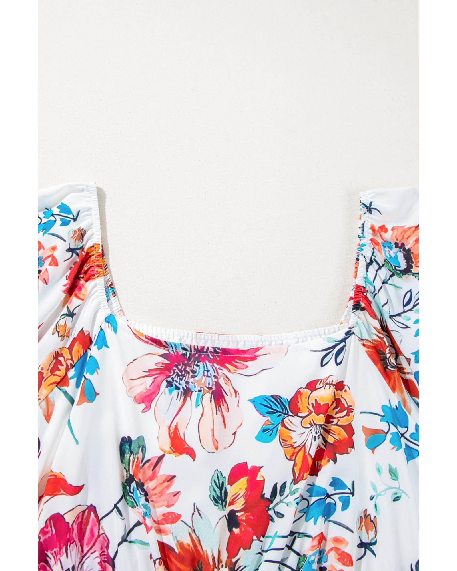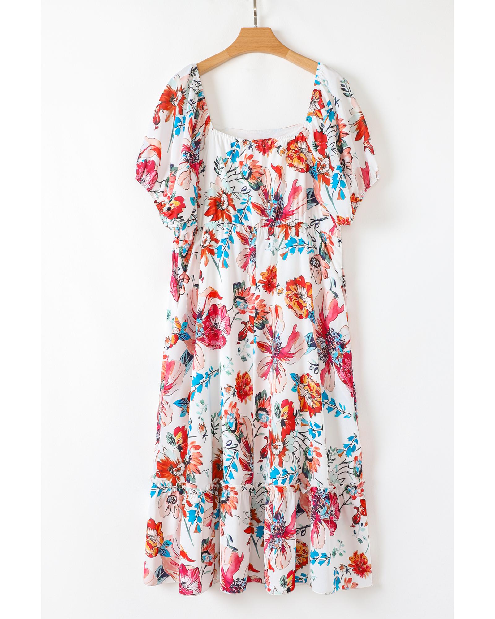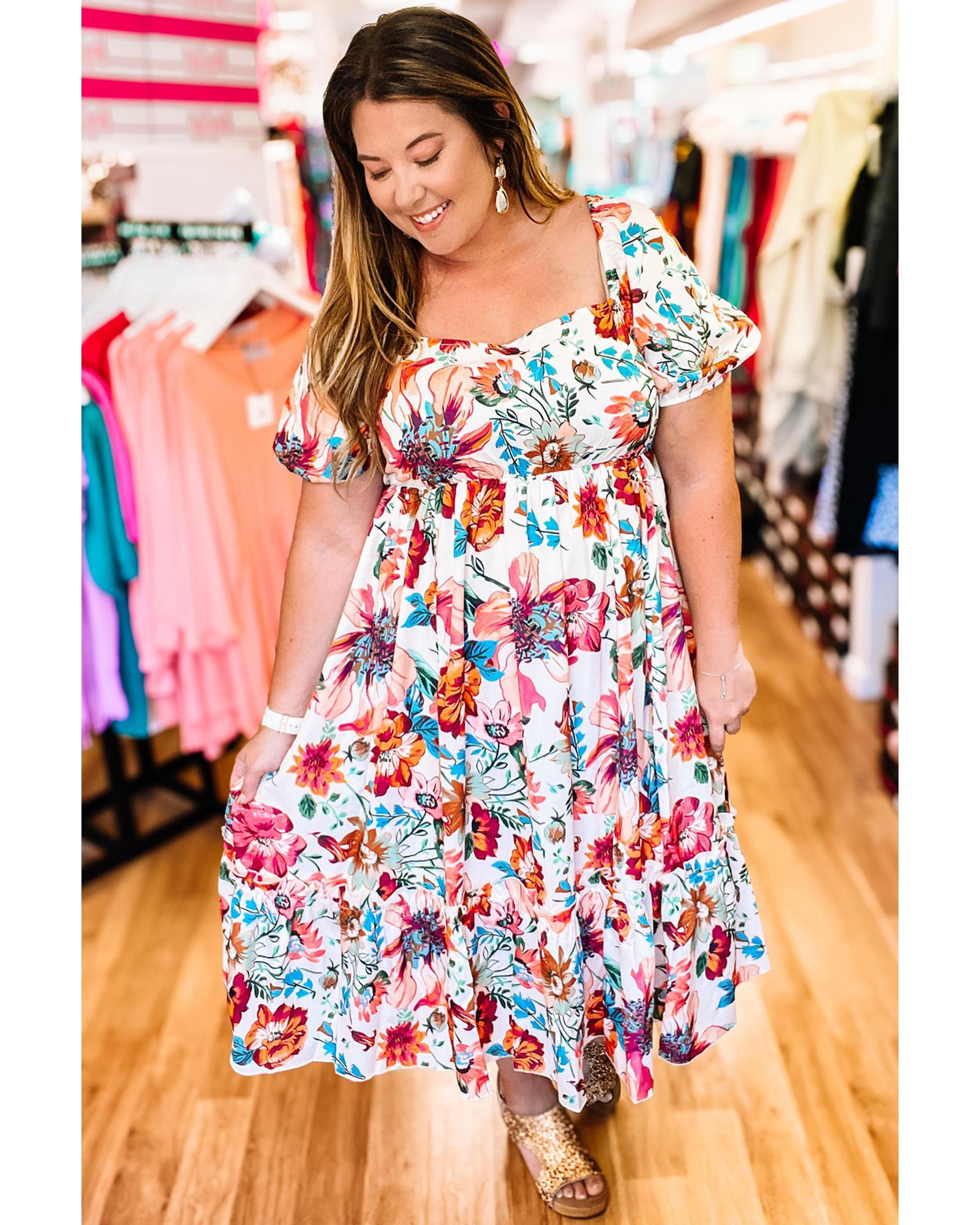 White Floral Square Neck Puff Sleeve Flowy Plus Size Midi Dress – 1X