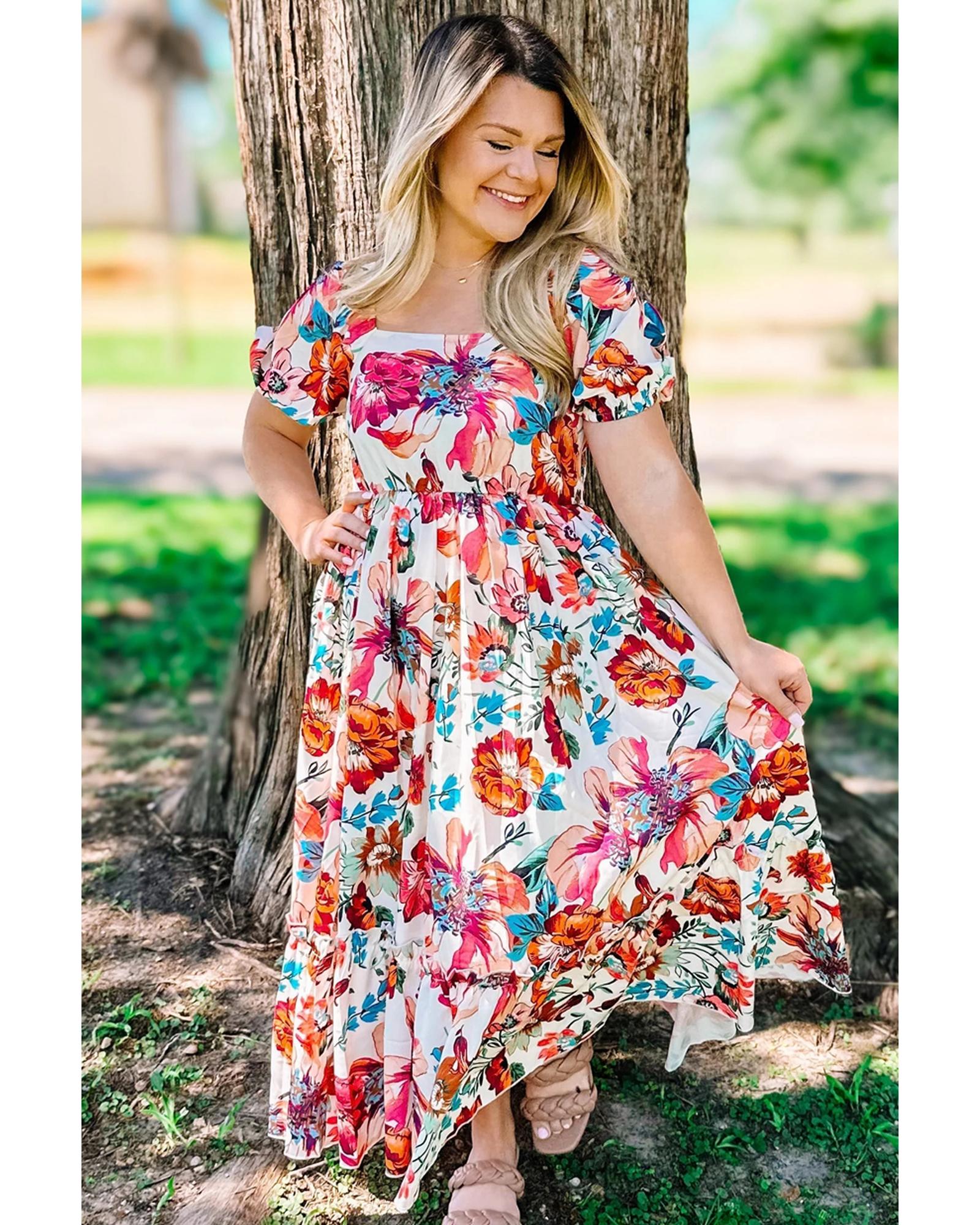 White Floral Square Neck Puff Sleeve Flowy Plus Size Midi Dress – 4X