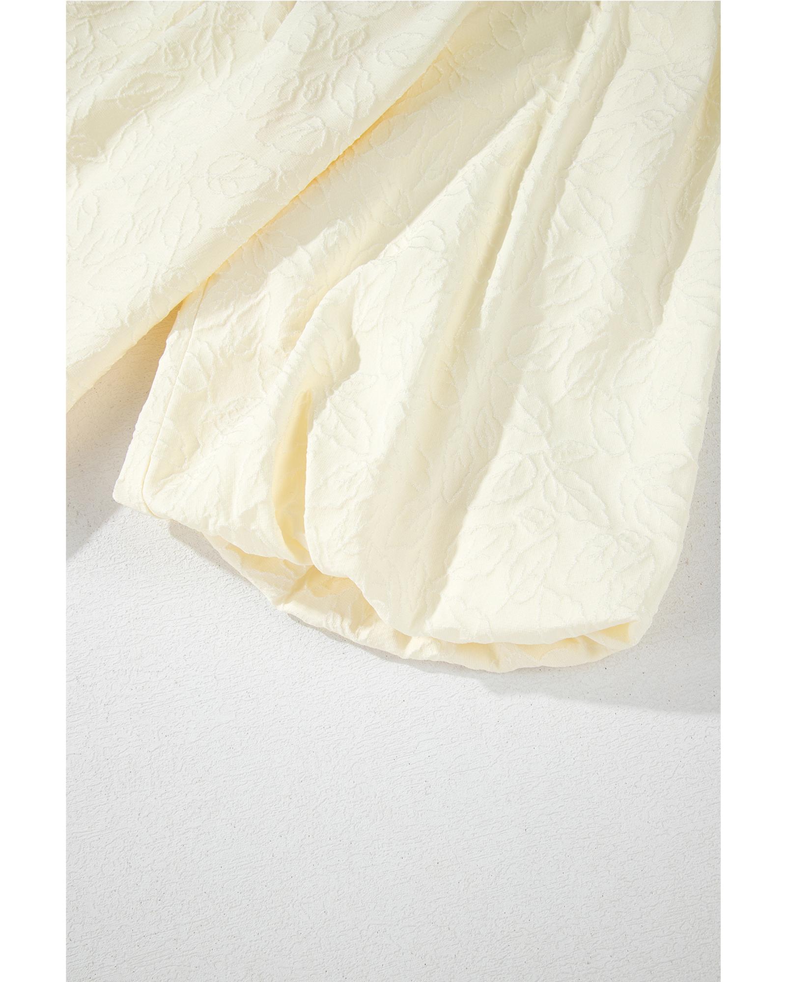 White Floral Textured Bubble Sleeve Frilled Notched Neck Dress – XL