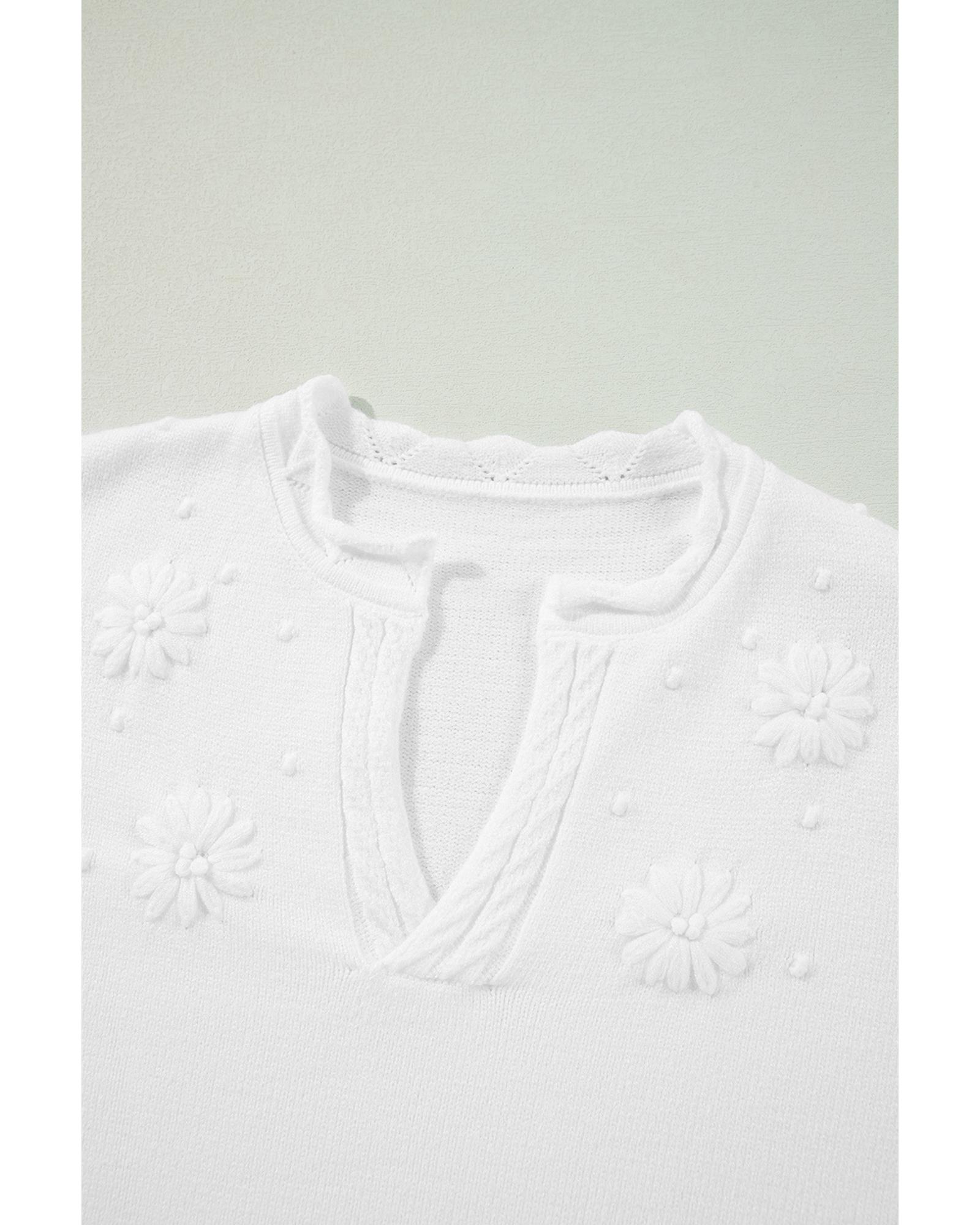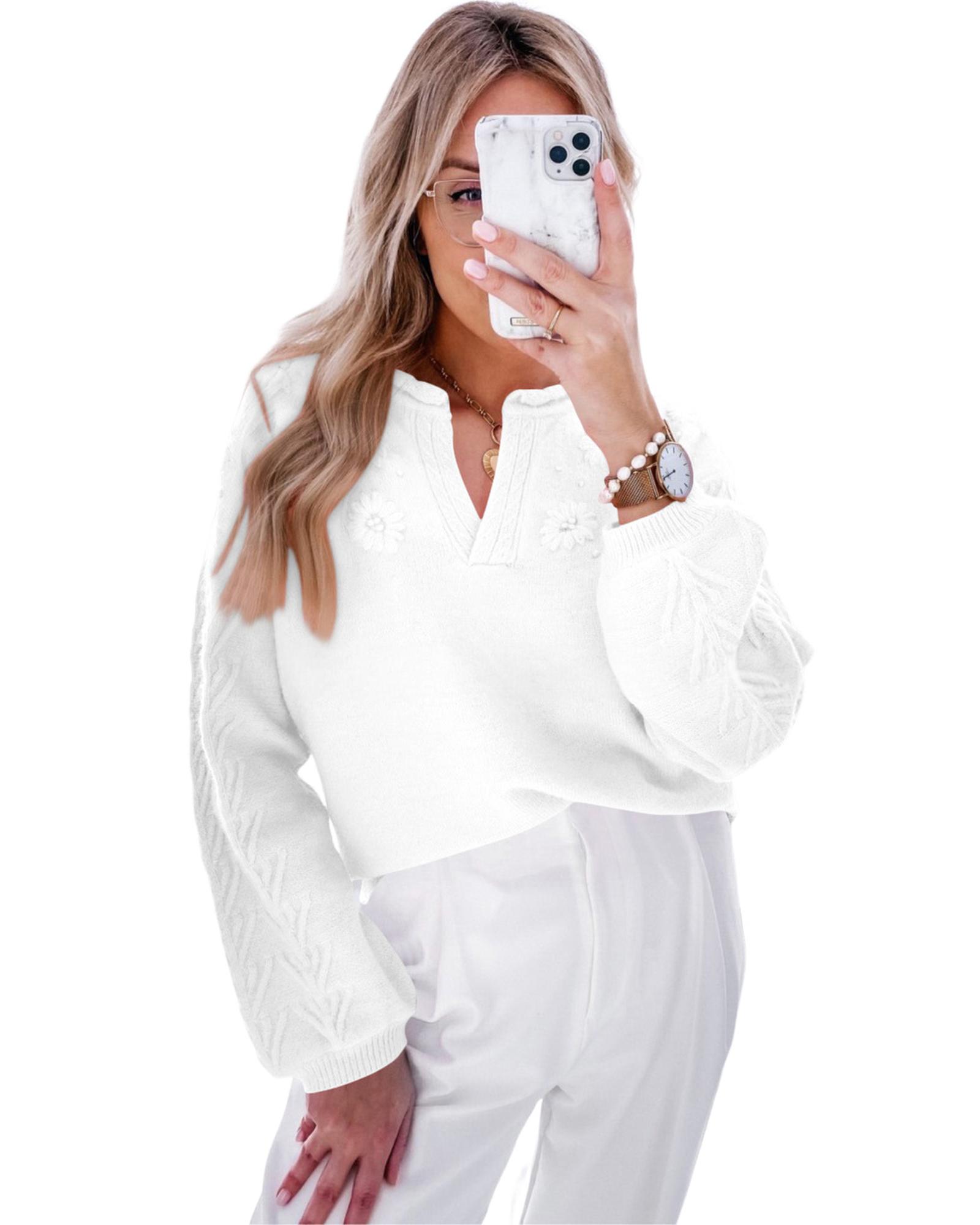 White Flower Detail Knitted Notched Neck Sweater – XL