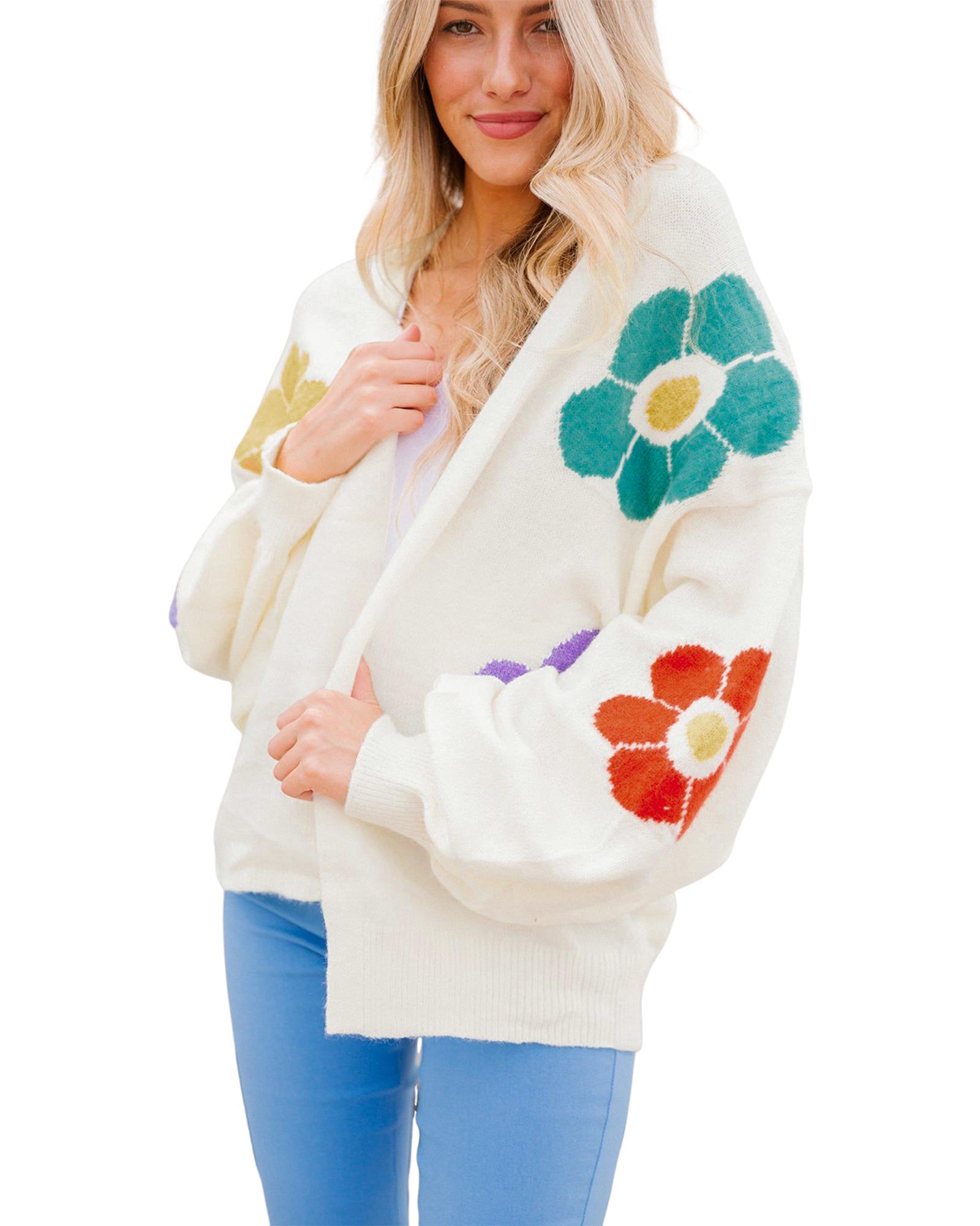 White Flower Jacquared Bubble Sleeve Open Cardigan – L