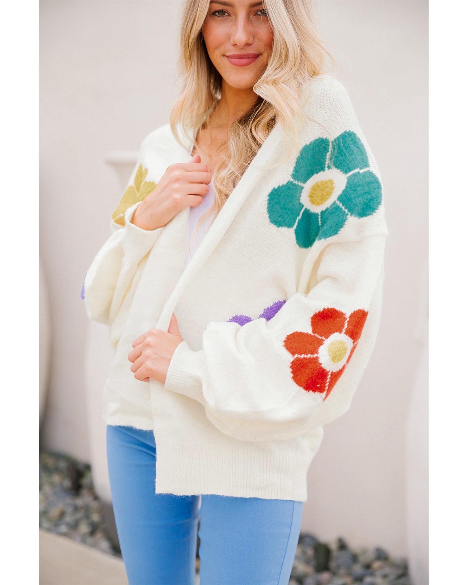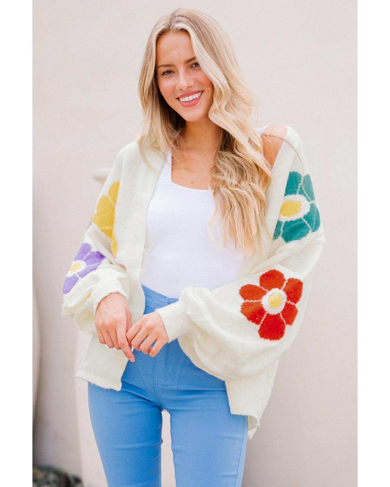 White Flower Jacquared Bubble Sleeve Open Cardigan – M