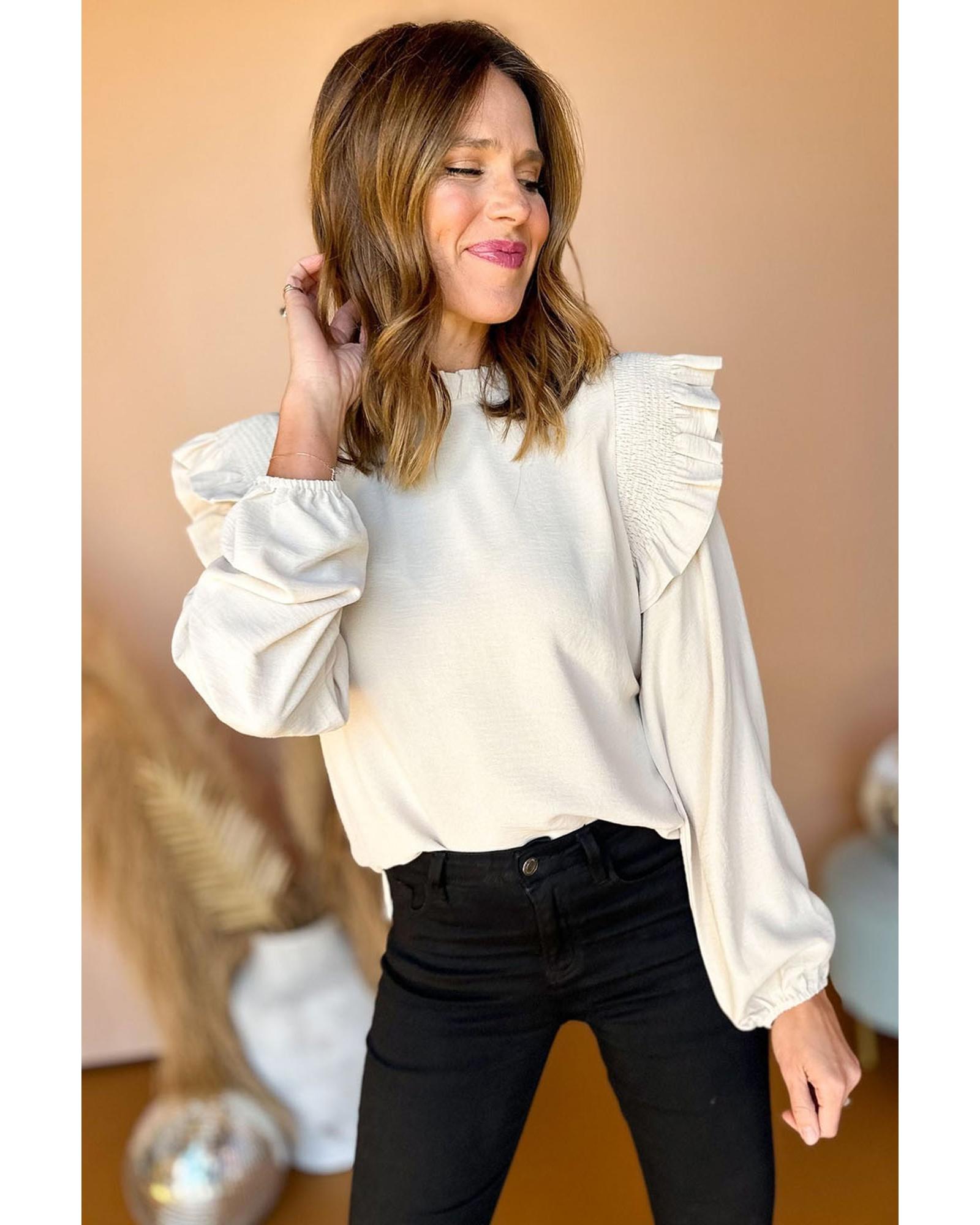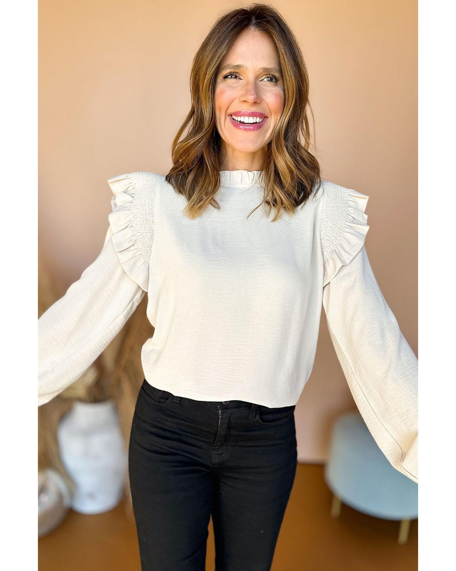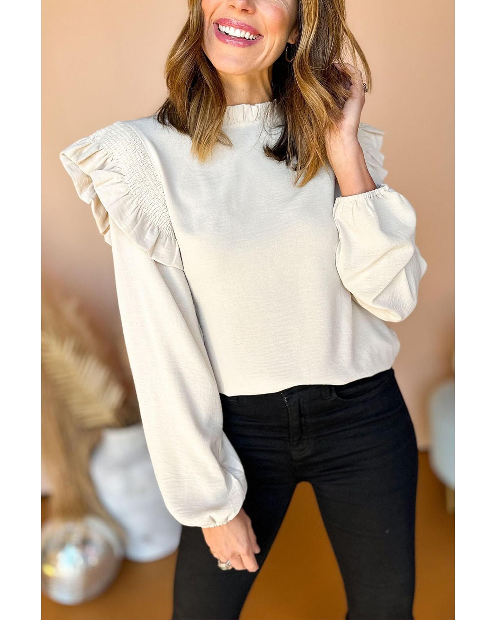 White Frilled Neck Ruffled Trim Bubble Sleeve Blouse – S