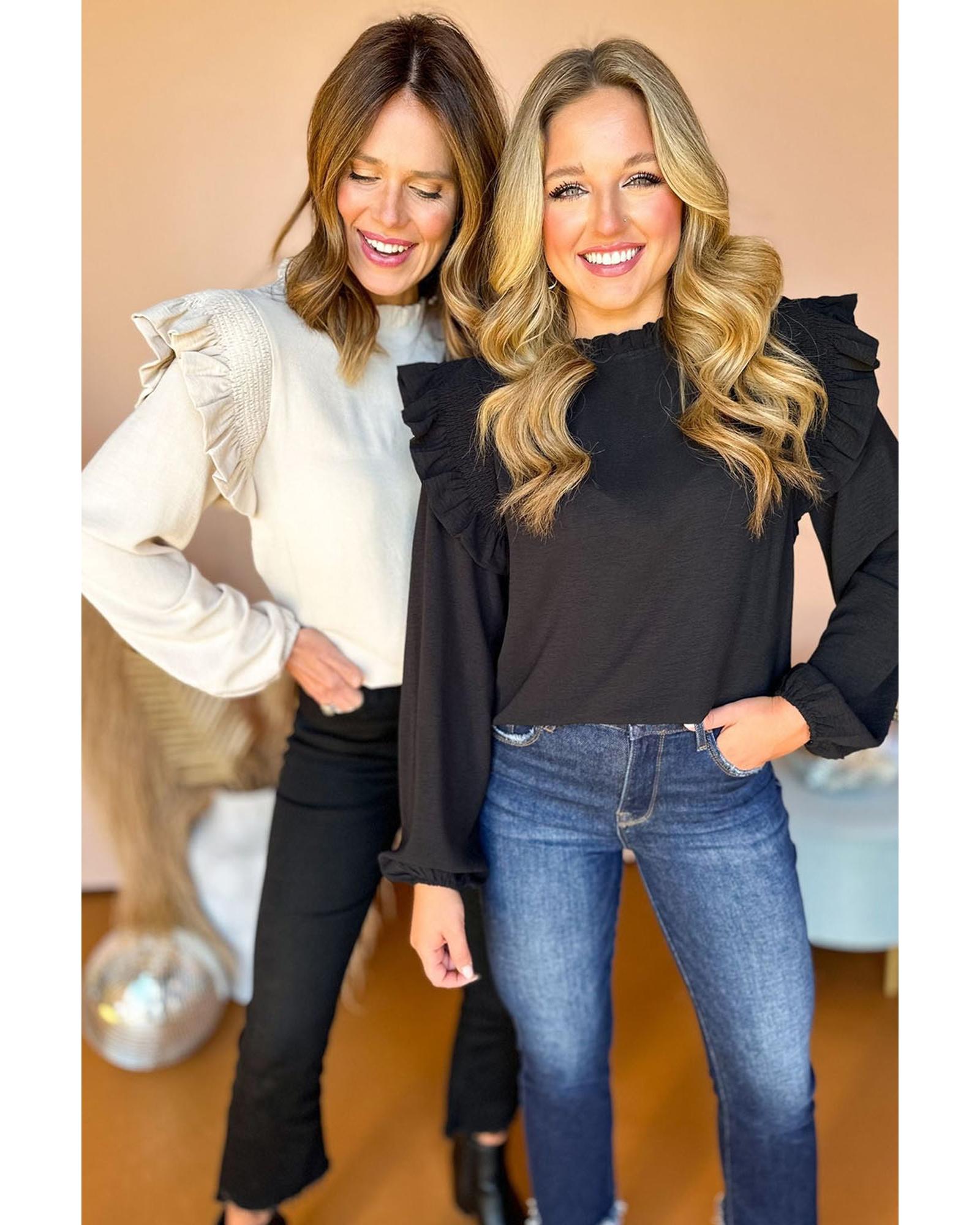 White Frilled Neck Ruffled Trim Bubble Sleeve Blouse – XL